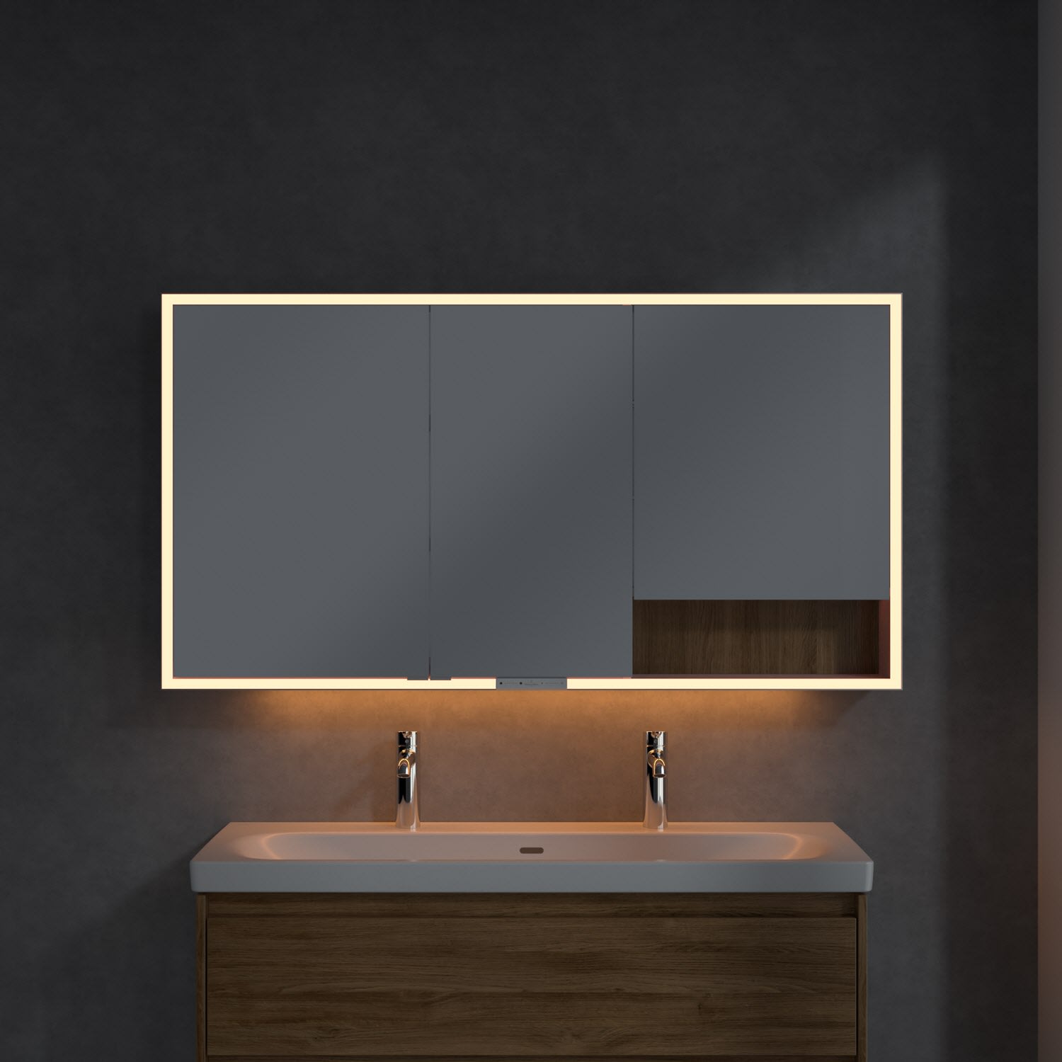 Das umlaufende LED-Lichtband sorgt für eine gleichmäßige Ausleuchtung, die integrierte Waschtischbeleuchtung und die beleuchteten offenen Fächer schaffen ein stimmungsvolles Ambiente. Helligkeit und Farbtemperatur lassen sich bequem per Sensor oder Smart-Home-Steuerung einstellen. Filigrane Griffe ermöglichen ein bequemes Öffnen der Türen ohne Fingerabdrücke, eine innenliegende Doppelsteckdose bietet zusätzliche Funktionalität.