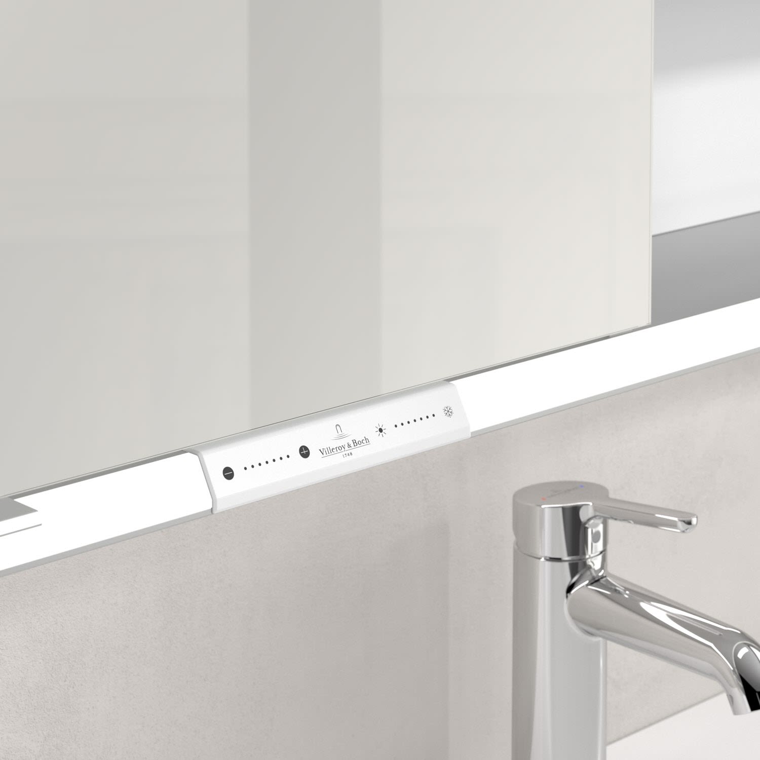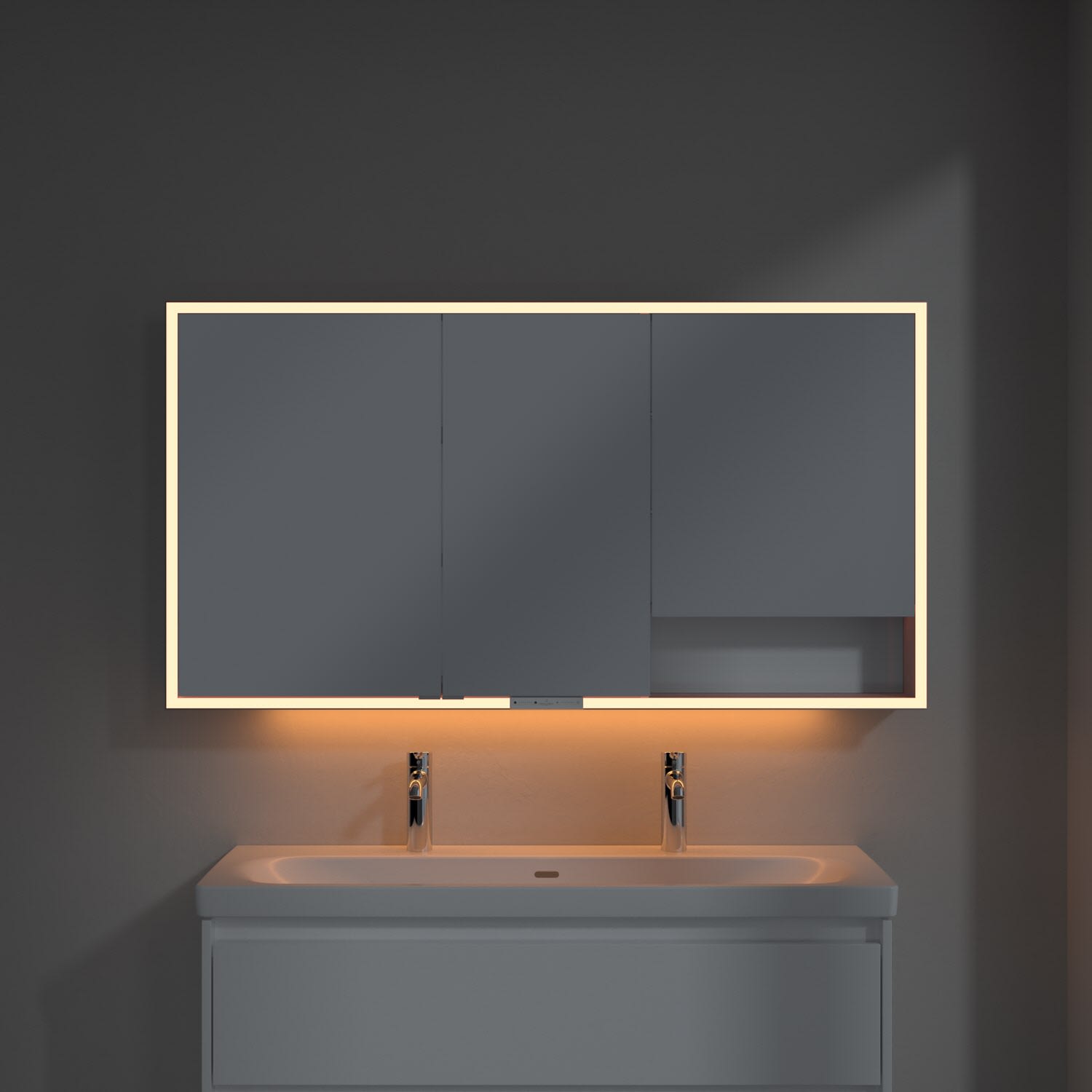 Das umlaufende LED-Lichtband sorgt für eine gleichmäßige Ausleuchtung, die integrierte Waschtischbeleuchtung und die beleuchteten offenen Fächer schaffen ein stimmungsvolles Ambiente. Helligkeit und Farbtemperatur lassen sich bequem per Sensor oder Smart-Home-Steuerung einstellen. Filigrane Griffe ermöglichen ein bequemes Öffnen der Türen ohne Fingerabdrücke, eine innenliegende Doppelsteckdose bietet zusätzliche Funktionalität.