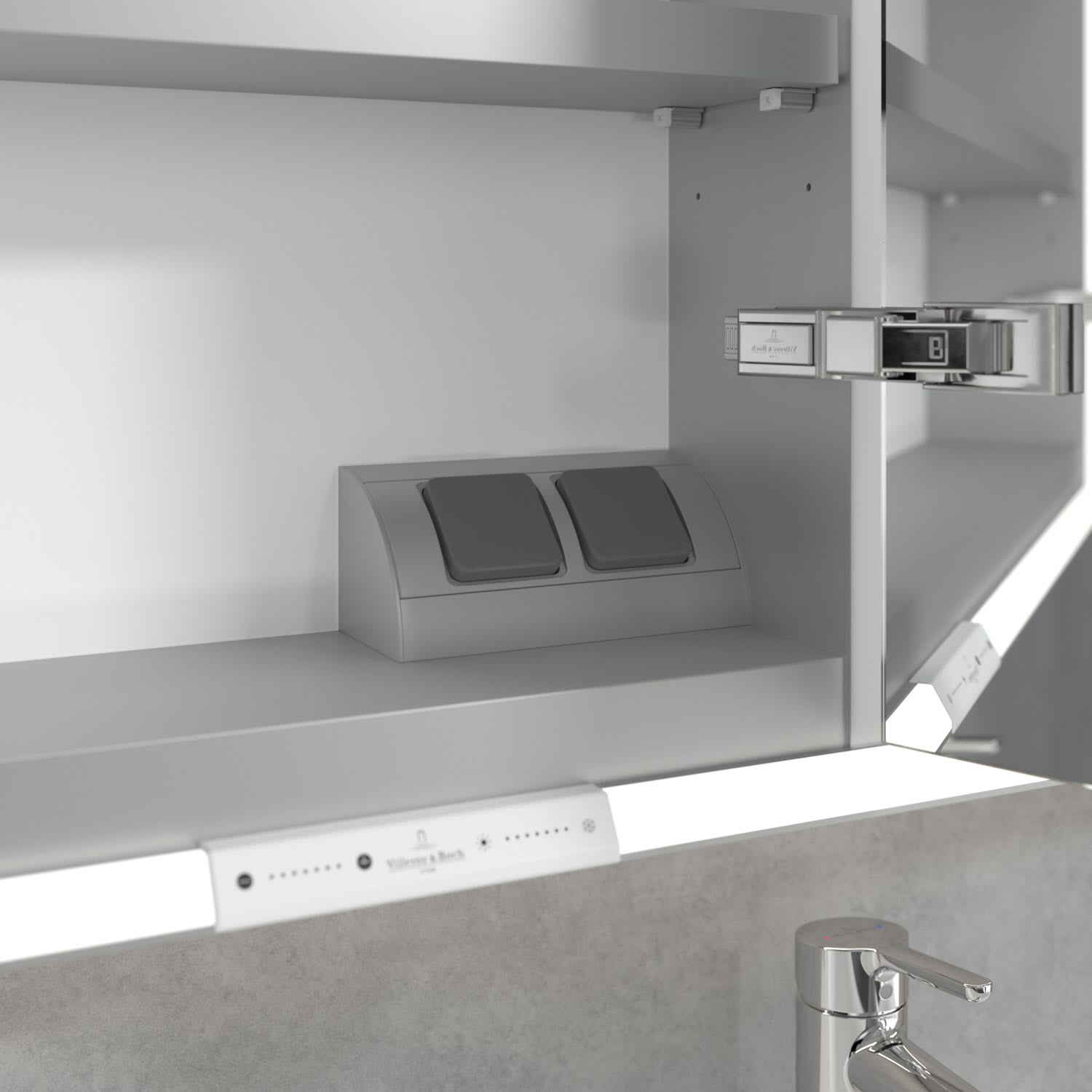 Das umlaufende LED-Lichtband sorgt für eine gleichmäßige Ausleuchtung, die integrierte Waschtischbeleuchtung und die beleuchteten offenen Fächer schaffen ein stimmungsvolles Ambiente. Helligkeit und Farbtemperatur lassen sich bequem per Sensor oder Smart-Home-Steuerung einstellen. Filigrane Griffe ermöglichen ein bequemes Öffnen der Türen ohne Fingerabdrücke, eine innenliegende Doppelsteckdose bietet zusätzliche Funktionalität.