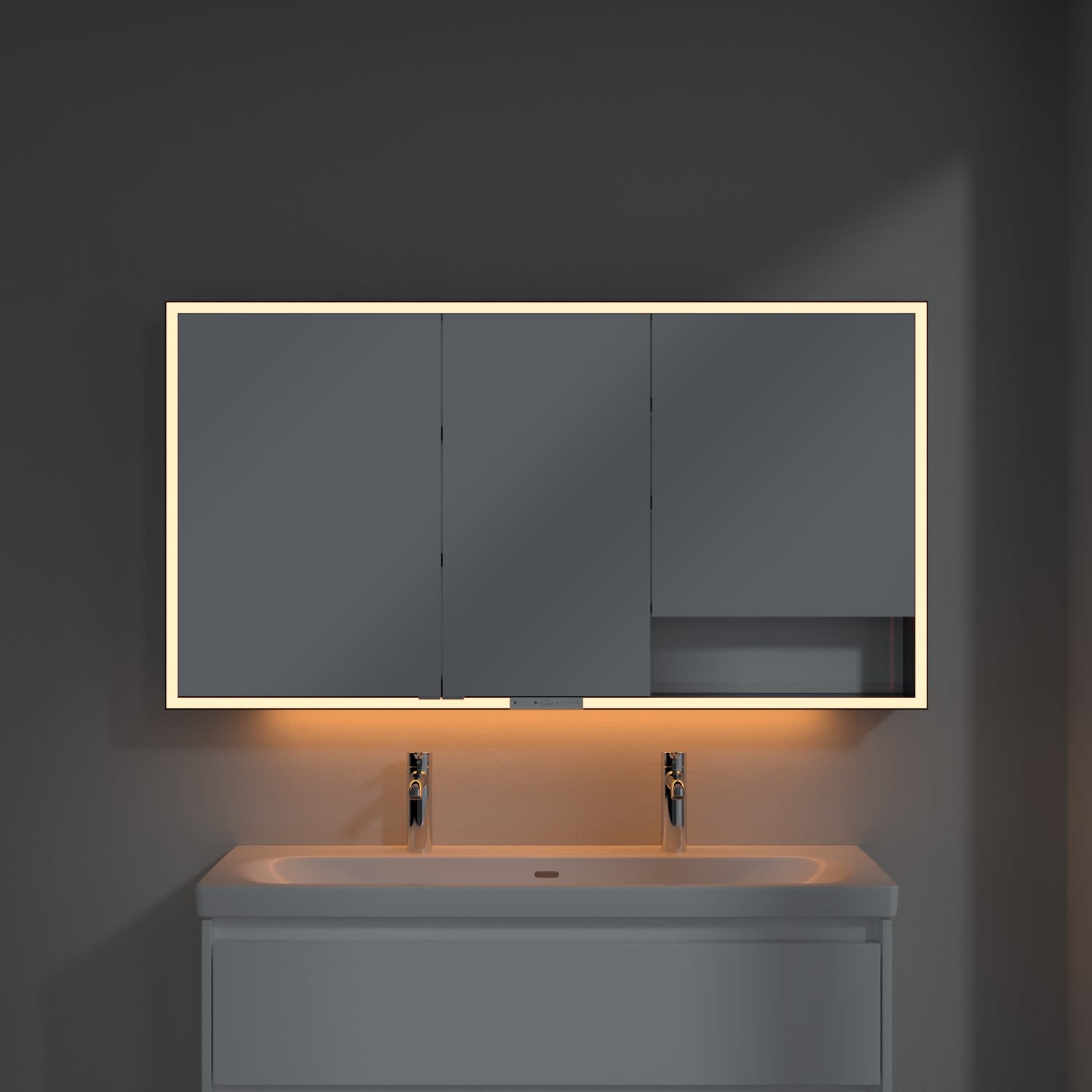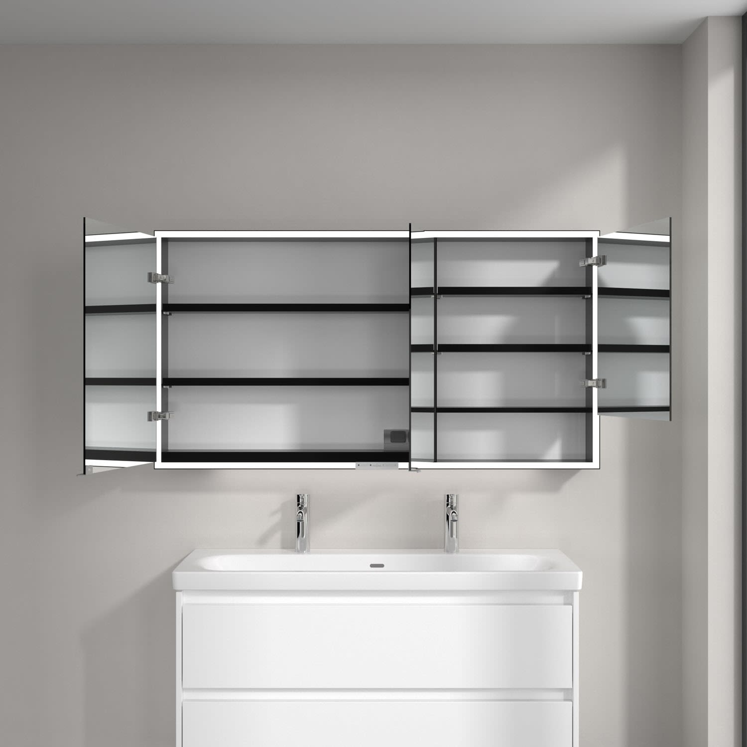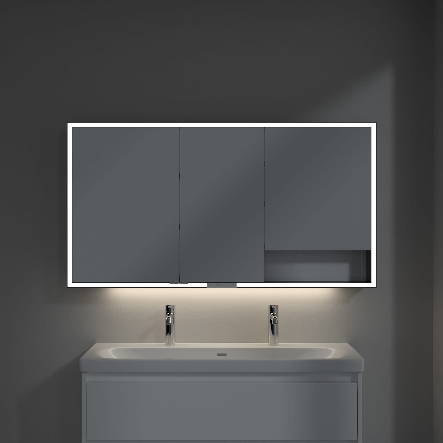 Das umlaufende LED-Lichtband sorgt für eine gleichmäßige Ausleuchtung, die integrierte Waschtischbeleuchtung und die beleuchteten offenen Fächer schaffen ein stimmungsvolles Ambiente. Helligkeit und Farbtemperatur lassen sich bequem per Sensor oder Smart-Home-Steuerung einstellen. Filigrane Griffe ermöglichen ein bequemes Öffnen der Türen ohne Fingerabdrücke, eine innenliegende Doppelsteckdose bietet zusätzliche Funktionalität.