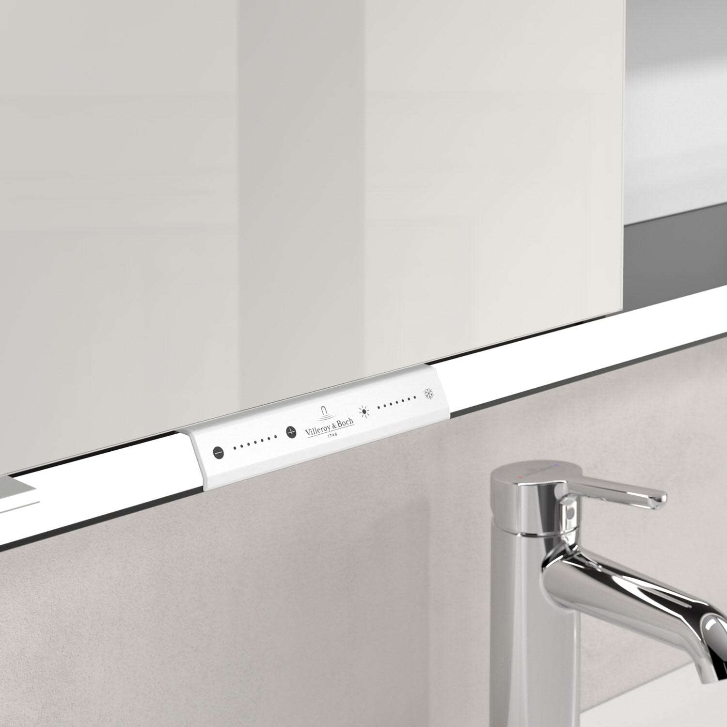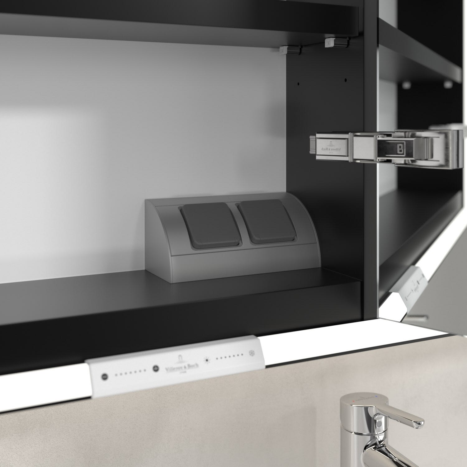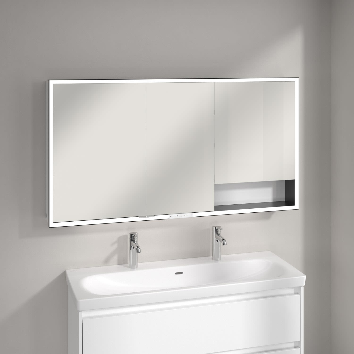 Das umlaufende LED-Lichtband sorgt für eine gleichmäßige Ausleuchtung, die integrierte Waschtischbeleuchtung und die beleuchteten offenen Fächer schaffen ein stimmungsvolles Ambiente. Helligkeit und Farbtemperatur lassen sich bequem per Sensor oder Smart-Home-Steuerung einstellen. Filigrane Griffe ermöglichen ein bequemes Öffnen der Türen ohne Fingerabdrücke, eine innenliegende Doppelsteckdose bietet zusätzliche Funktionalität.