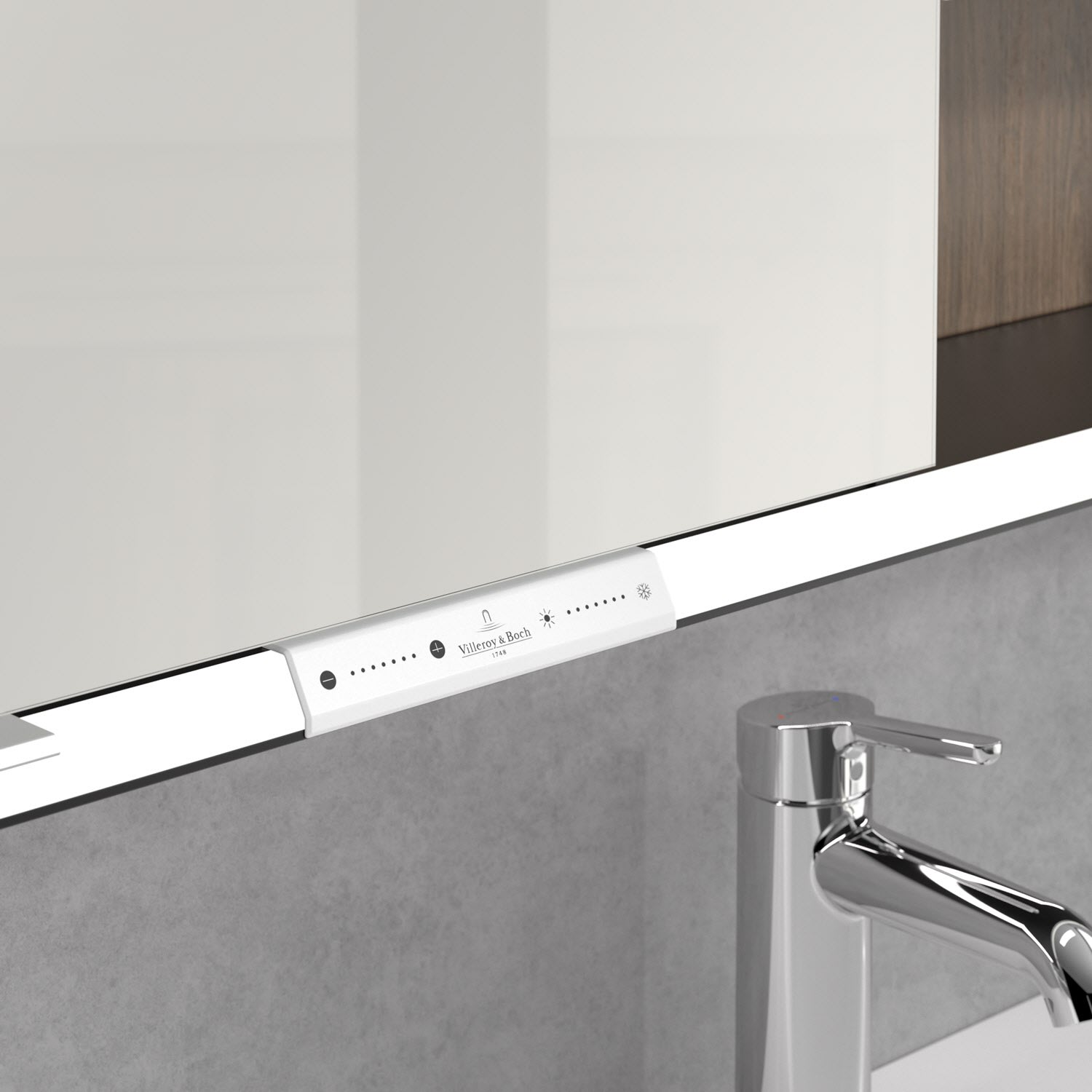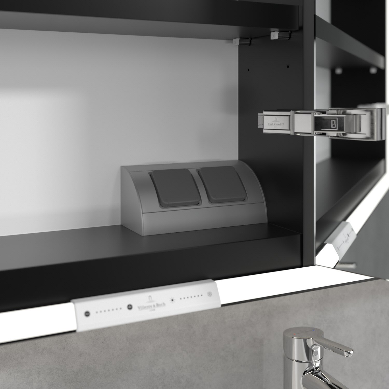 Das umlaufende LED-Lichtband sorgt für eine gleichmäßige Ausleuchtung, die integrierte Waschtischbeleuchtung und die beleuchteten offenen Fächer schaffen ein stimmungsvolles Ambiente. Helligkeit und Farbtemperatur lassen sich bequem per Sensor oder Smart-Home-Steuerung einstellen. Filigrane Griffe ermöglichen ein bequemes Öffnen der Türen ohne Fingerabdrücke, eine innenliegende Doppelsteckdose bietet zusätzliche Funktionalität.