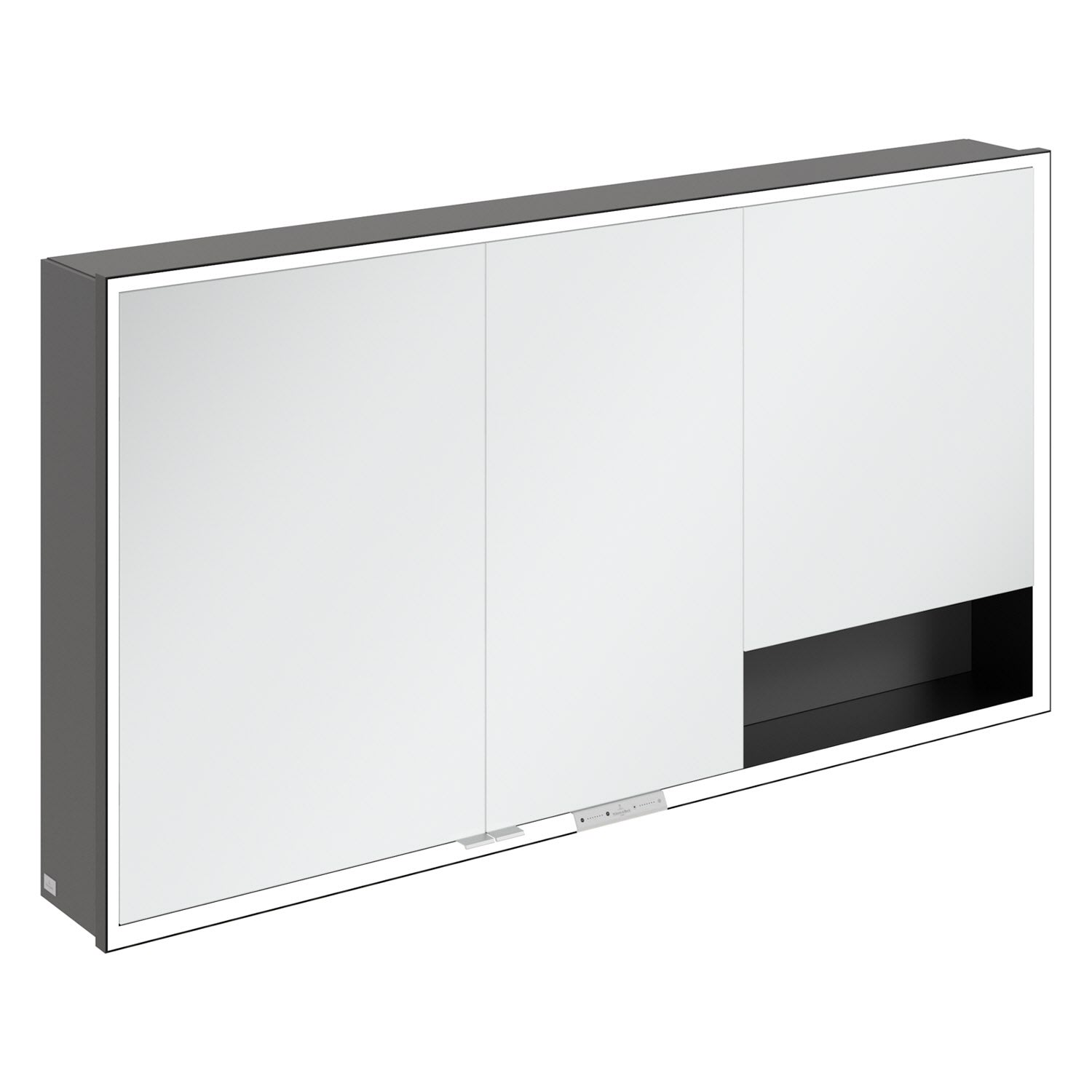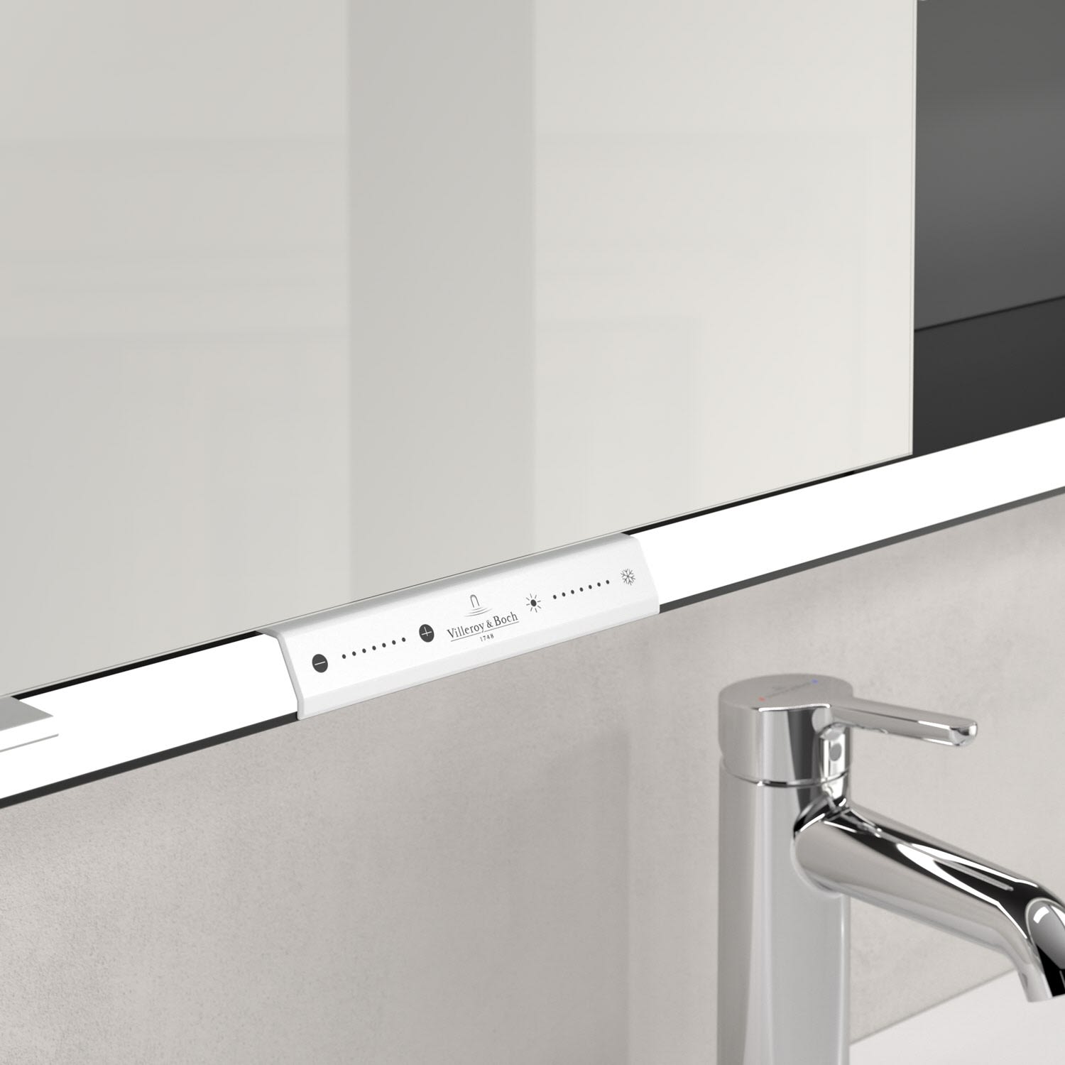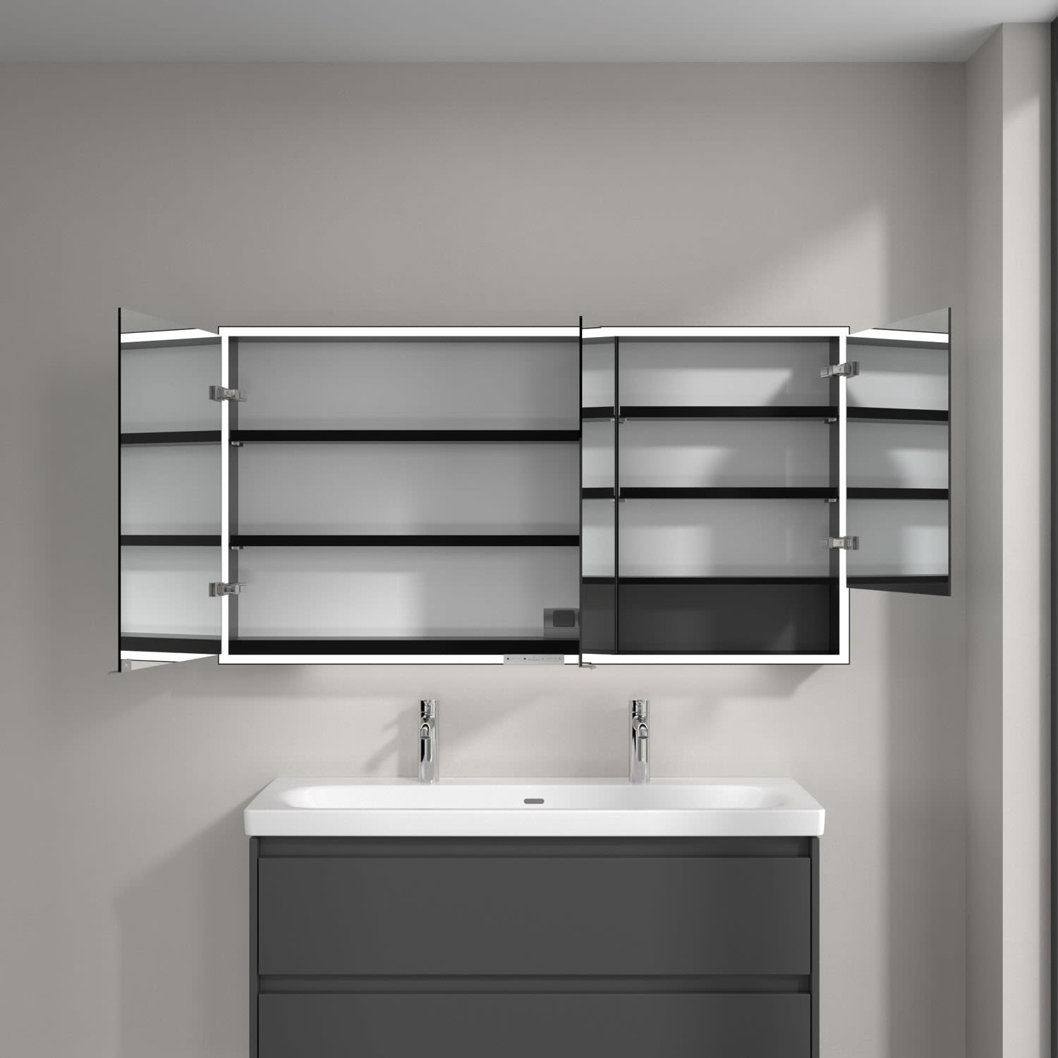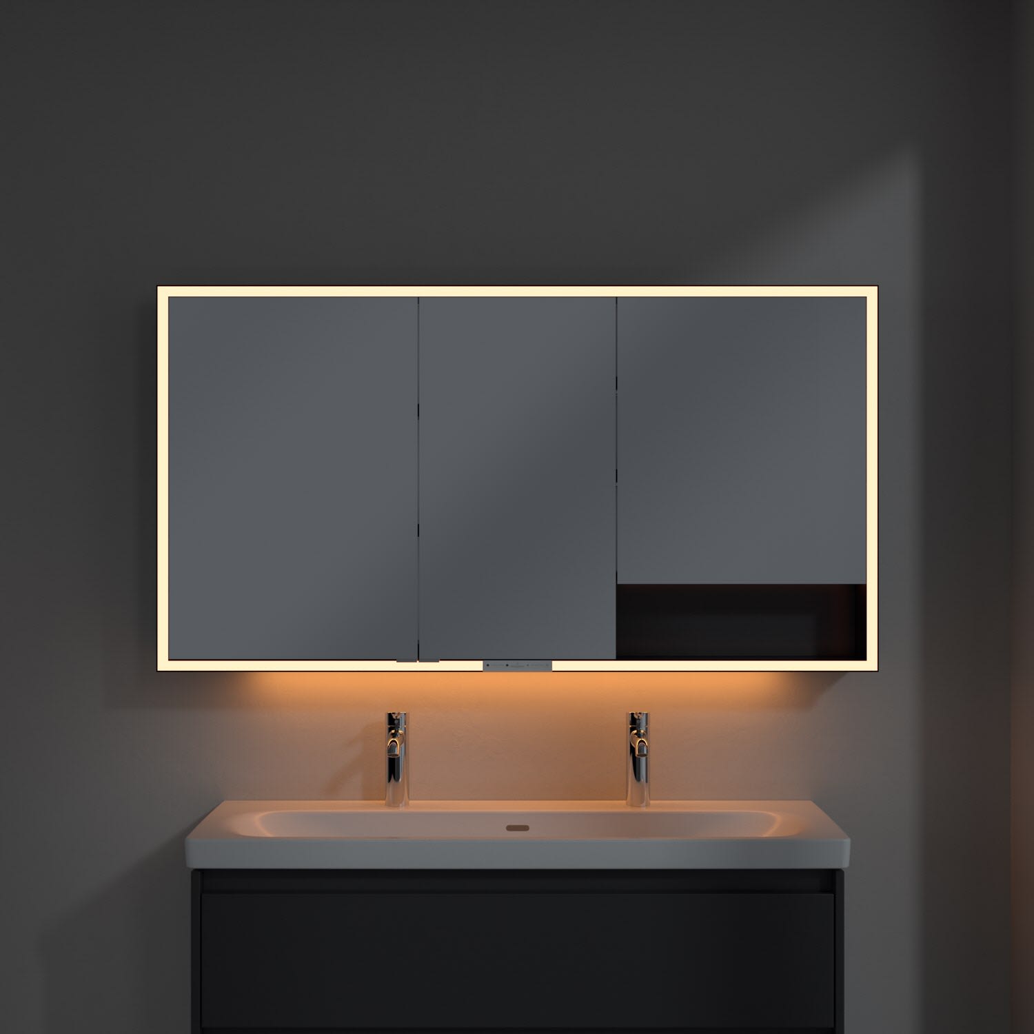 Das umlaufende LED-Lichtband sorgt für eine gleichmäßige Ausleuchtung, die integrierte Waschtischbeleuchtung und die beleuchteten offenen Fächer schaffen ein stimmungsvolles Ambiente. Helligkeit und Farbtemperatur lassen sich bequem per Sensor oder Smart-Home-Steuerung einstellen. Filigrane Griffe ermöglichen ein bequemes Öffnen der Türen ohne Fingerabdrücke, eine innenliegende Doppelsteckdose bietet zusätzliche Funktionalität.