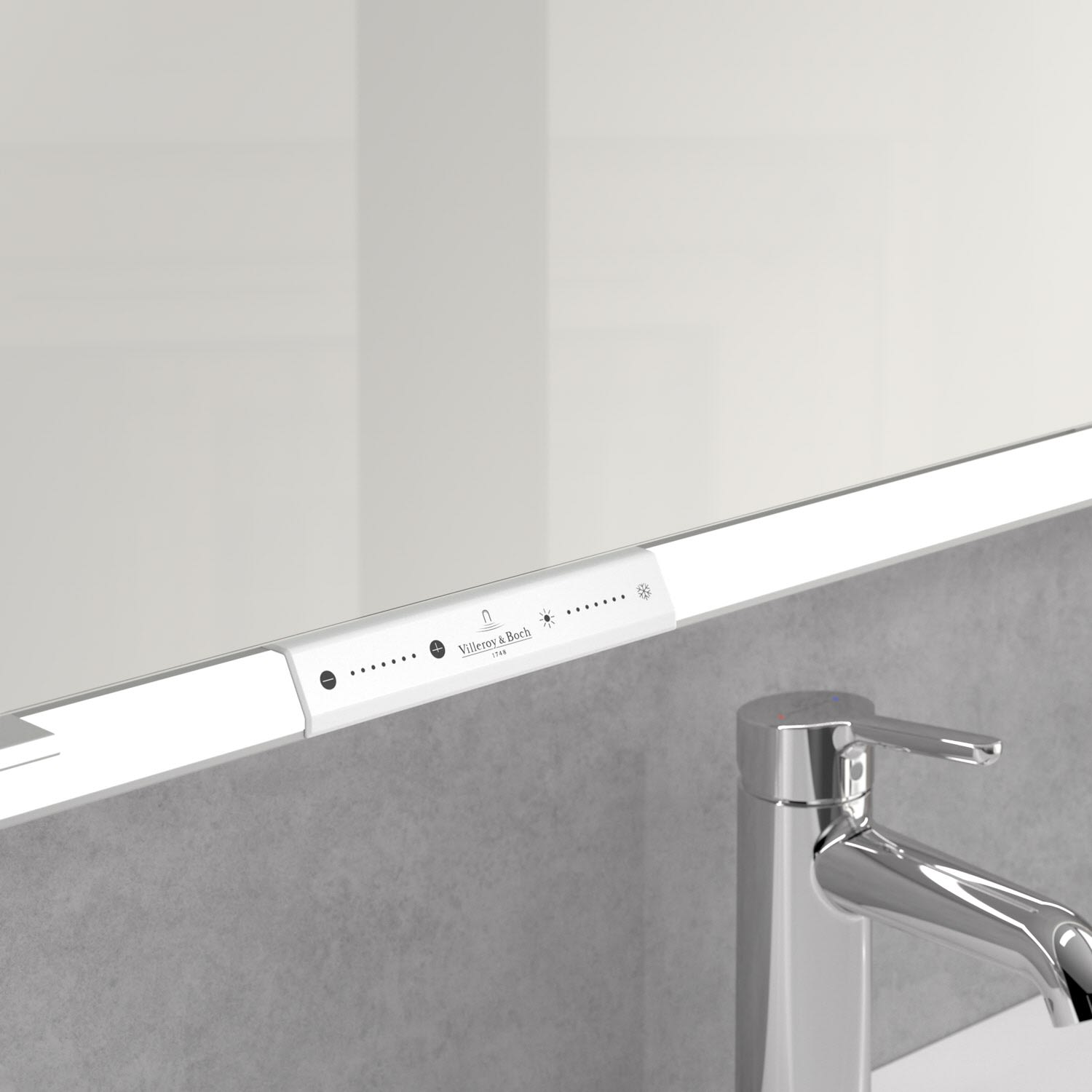 Das umlaufende LED-Lichtband sorgt für eine gleichmäßige Ausleuchtung, die integrierte Waschtischbeleuchtung und die beleuchteten offenen Fächer schaffen ein stimmungsvolles Ambiente. Helligkeit und Farbtemperatur lassen sich bequem per Sensor oder Smart-Home-Steuerung einstellen. Filigrane Griffe ermöglichen ein bequemes Öffnen der Türen ohne Fingerabdrücke, eine innenliegende Doppelsteckdose bietet zusätzliche Funktionalität.