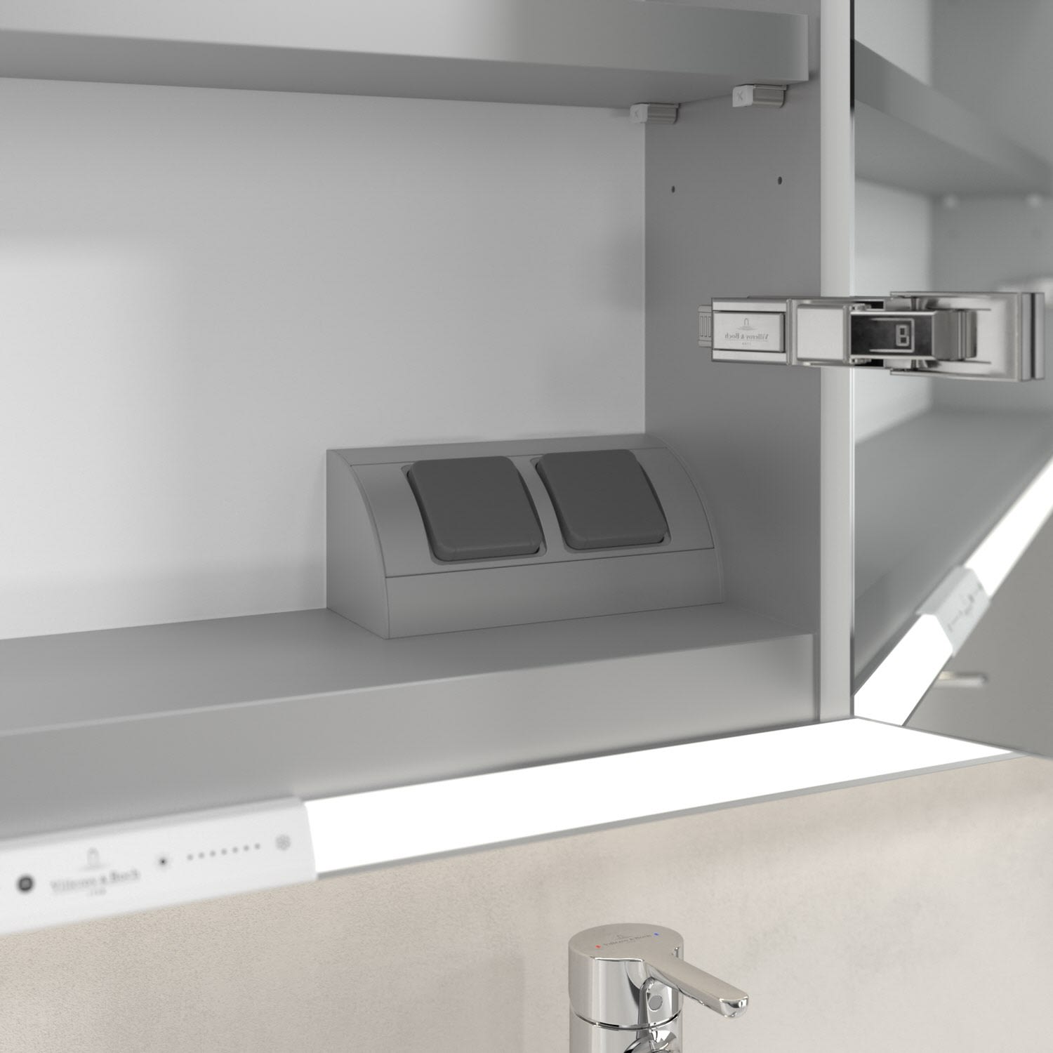 Das umlaufende LED-Lichtband sorgt für eine gleichmäßige Ausleuchtung, die integrierte Waschtischbeleuchtung und die beleuchteten offenen Fächer schaffen ein stimmungsvolles Ambiente. Helligkeit und Farbtemperatur lassen sich bequem per Sensor oder Smart-Home-Steuerung einstellen. Filigrane Griffe ermöglichen ein bequemes Öffnen der Türen ohne Fingerabdrücke, eine innenliegende Doppelsteckdose bietet zusätzliche Funktionalität.