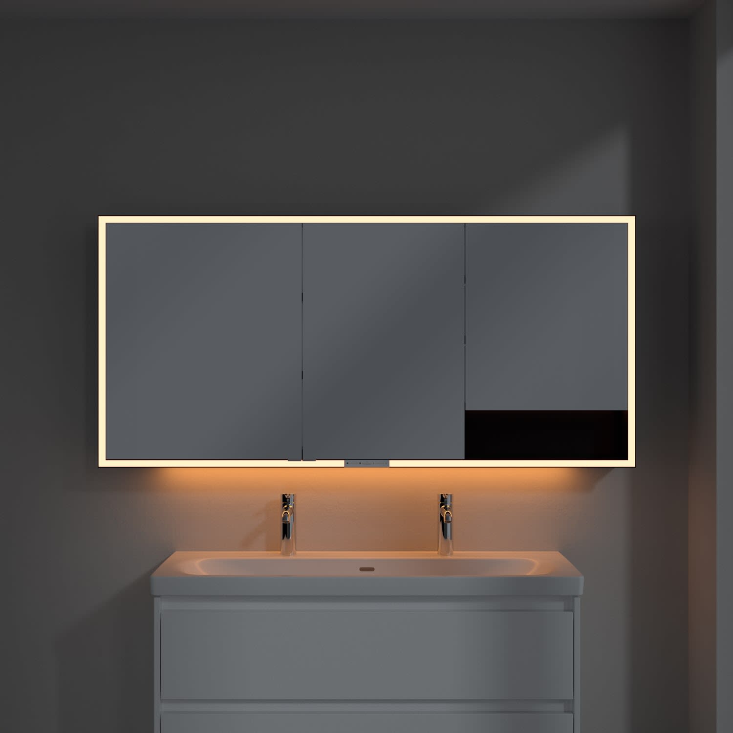 Das umlaufende LED-Lichtband sorgt für eine gleichmäßige Ausleuchtung, die integrierte Waschtischbeleuchtung und die beleuchteten offenen Fächer schaffen ein stimmungsvolles Ambiente. Helligkeit und Farbtemperatur lassen sich bequem per Sensor oder Smart-Home-Steuerung einstellen. Filigrane Griffe ermöglichen ein bequemes Öffnen der Türen ohne Fingerabdrücke, eine innenliegende Doppelsteckdose bietet zusätzliche Funktionalität.