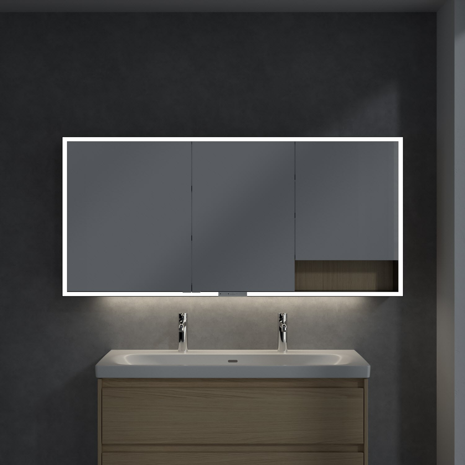 Das umlaufende LED-Lichtband sorgt für eine gleichmäßige Ausleuchtung, die integrierte Waschtischbeleuchtung und die beleuchteten offenen Fächer schaffen ein stimmungsvolles Ambiente. Helligkeit und Farbtemperatur lassen sich bequem per Sensor oder Smart-Home-Steuerung einstellen. Filigrane Griffe ermöglichen ein bequemes Öffnen der Türen ohne Fingerabdrücke, eine innenliegende Doppelsteckdose bietet zusätzliche Funktionalität.