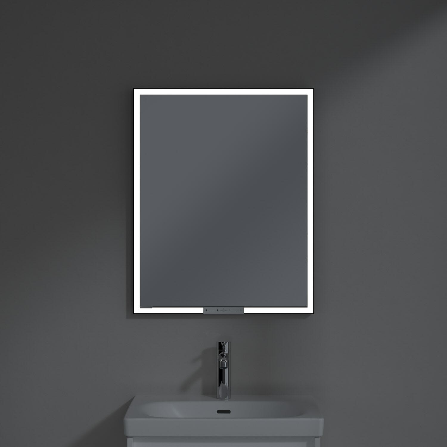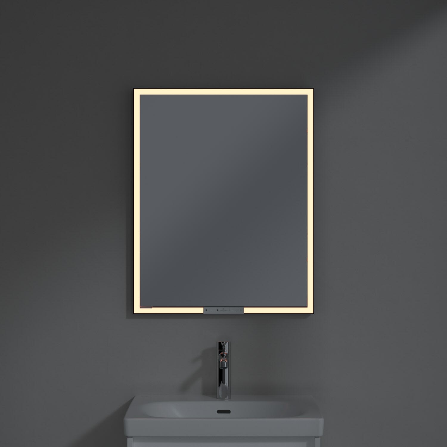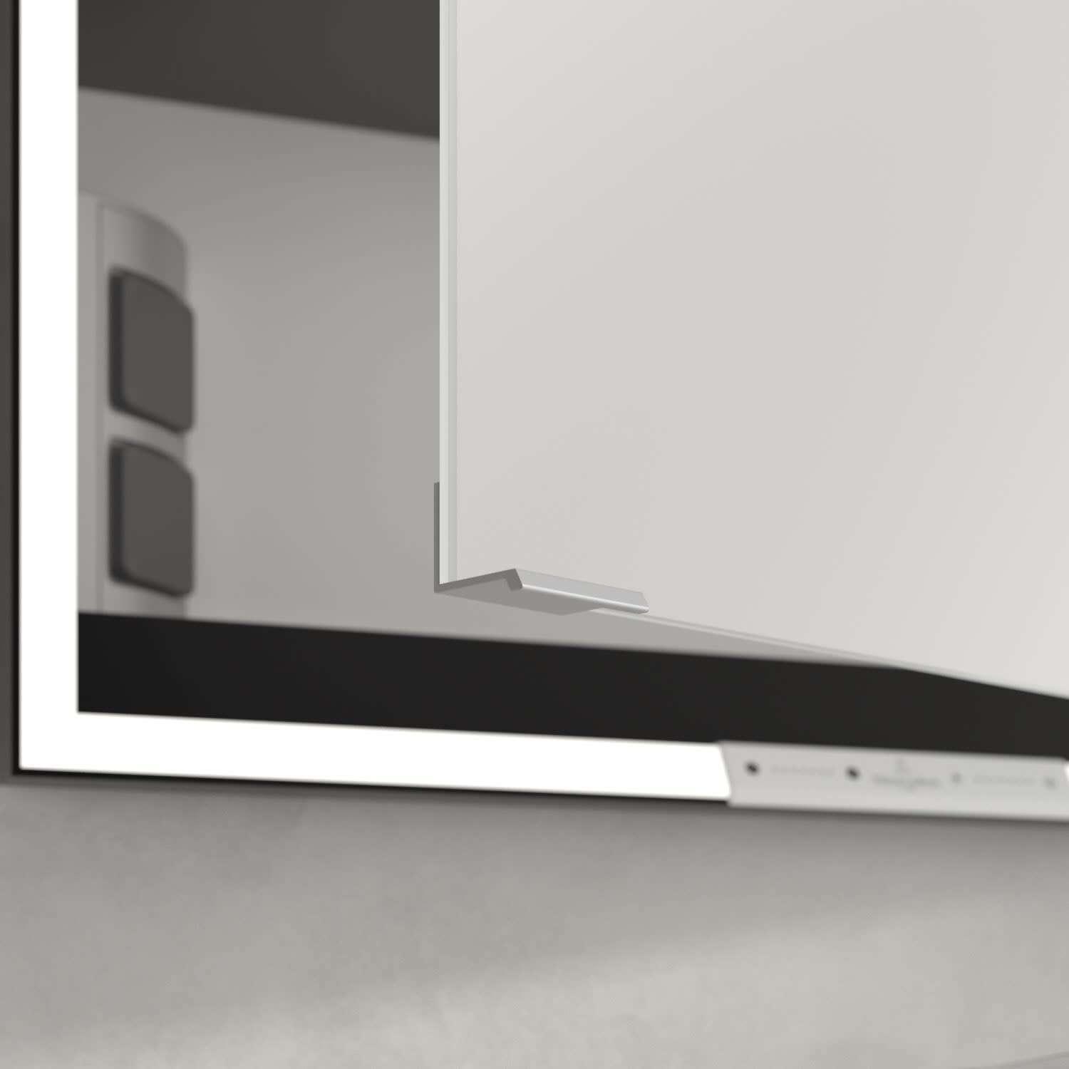 Das umlaufende LED-Lichtband bietet eine gleichmäßige Ausleuchtung, die integrierte Waschtischbeleuchtung und die beleuchteten offenen Fächer schaffen ein stimmungsvolles Ambiente. Helligkeit und Farbtemperatur lassen sich bequem per Sensor oder Smart-Home-Steuerung einstellen. Filigrane Griffe ermöglichen ein bequemes Öffnen der Türen ohne Fingerabdrücke, eine innenliegende Doppelsteckdose bietet zusätzliche Funktionalität.