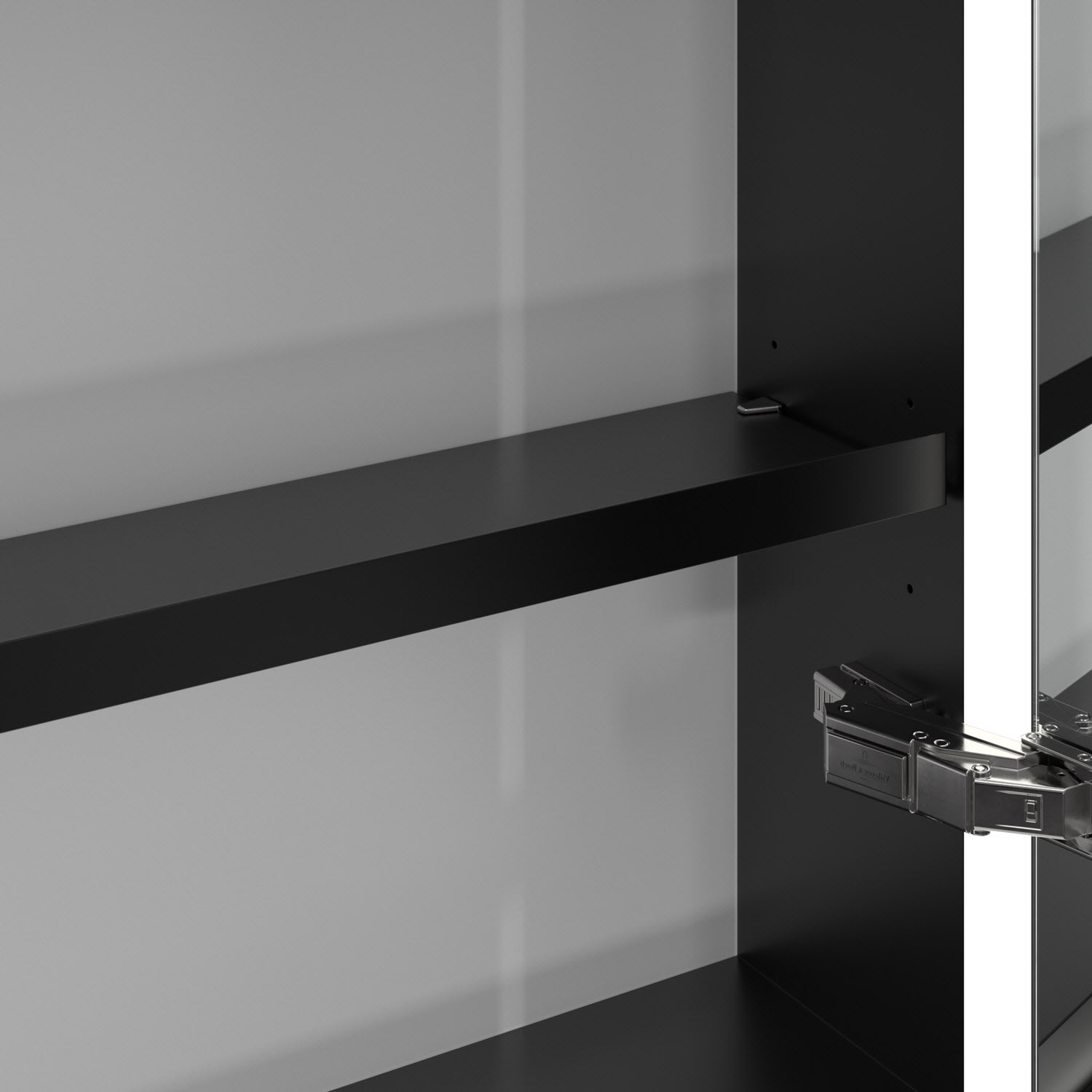 - praktische Extras: Aluminiumeinlegeböden mit praktischem Kippschutz, Vergrößerungsspiegel & Magnetleiste