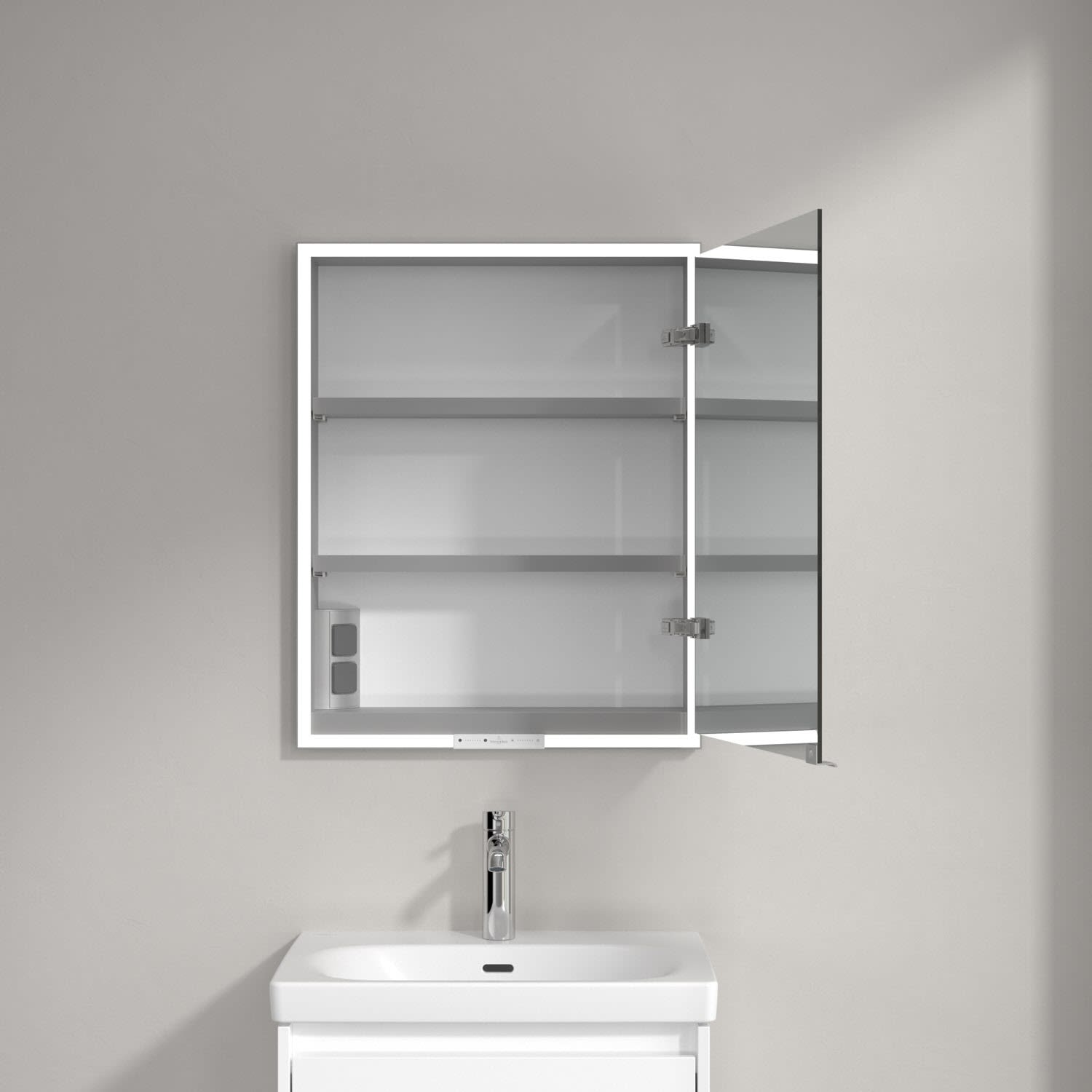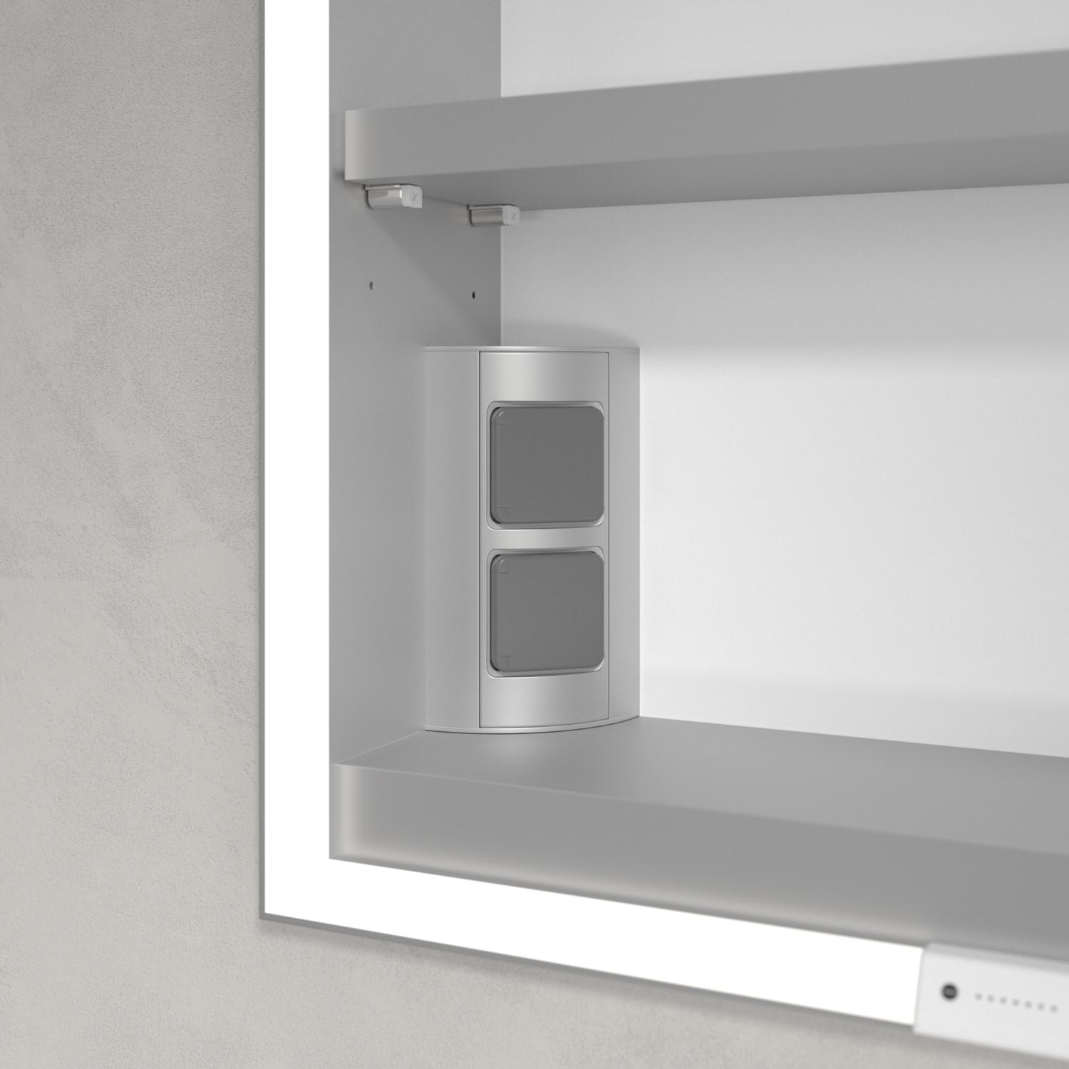 Das umlaufende LED-Lichtband bietet eine gleichmäßige Ausleuchtung, die integrierte Waschtischbeleuchtung und die beleuchteten offenen Fächer schaffen ein stimmungsvolles Ambiente. Helligkeit und Farbtemperatur lassen sich bequem per Sensor oder Smart-Home-Steuerung einstellen. Filigrane Griffe ermöglichen ein bequemes Öffnen der Türen ohne Fingerabdrücke, eine innenliegende Doppelsteckdose bietet zusätzliche Funktionalität.