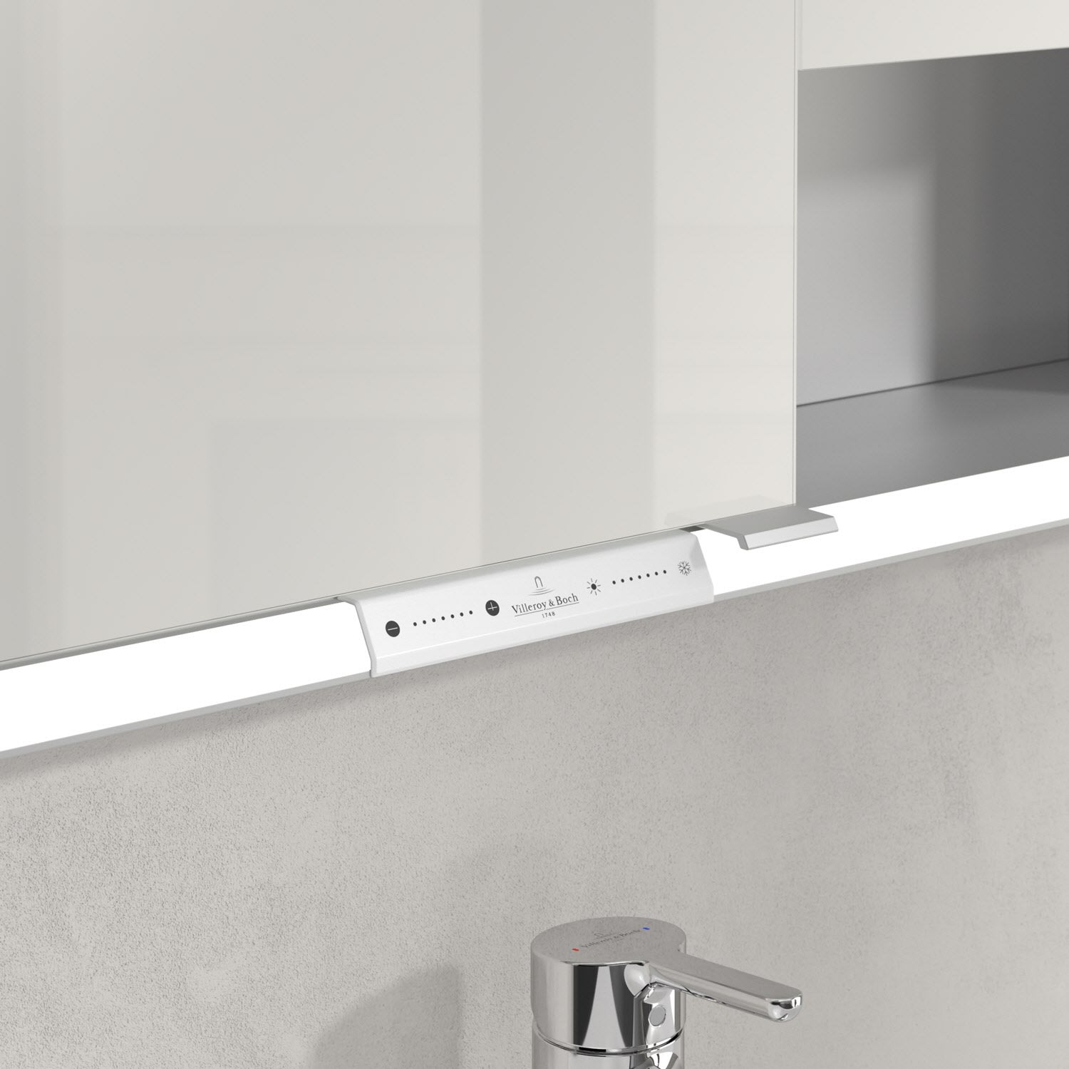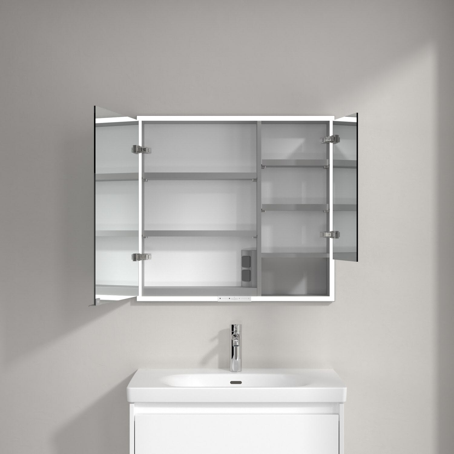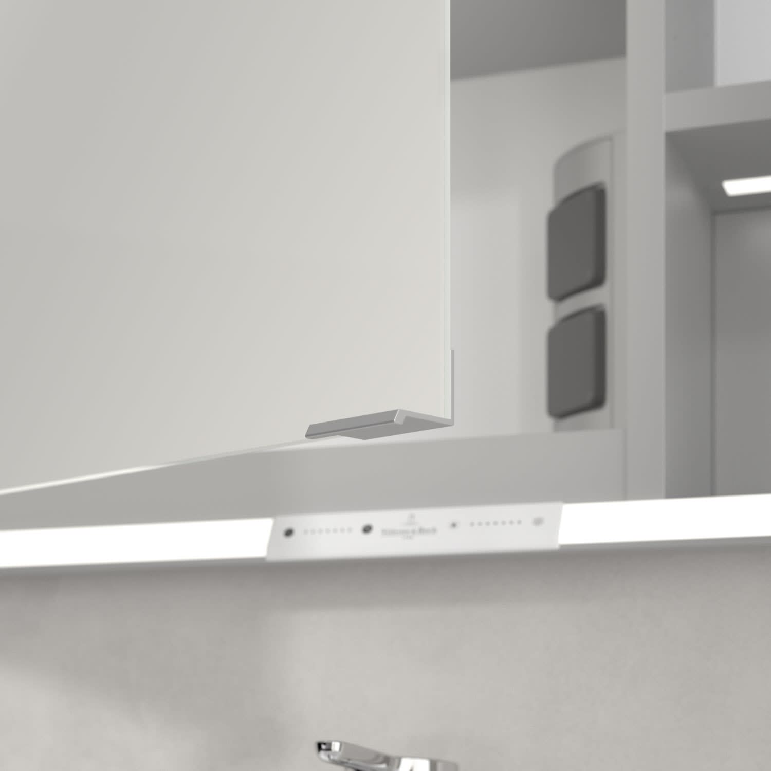 Das umlaufende LED-Lichtband bietet eine gleichmäßige Ausleuchtung, die integrierte Waschtischbeleuchtung und die beleuchteten offenen Fächer schaffen ein stimmungsvolles Ambiente. Helligkeit und Farbtemperatur lassen sich bequem per Sensor oder Smart-Home-Steuerung einstellen. Filigrane Griffe ermöglichen ein bequemes Öffnen der Türen ohne Fingerabdrücke, eine innenliegende Doppelsteckdose bietet zusätzliche Funktionalität.
