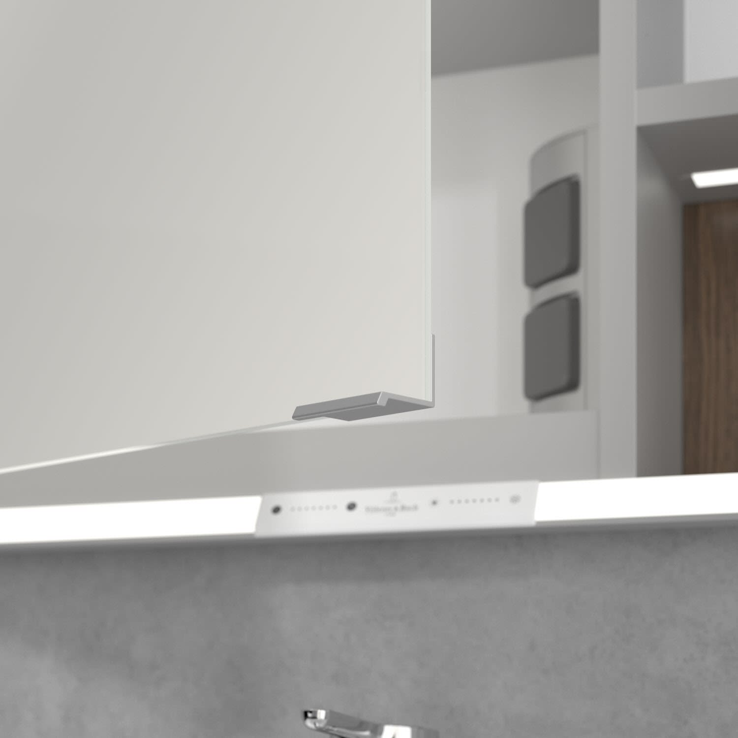 Das umlaufende LED-Lichtband bietet eine gleichmäßige Ausleuchtung, die integrierte Waschtischbeleuchtung und die beleuchteten offenen Fächer schaffen ein stimmungsvolles Ambiente. Helligkeit und Farbtemperatur lassen sich bequem per Sensor oder Smart-Home-Steuerung einstellen. Filigrane Griffe ermöglichen ein bequemes Öffnen der Türen ohne Fingerabdrücke, eine innenliegende Doppelsteckdose bietet zusätzliche Funktionalität.