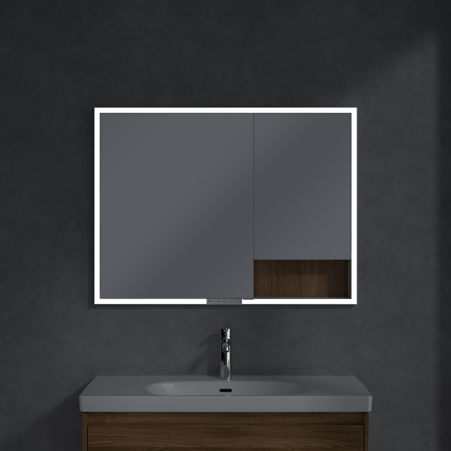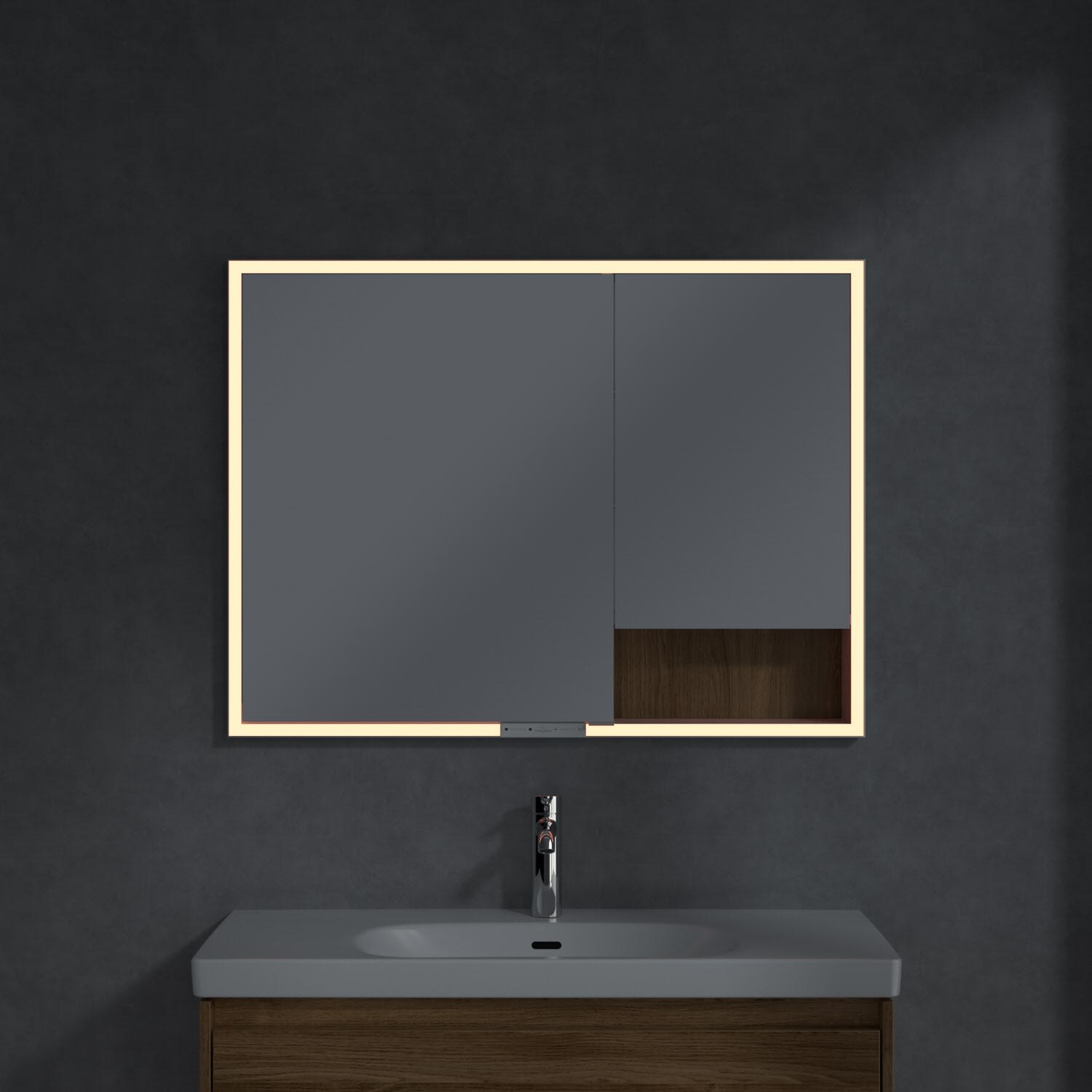 Das umlaufende LED-Lichtband bietet eine gleichmäßige Ausleuchtung, die integrierte Waschtischbeleuchtung und die beleuchteten offenen Fächer schaffen ein stimmungsvolles Ambiente. Helligkeit und Farbtemperatur lassen sich bequem per Sensor oder Smart-Home-Steuerung einstellen. Filigrane Griffe ermöglichen ein bequemes Öffnen der Türen ohne Fingerabdrücke, eine innenliegende Doppelsteckdose bietet zusätzliche Funktionalität.