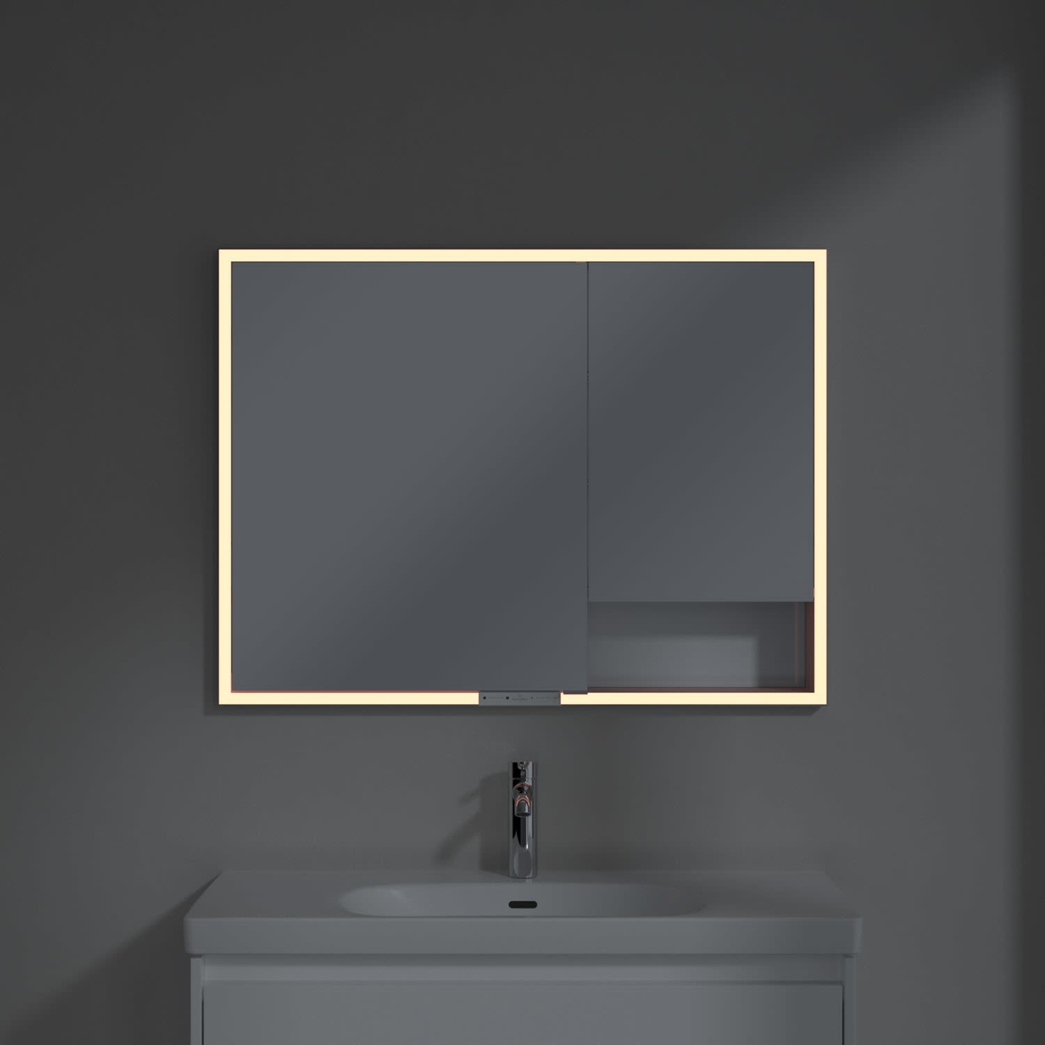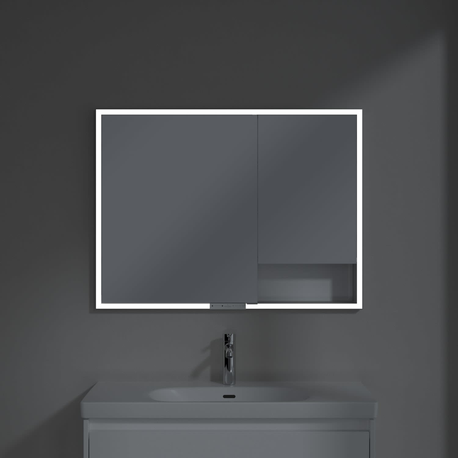 Das umlaufende LED-Lichtband bietet eine gleichmäßige Ausleuchtung, die integrierte Waschtischbeleuchtung und die beleuchteten offenen Fächer schaffen ein stimmungsvolles Ambiente. Helligkeit und Farbtemperatur lassen sich bequem per Sensor oder Smart-Home-Steuerung einstellen. Filigrane Griffe ermöglichen ein bequemes Öffnen der Türen ohne Fingerabdrücke, eine innenliegende Doppelsteckdose bietet zusätzliche Funktionalität.