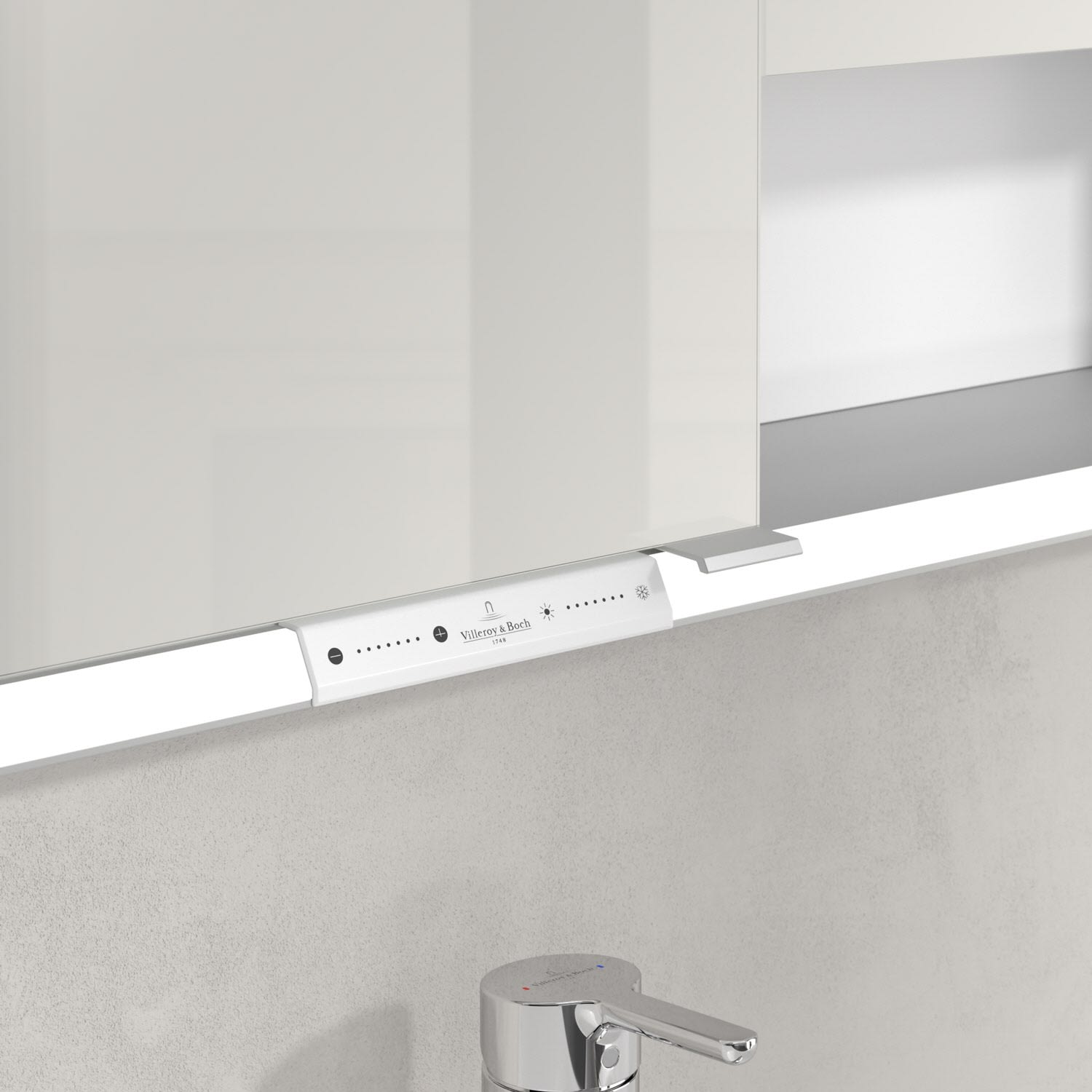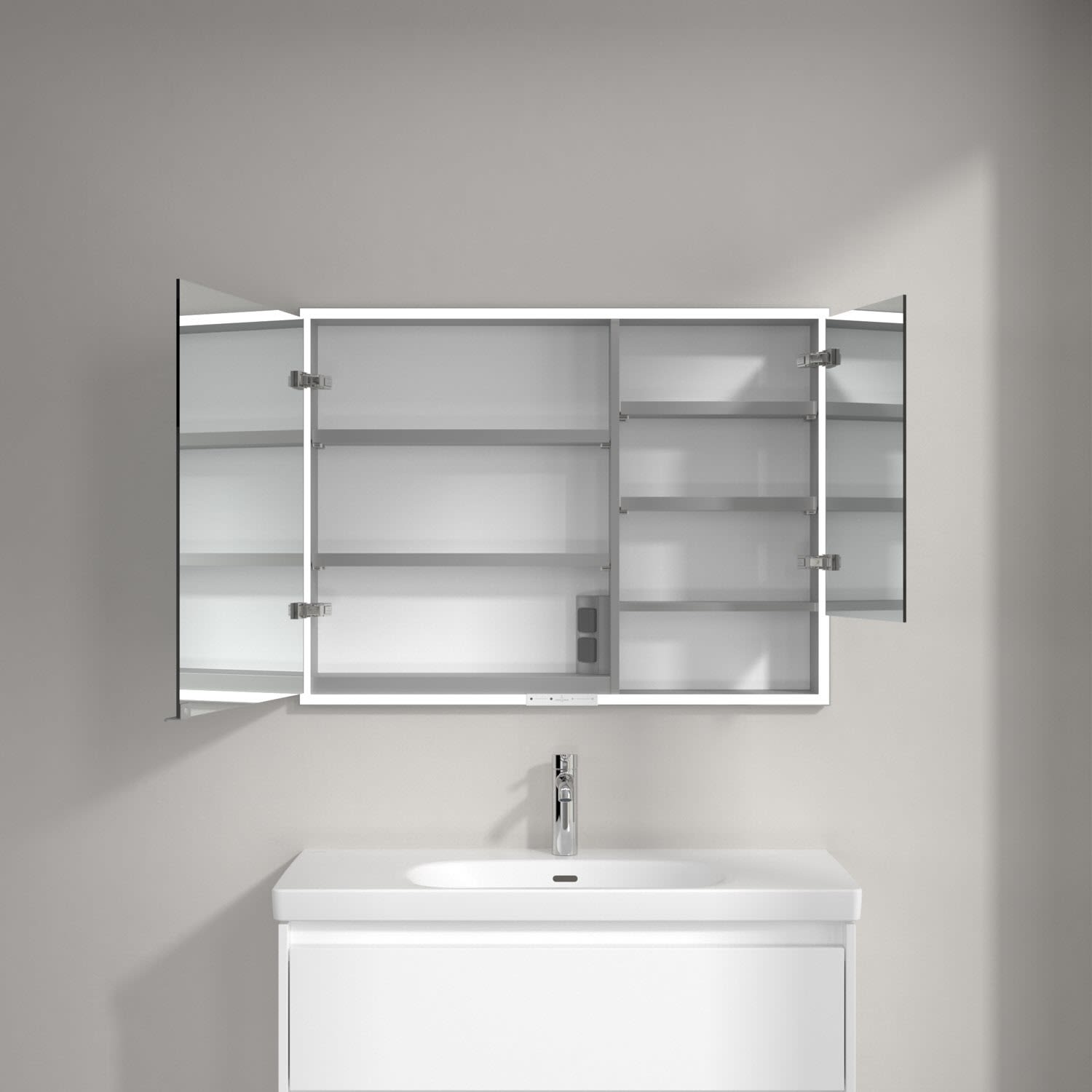 Das umlaufende LED-Lichtband bietet eine gleichmäßige Ausleuchtung, die integrierte Waschtischbeleuchtung und die beleuchteten offenen Fächer schaffen ein stimmungsvolles Ambiente. Helligkeit und Farbtemperatur lassen sich bequem per Sensor oder Smart-Home-Steuerung einstellen. Filigrane Griffe ermöglichen ein bequemes Öffnen der Türen ohne Fingerabdrücke, eine innenliegende Doppelsteckdose bietet zusätzliche Funktionalität.