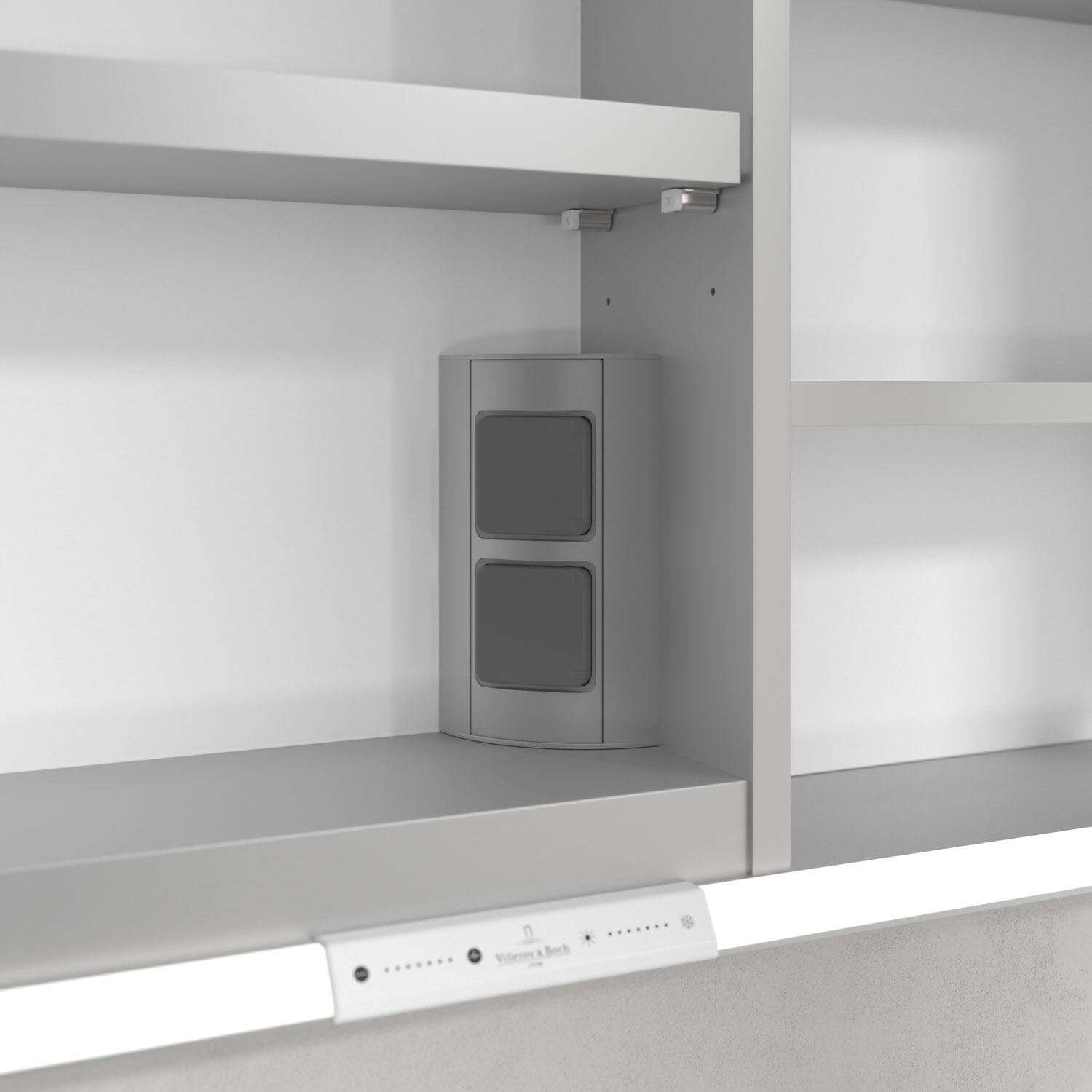- praktische Extras: Aluminiumeinlegeböden mit praktischem Kippschutz, Vergrößerungsspiegel & Magnetleiste