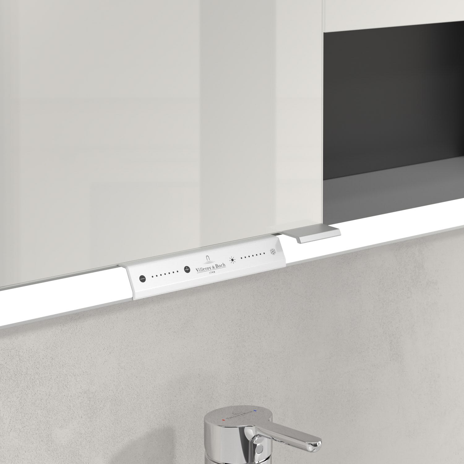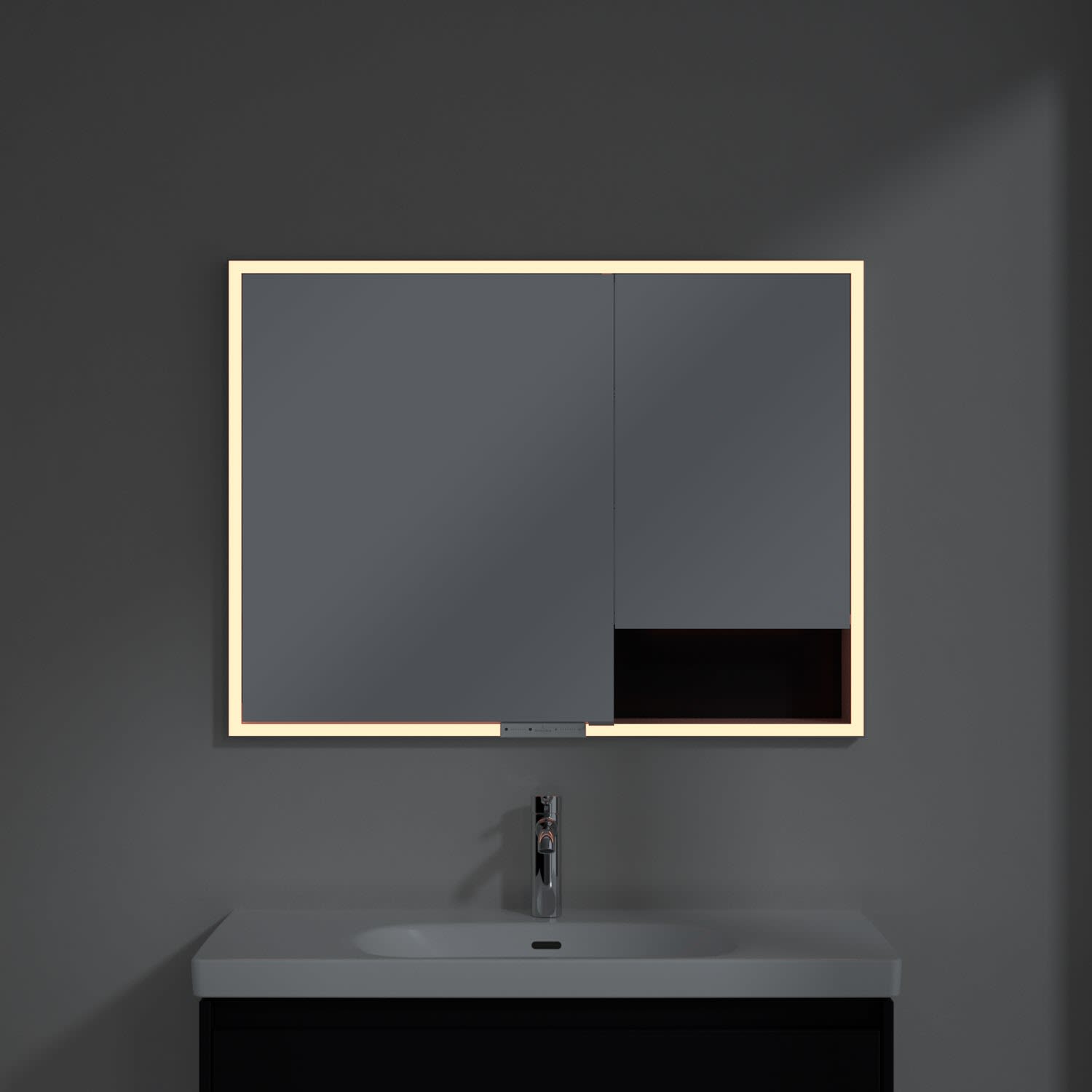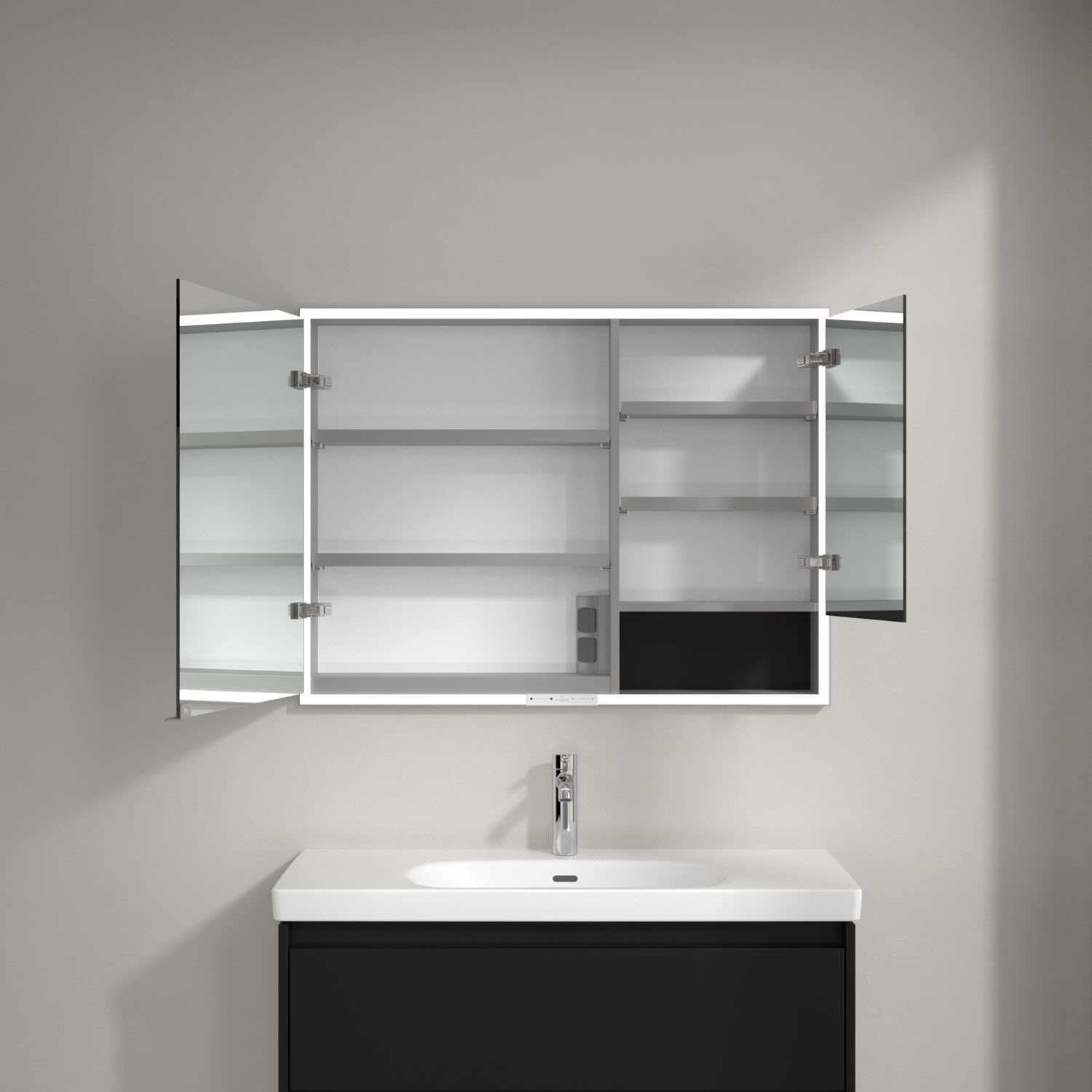 Das umlaufende LED-Lichtband bietet eine gleichmäßige Ausleuchtung, die integrierte Waschtischbeleuchtung und die beleuchteten offenen Fächer schaffen ein stimmungsvolles Ambiente. Helligkeit und Farbtemperatur lassen sich bequem per Sensor oder Smart-Home-Steuerung einstellen. Filigrane Griffe ermöglichen ein bequemes Öffnen der Türen ohne Fingerabdrücke, eine innenliegende Doppelsteckdose bietet zusätzliche Funktionalität.