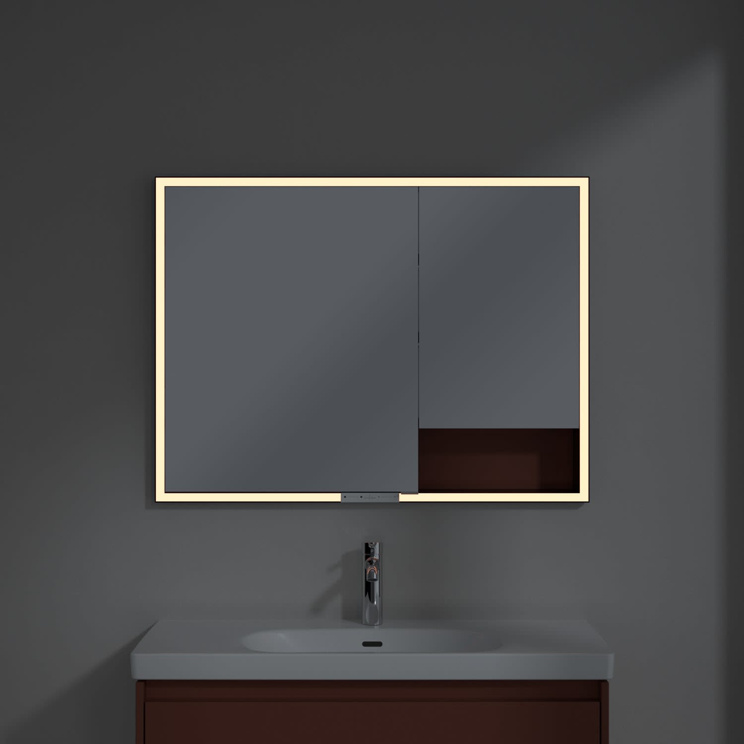 Das umlaufende LED-Lichtband bietet eine gleichmäßige Ausleuchtung, die integrierte Waschtischbeleuchtung und die beleuchteten offenen Fächer schaffen ein stimmungsvolles Ambiente. Helligkeit und Farbtemperatur lassen sich bequem per Sensor oder Smart-Home-Steuerung einstellen. Filigrane Griffe ermöglichen ein bequemes Öffnen der Türen ohne Fingerabdrücke, eine innenliegende Doppelsteckdose bietet zusätzliche Funktionalität.