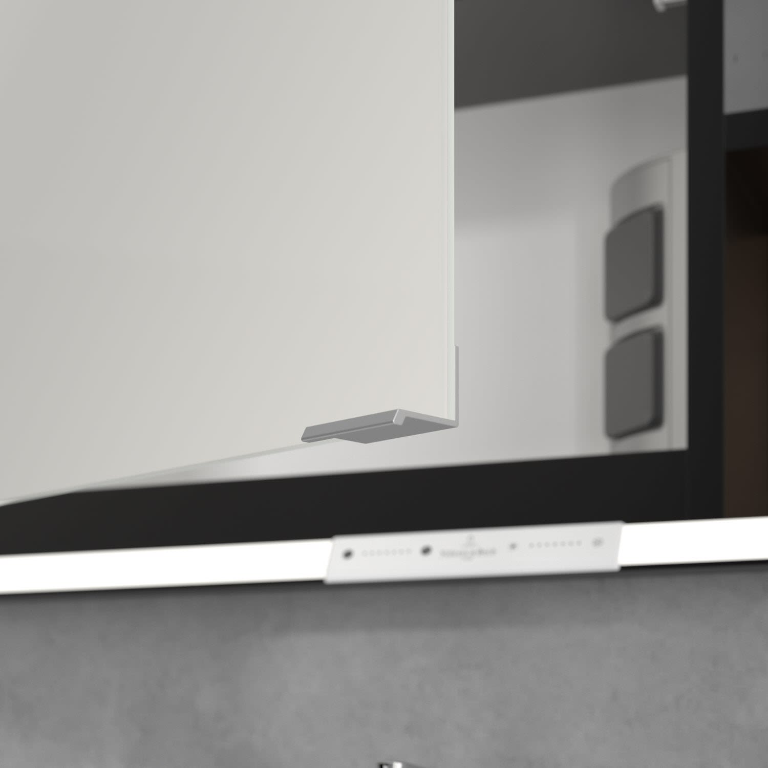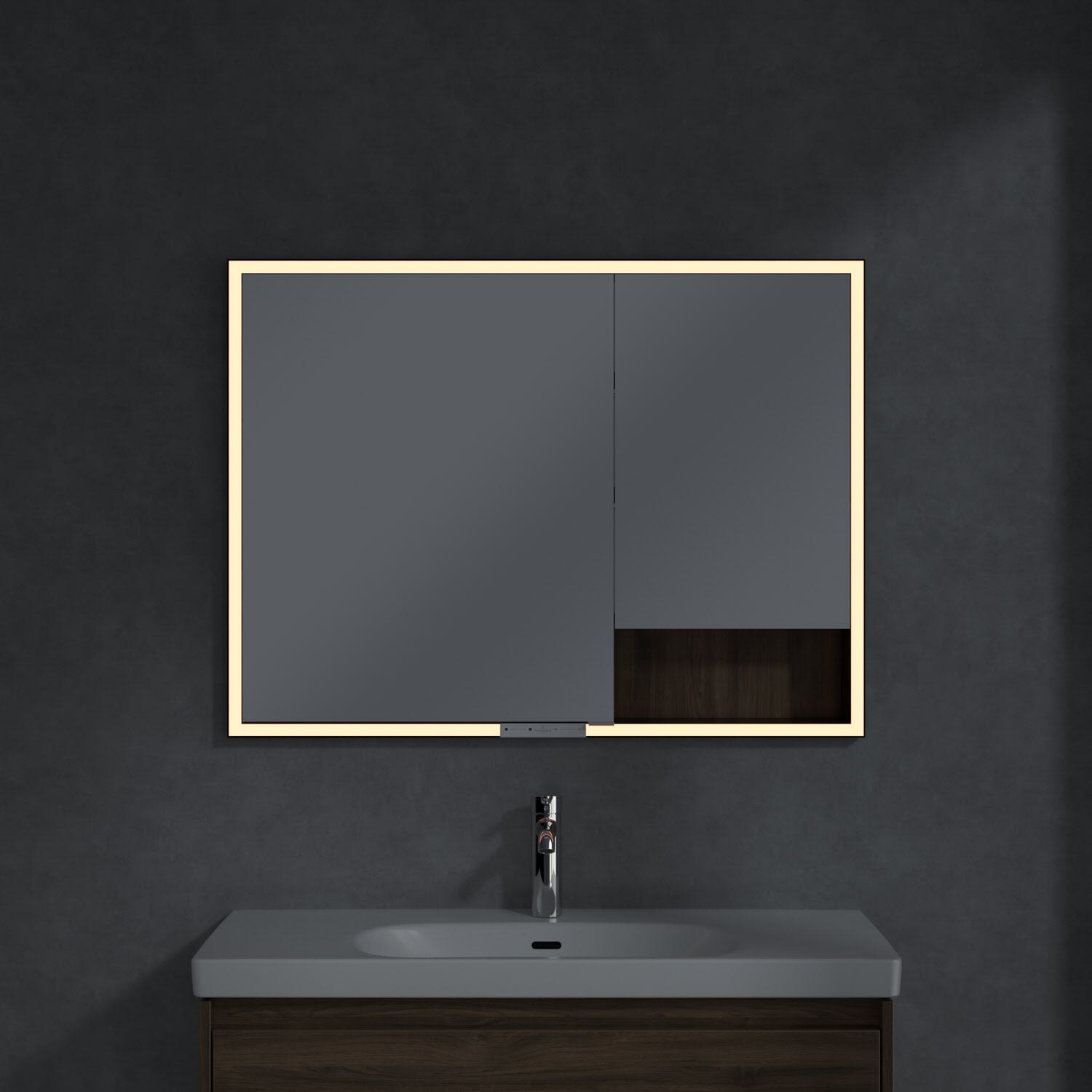 Das umlaufende LED-Lichtband bietet eine gleichmäßige Ausleuchtung, die integrierte Waschtischbeleuchtung und die beleuchteten offenen Fächer schaffen ein stimmungsvolles Ambiente. Helligkeit und Farbtemperatur lassen sich bequem per Sensor oder Smart-Home-Steuerung einstellen. Filigrane Griffe ermöglichen ein bequemes Öffnen der Türen ohne Fingerabdrücke, eine innenliegende Doppelsteckdose bietet zusätzliche Funktionalität.