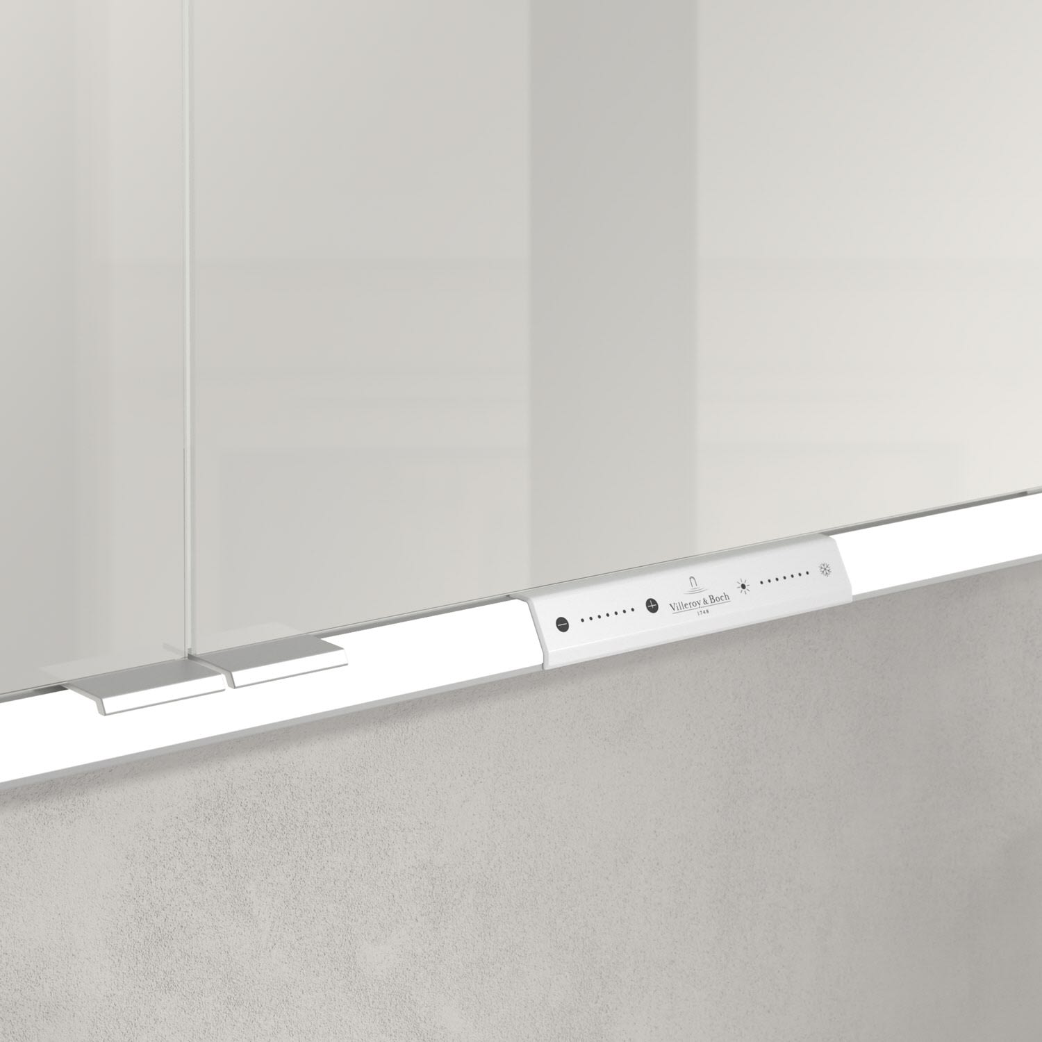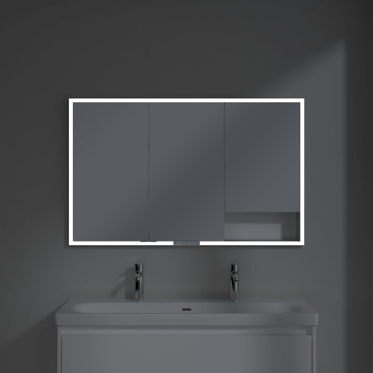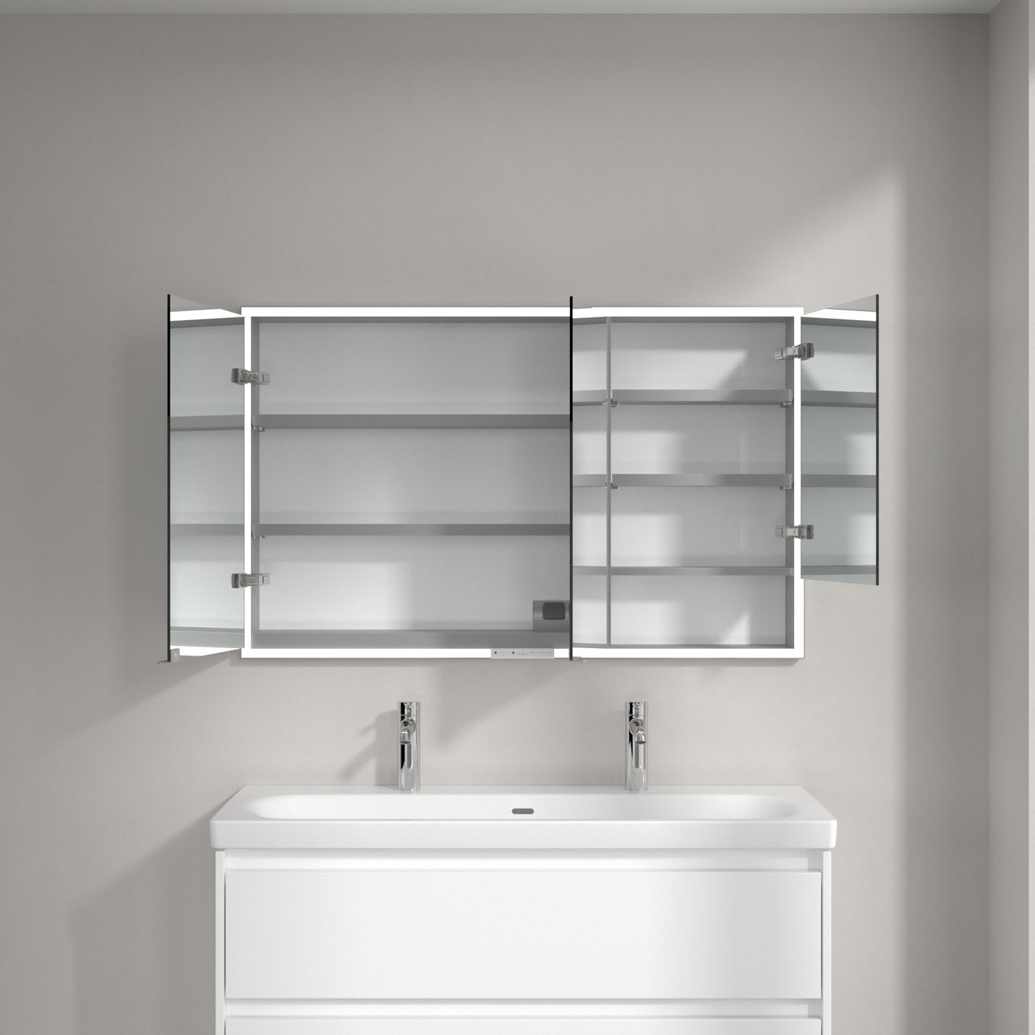 Das umlaufende LED-Lichtband bietet eine gleichmäßige Ausleuchtung, die integrierte Waschtischbeleuchtung und die beleuchteten offenen Fächer schaffen ein stimmungsvolles Ambiente. Helligkeit und Farbtemperatur lassen sich bequem per Sensor oder Smart-Home-Steuerung einstellen. Filigrane Griffe ermöglichen ein bequemes Öffnen der Türen ohne Fingerabdrücke, eine innenliegende Doppelsteckdose bietet zusätzliche Funktionalität.