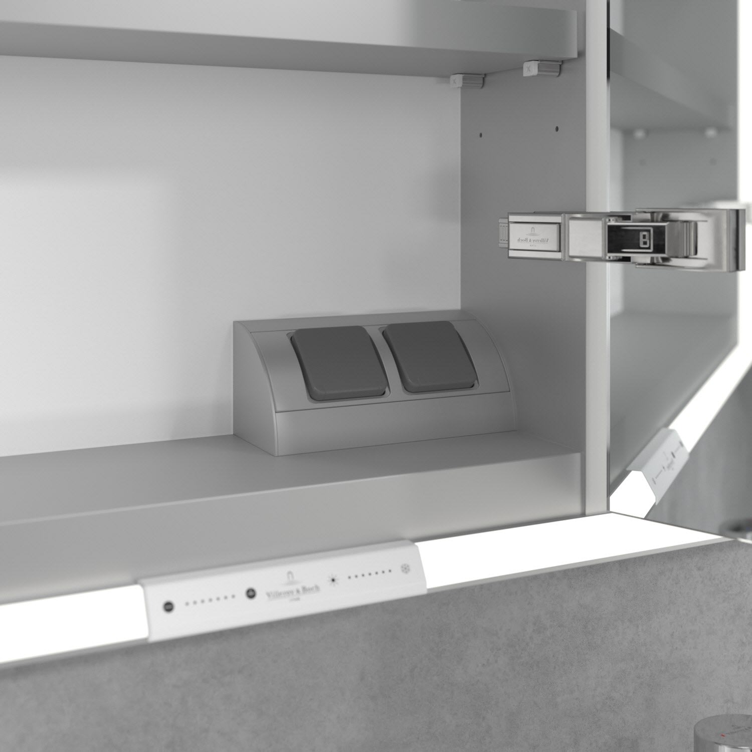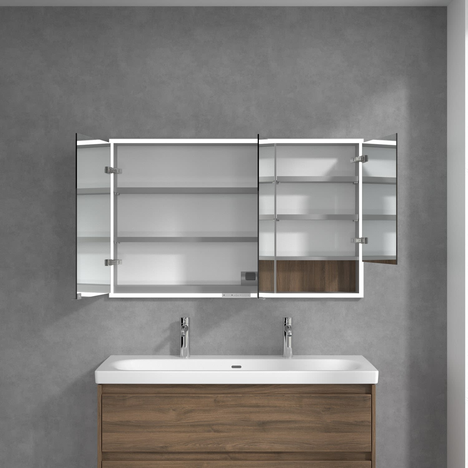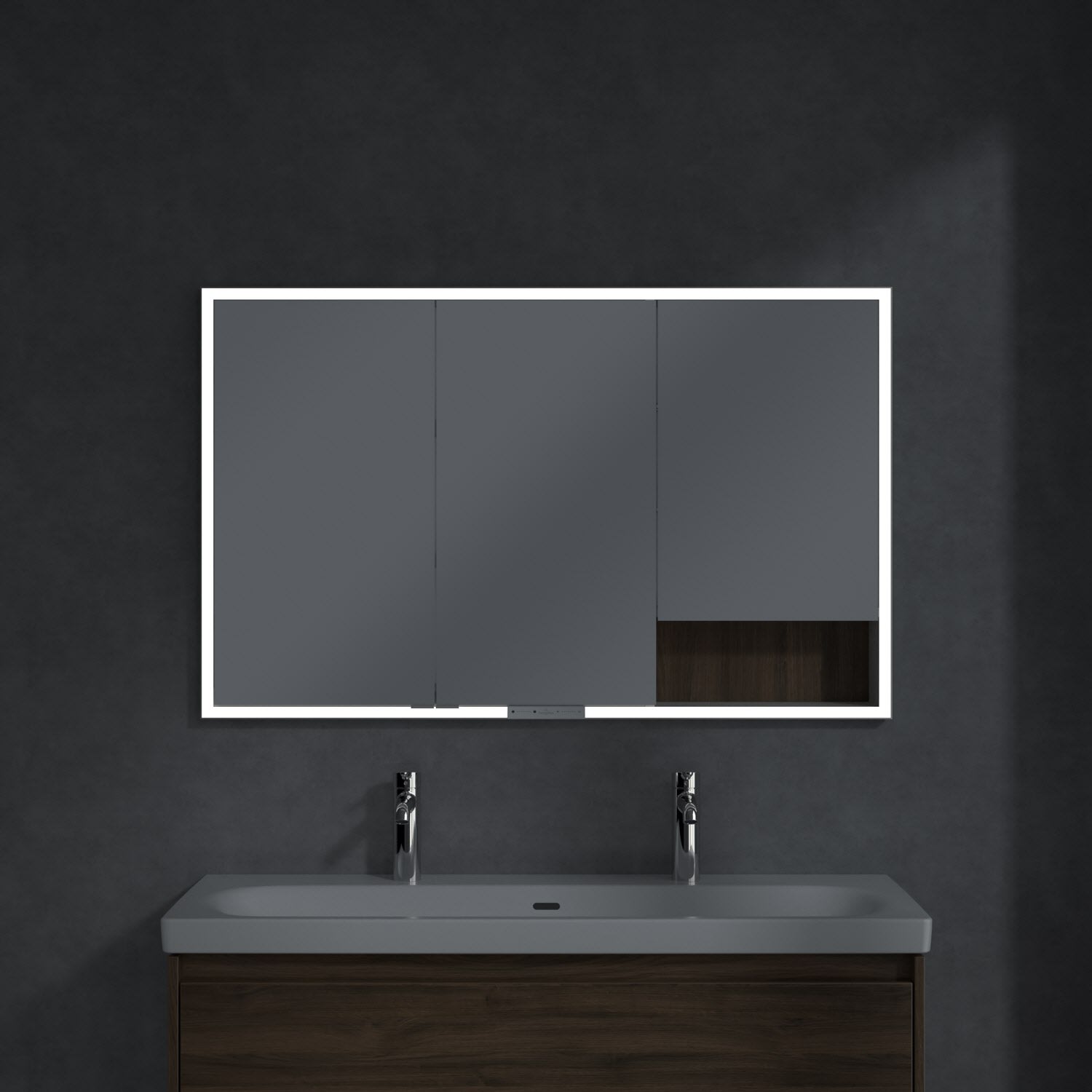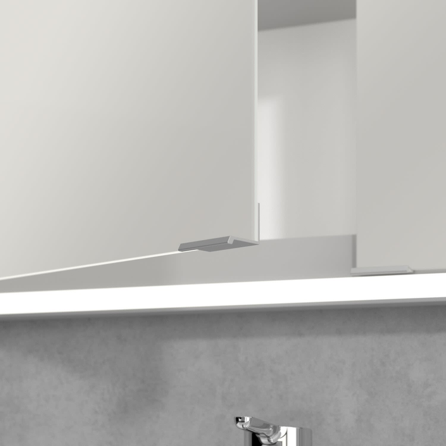 Das umlaufende LED-Lichtband bietet eine gleichmäßige Ausleuchtung, die integrierte Waschtischbeleuchtung und die beleuchteten offenen Fächer schaffen ein stimmungsvolles Ambiente. Helligkeit und Farbtemperatur lassen sich bequem per Sensor oder Smart-Home-Steuerung einstellen. Filigrane Griffe ermöglichen ein bequemes Öffnen der Türen ohne Fingerabdrücke, eine innenliegende Doppelsteckdose bietet zusätzliche Funktionalität.