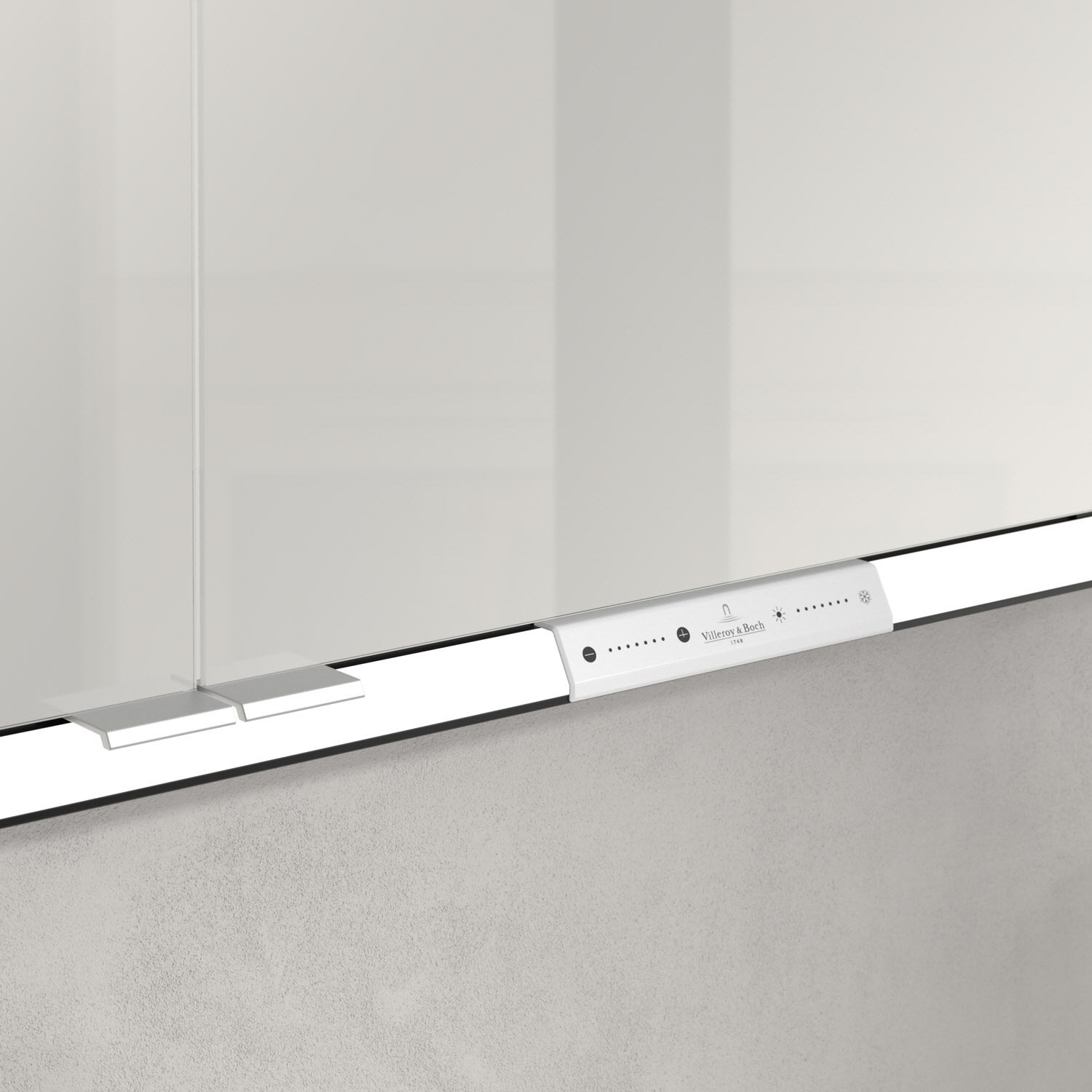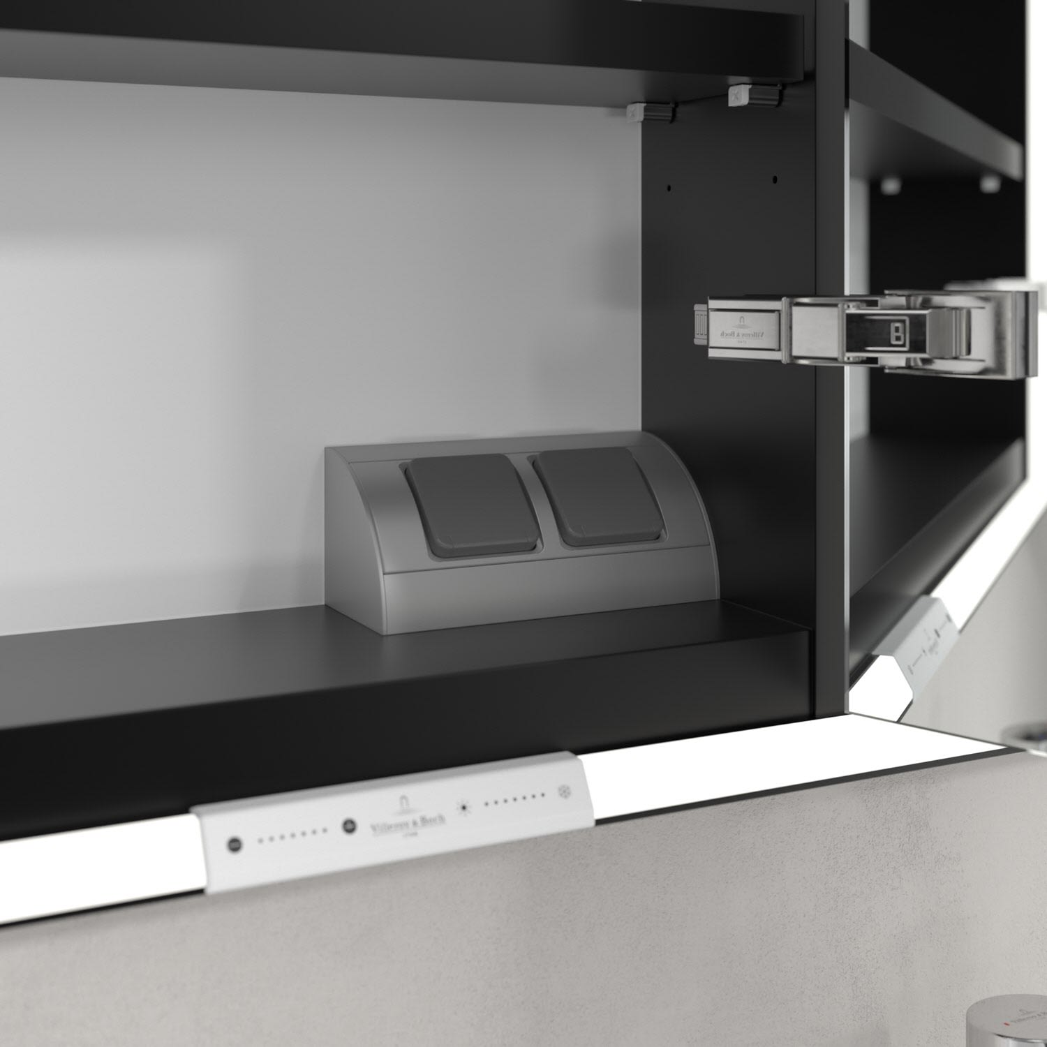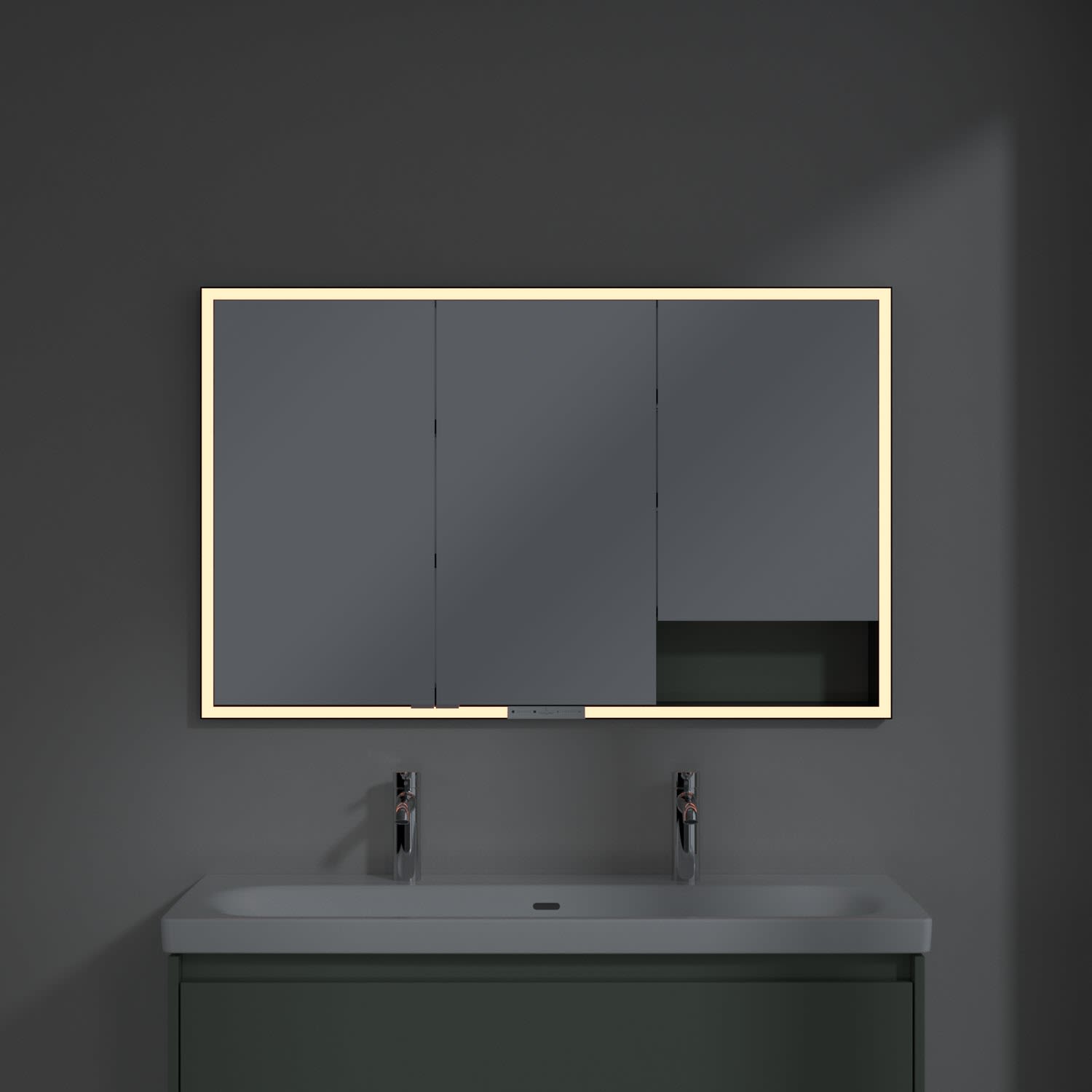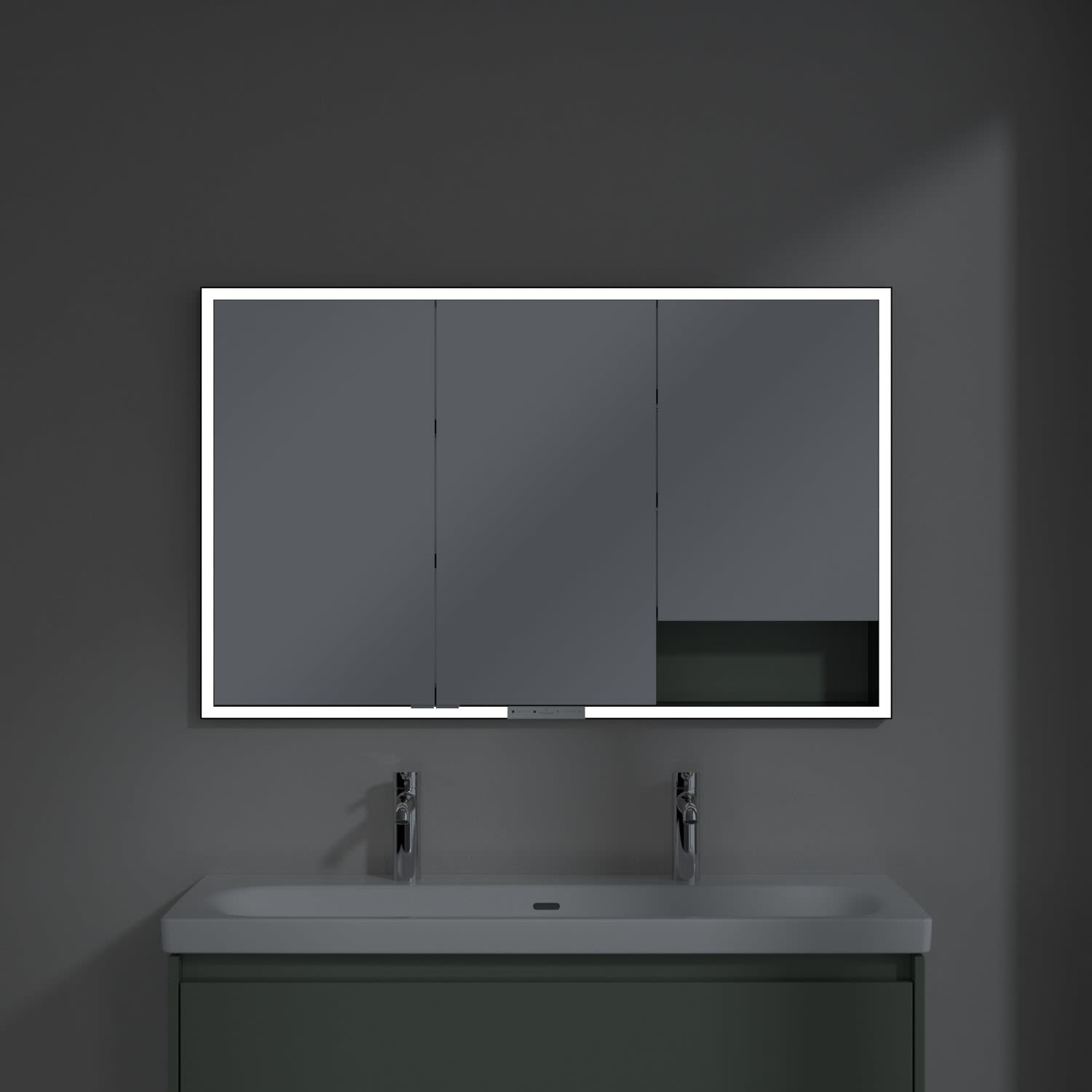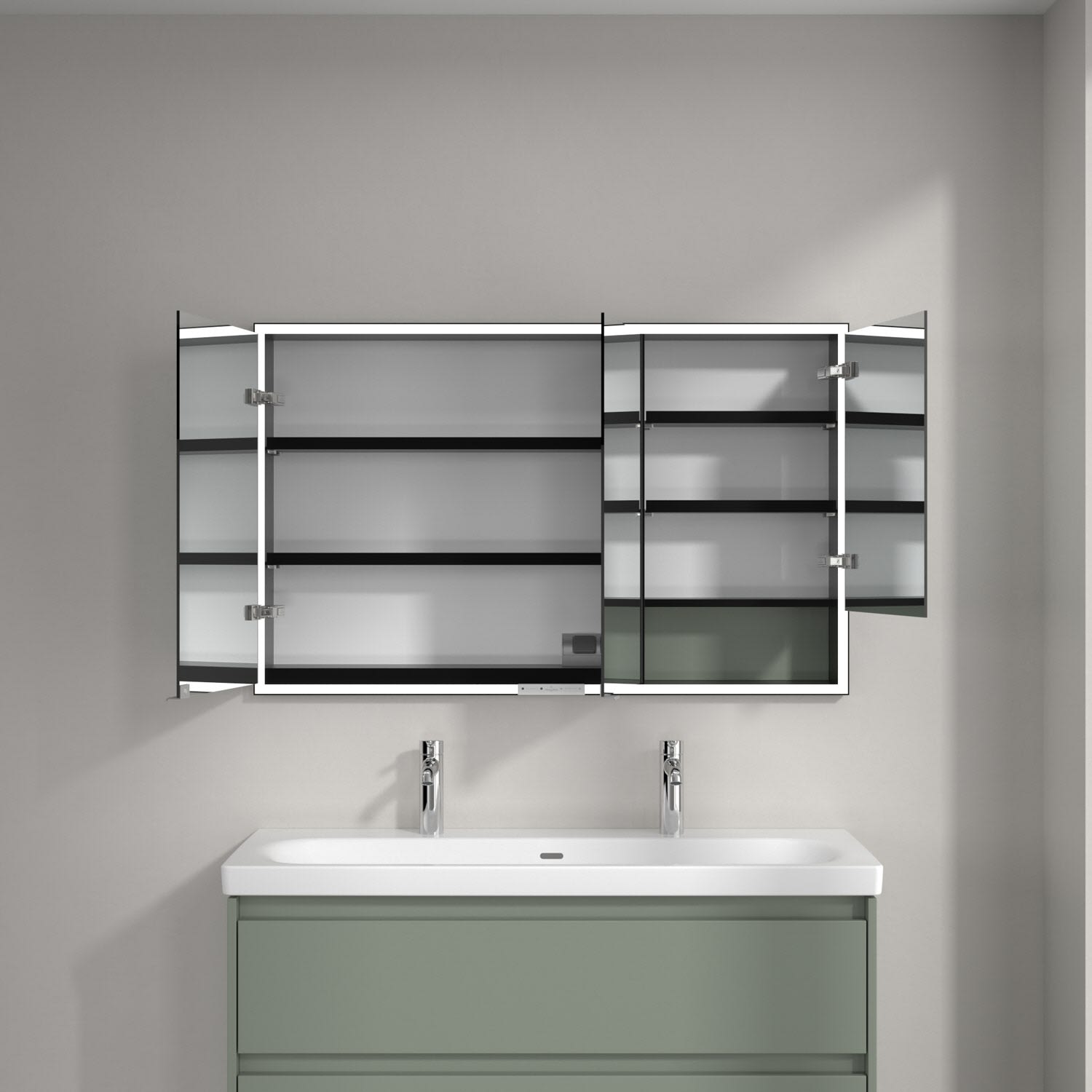 Das umlaufende LED-Lichtband bietet eine gleichmäßige Ausleuchtung, die integrierte Waschtischbeleuchtung und die beleuchteten offenen Fächer schaffen ein stimmungsvolles Ambiente. Helligkeit und Farbtemperatur lassen sich bequem per Sensor oder Smart-Home-Steuerung einstellen. Filigrane Griffe ermöglichen ein bequemes Öffnen der Türen ohne Fingerabdrücke, eine innenliegende Doppelsteckdose bietet zusätzliche Funktionalität.
