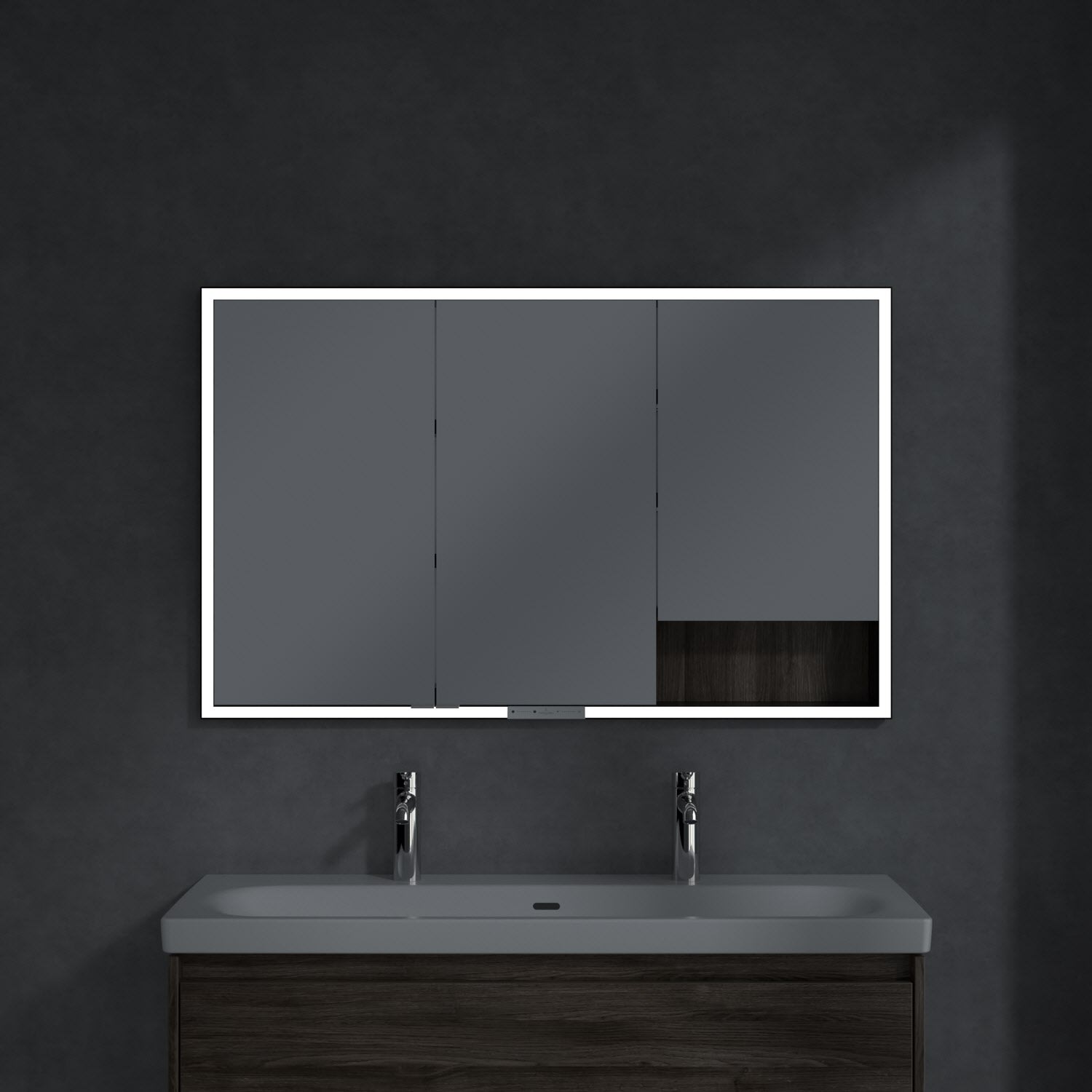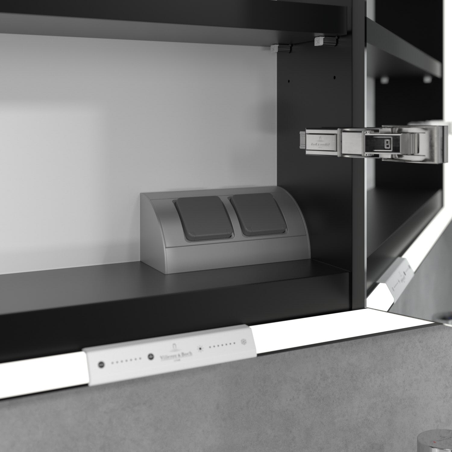 Das umlaufende LED-Lichtband bietet eine gleichmäßige Ausleuchtung, die integrierte Waschtischbeleuchtung und die beleuchteten offenen Fächer schaffen ein stimmungsvolles Ambiente. Helligkeit und Farbtemperatur lassen sich bequem per Sensor oder Smart-Home-Steuerung einstellen. Filigrane Griffe ermöglichen ein bequemes Öffnen der Türen ohne Fingerabdrücke, eine innenliegende Doppelsteckdose bietet zusätzliche Funktionalität.
