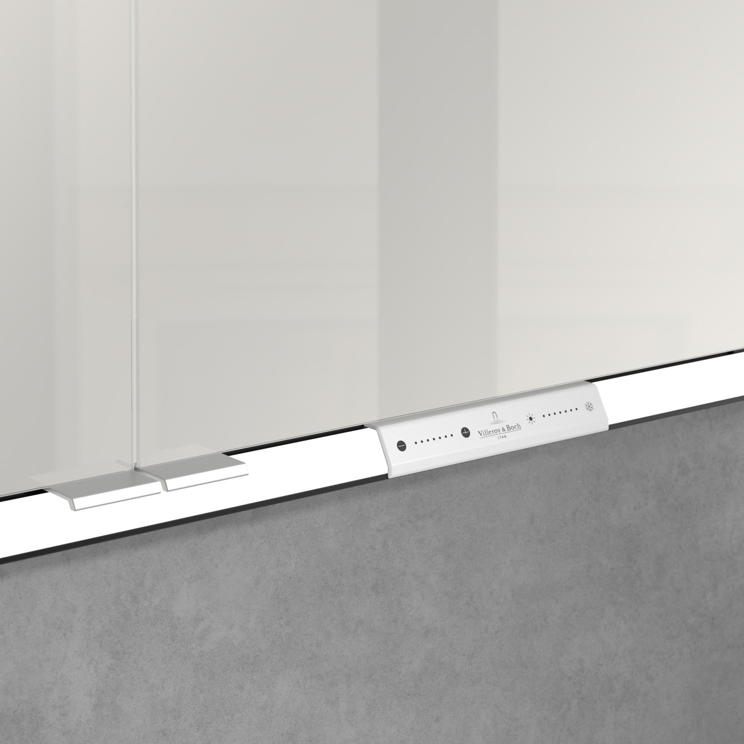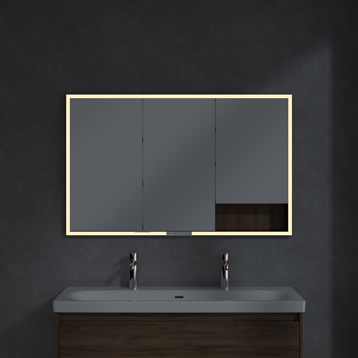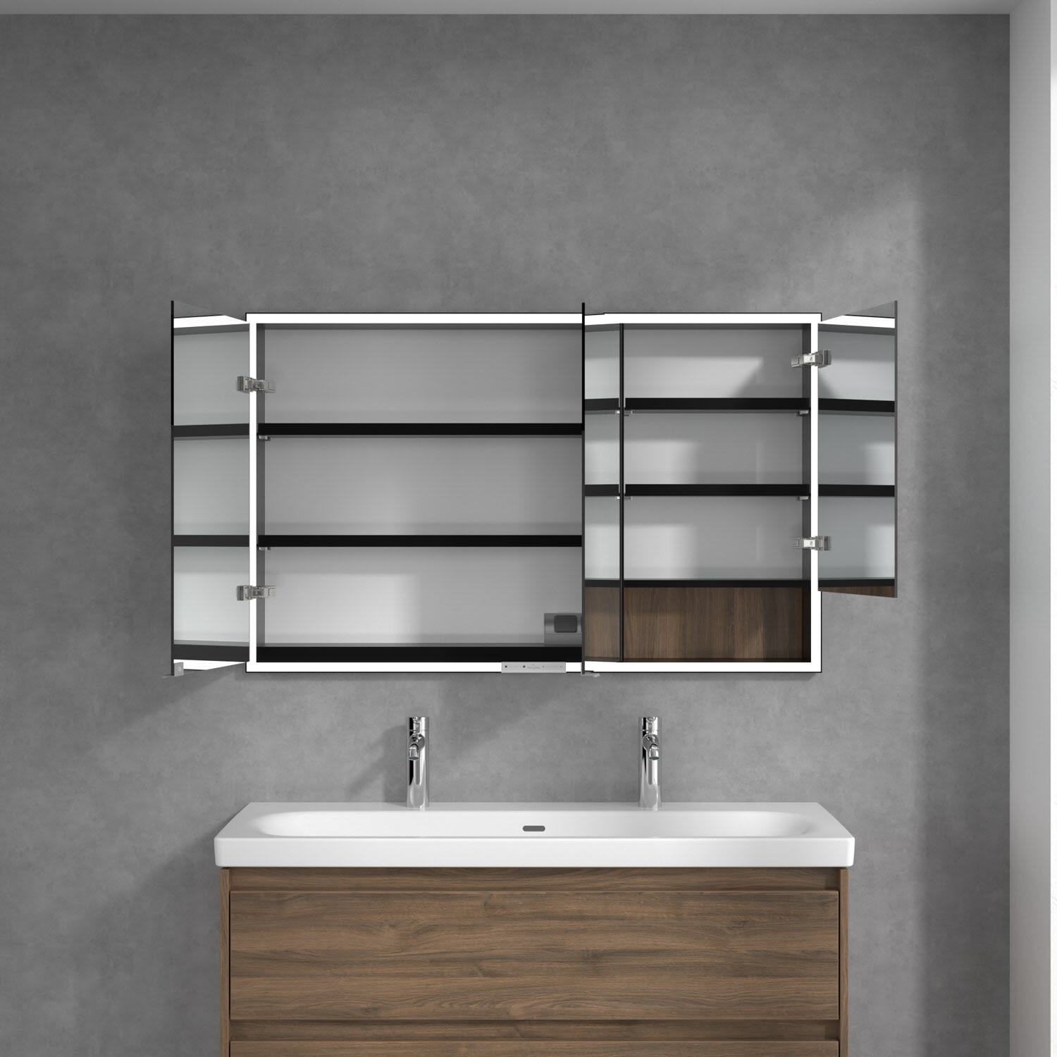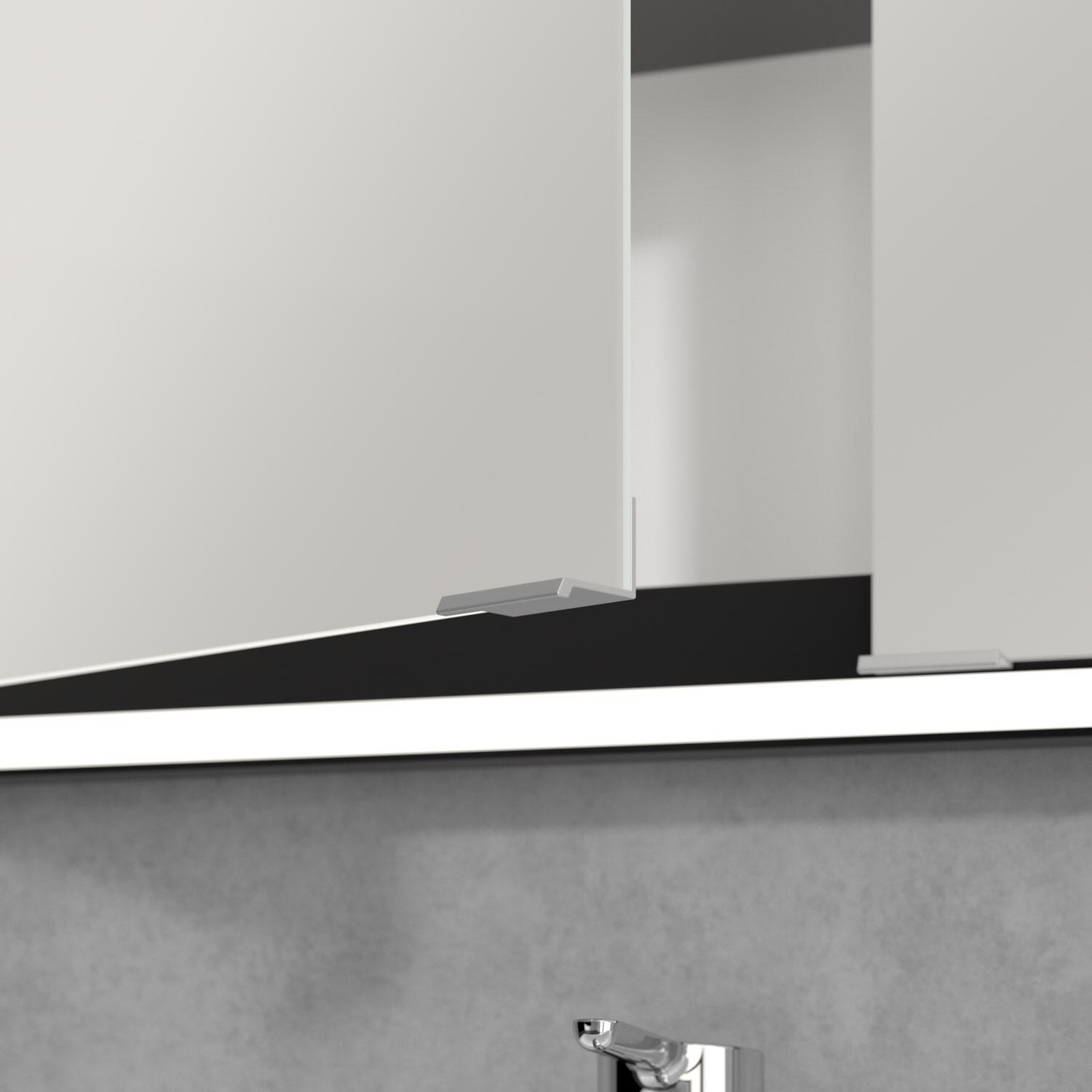Das umlaufende LED-Lichtband bietet eine gleichmäßige Ausleuchtung, die integrierte Waschtischbeleuchtung und die beleuchteten offenen Fächer schaffen ein stimmungsvolles Ambiente. Helligkeit und Farbtemperatur lassen sich bequem per Sensor oder Smart-Home-Steuerung einstellen. Filigrane Griffe ermöglichen ein bequemes Öffnen der Türen ohne Fingerabdrücke, eine innenliegende Doppelsteckdose bietet zusätzliche Funktionalität.