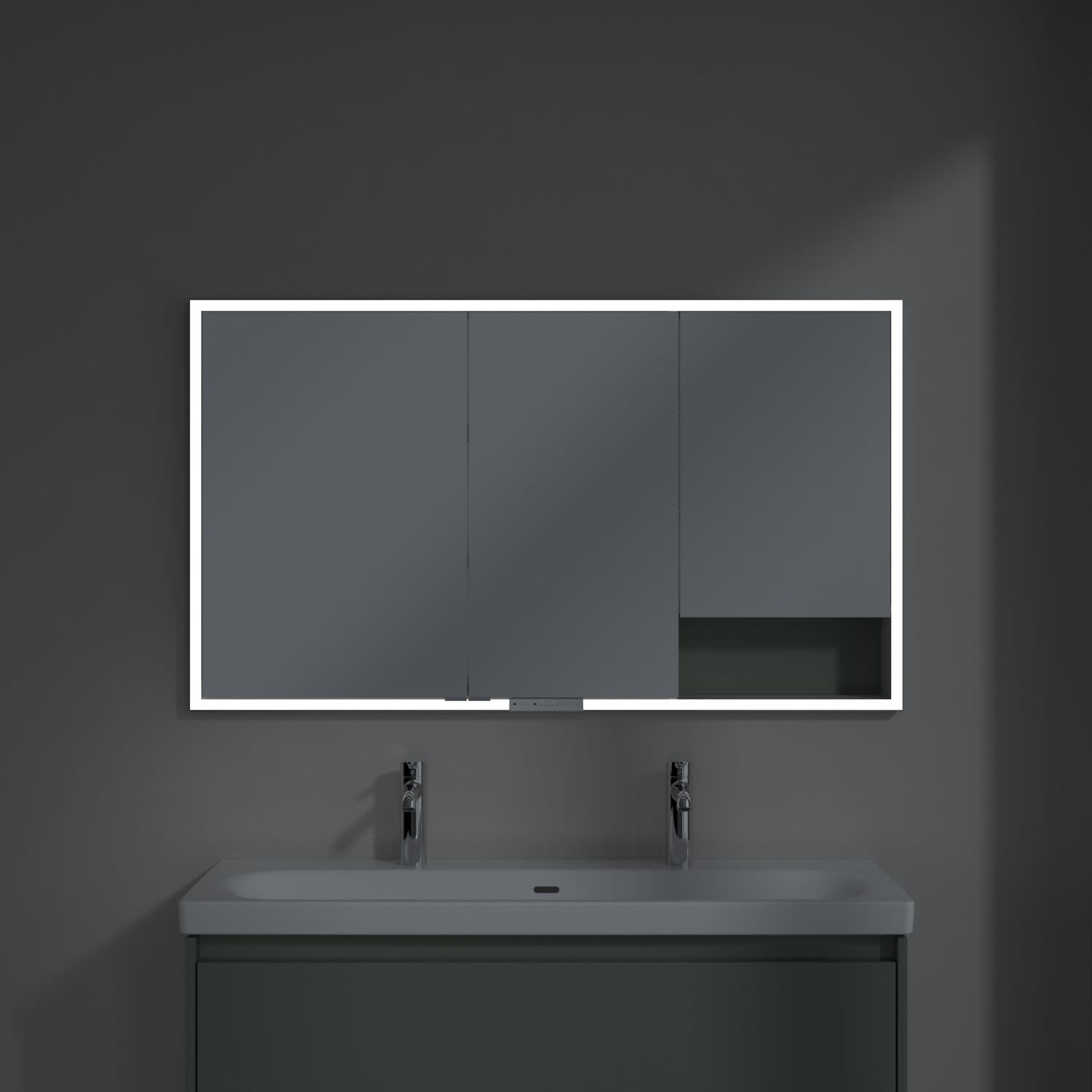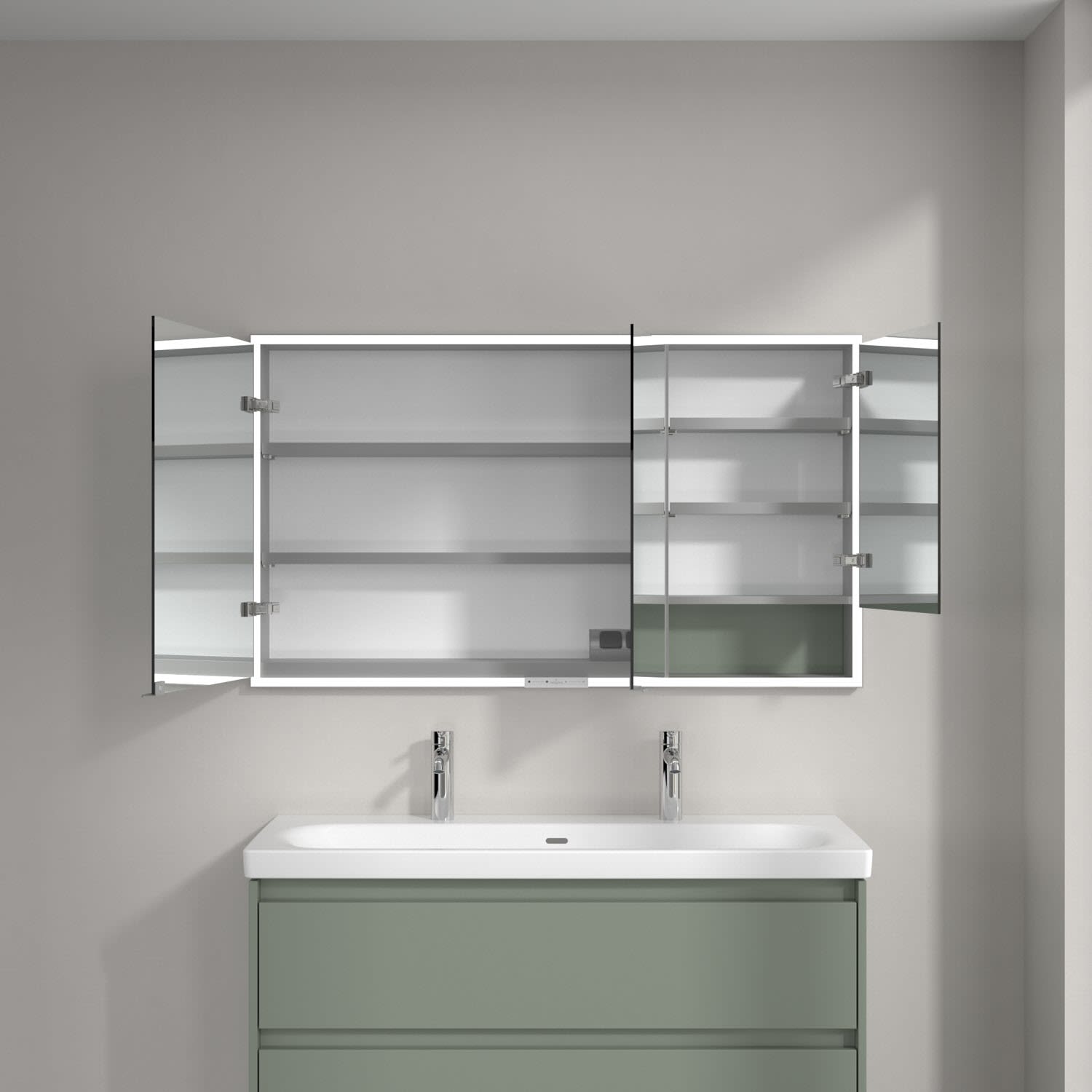 Das umlaufende LED-Lichtband bietet eine gleichmäßige Ausleuchtung, die integrierte Waschtischbeleuchtung und die beleuchteten offenen Fächer schaffen ein stimmungsvolles Ambiente. Helligkeit und Farbtemperatur lassen sich bequem per Sensor oder Smart-Home-Steuerung einstellen. Filigrane Griffe ermöglichen ein bequemes Öffnen der Türen ohne Fingerabdrücke, eine innenliegende Doppelsteckdose bietet zusätzliche Funktionalität.