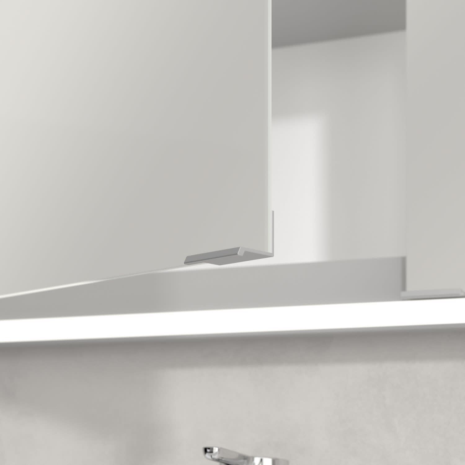 - praktische Extras: Aluminiumeinlegeböden mit praktischem Kippschutz, Vergrößerungsspiegel & Magnetleiste
