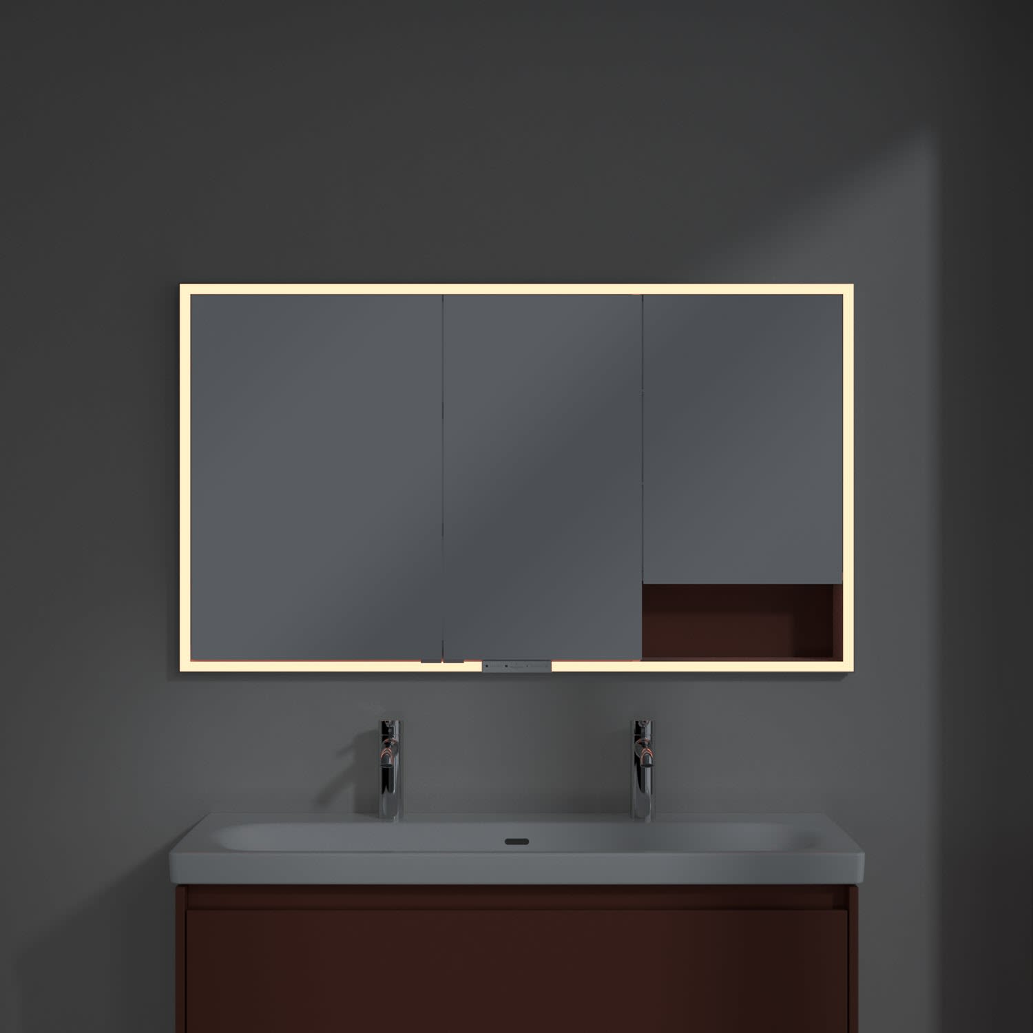 Das umlaufende LED-Lichtband bietet eine gleichmäßige Ausleuchtung, die integrierte Waschtischbeleuchtung und die beleuchteten offenen Fächer schaffen ein stimmungsvolles Ambiente. Helligkeit und Farbtemperatur lassen sich bequem per Sensor oder Smart-Home-Steuerung einstellen. Filigrane Griffe ermöglichen ein bequemes Öffnen der Türen ohne Fingerabdrücke, eine innenliegende Doppelsteckdose bietet zusätzliche Funktionalität.