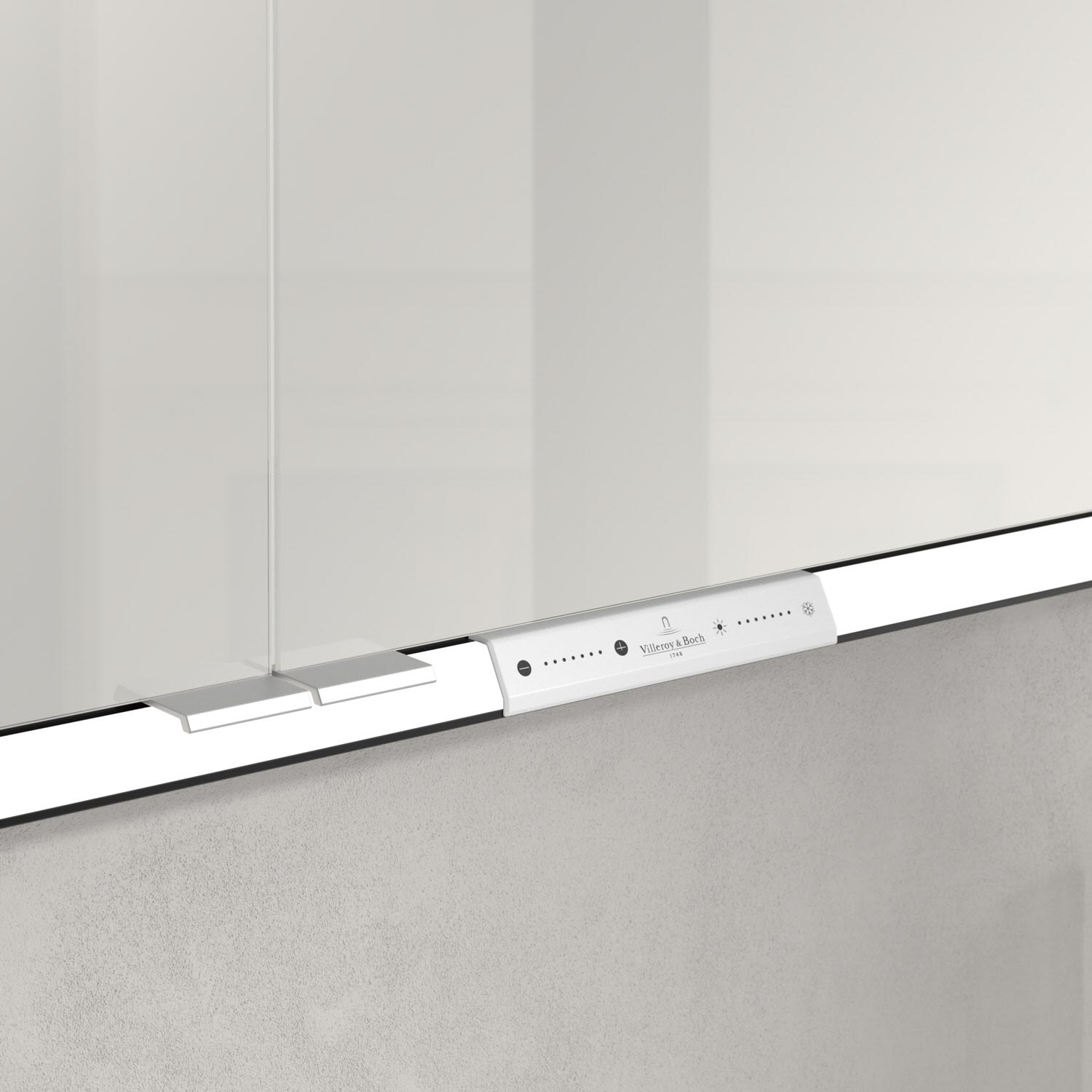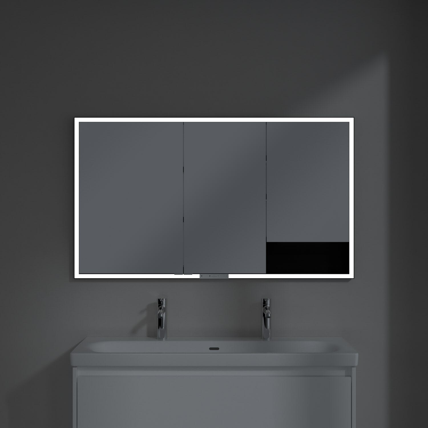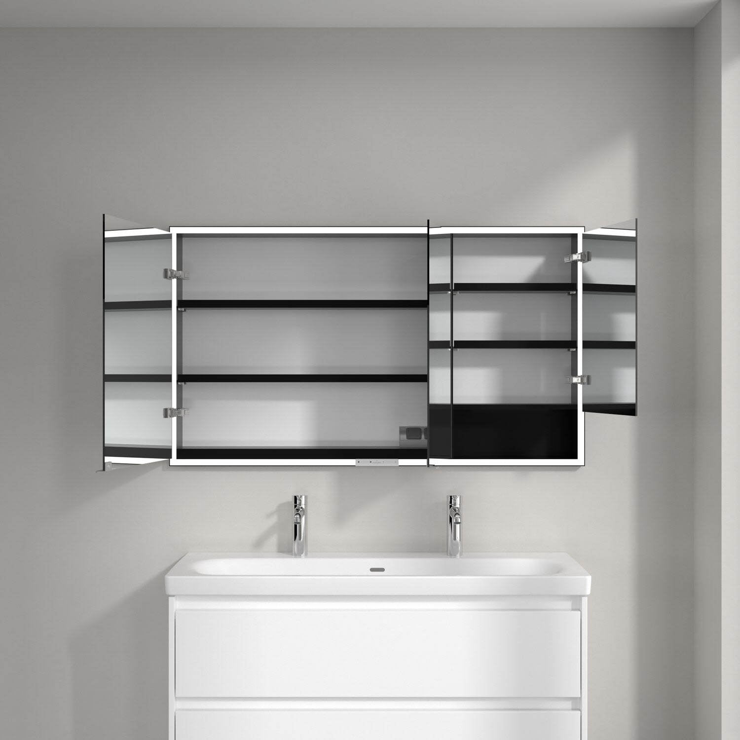 Das umlaufende LED-Lichtband bietet eine gleichmäßige Ausleuchtung, die integrierte Waschtischbeleuchtung und die beleuchteten offenen Fächer schaffen ein stimmungsvolles Ambiente. Helligkeit und Farbtemperatur lassen sich bequem per Sensor oder Smart-Home-Steuerung einstellen. Filigrane Griffe ermöglichen ein bequemes Öffnen der Türen ohne Fingerabdrücke, eine innenliegende Doppelsteckdose bietet zusätzliche Funktionalität.