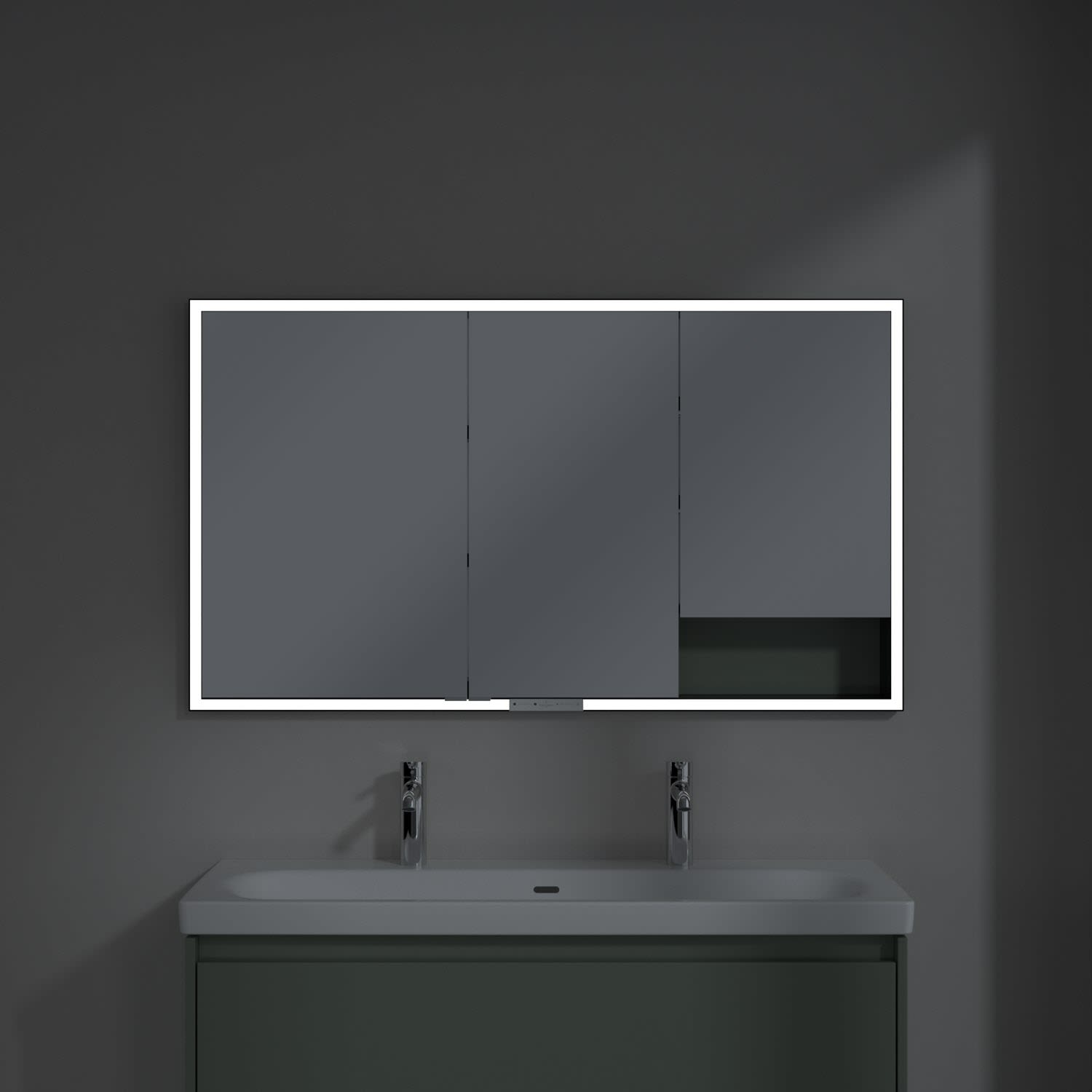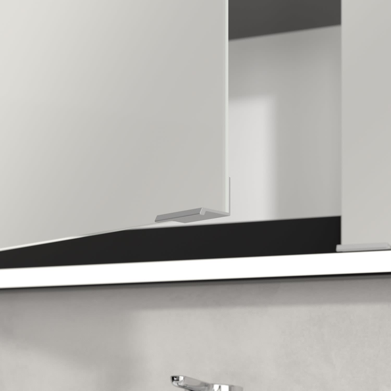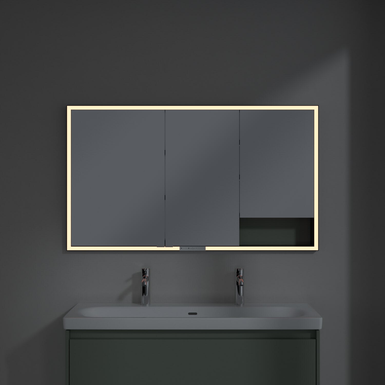 Das umlaufende LED-Lichtband bietet eine gleichmäßige Ausleuchtung, die integrierte Waschtischbeleuchtung und die beleuchteten offenen Fächer schaffen ein stimmungsvolles Ambiente. Helligkeit und Farbtemperatur lassen sich bequem per Sensor oder Smart-Home-Steuerung einstellen. Filigrane Griffe ermöglichen ein bequemes Öffnen der Türen ohne Fingerabdrücke, eine innenliegende Doppelsteckdose bietet zusätzliche Funktionalität.