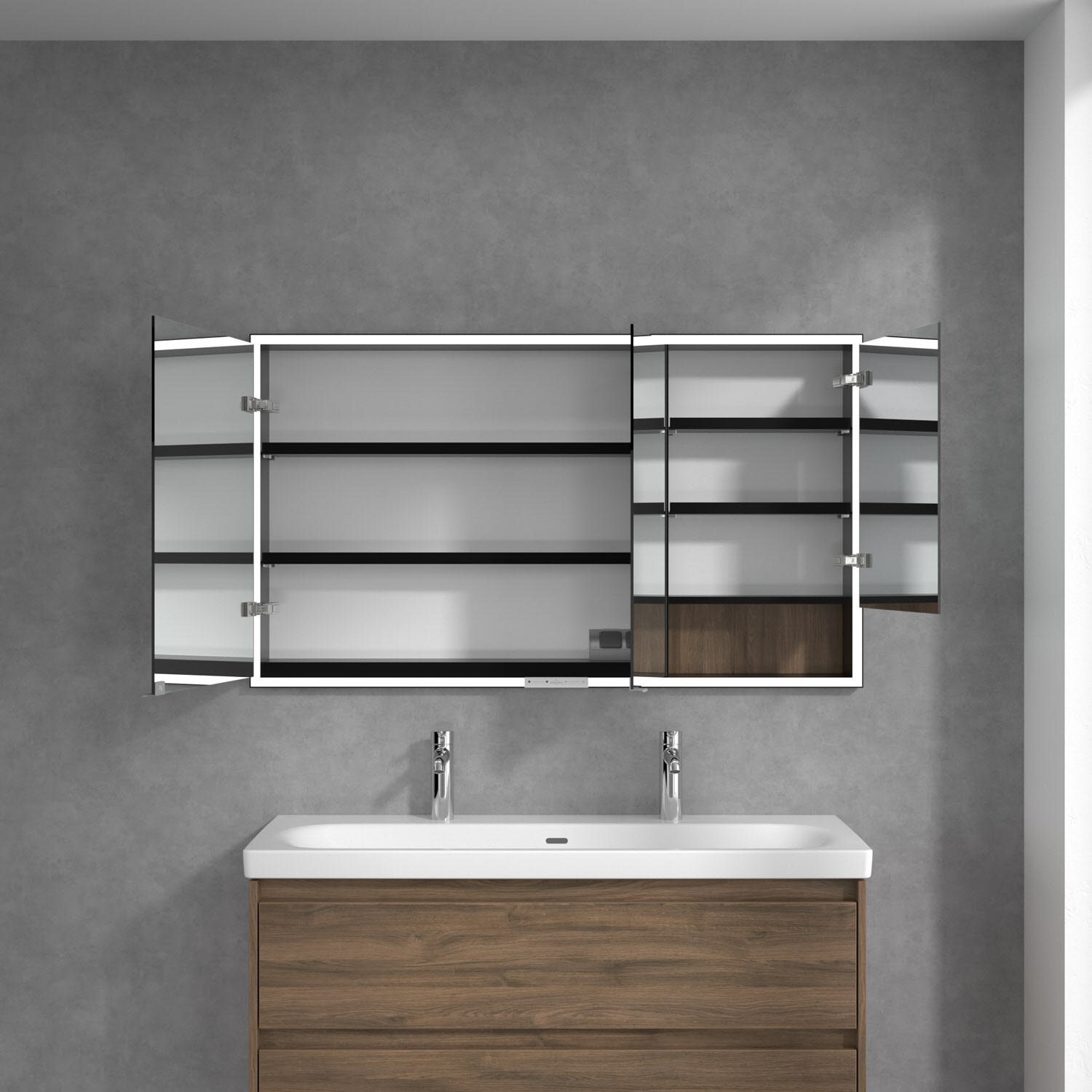Das umlaufende LED-Lichtband bietet eine gleichmäßige Ausleuchtung, die integrierte Waschtischbeleuchtung und die beleuchteten offenen Fächer schaffen ein stimmungsvolles Ambiente. Helligkeit und Farbtemperatur lassen sich bequem per Sensor oder Smart-Home-Steuerung einstellen. Filigrane Griffe ermöglichen ein bequemes Öffnen der Türen ohne Fingerabdrücke, eine innenliegende Doppelsteckdose bietet zusätzliche Funktionalität.