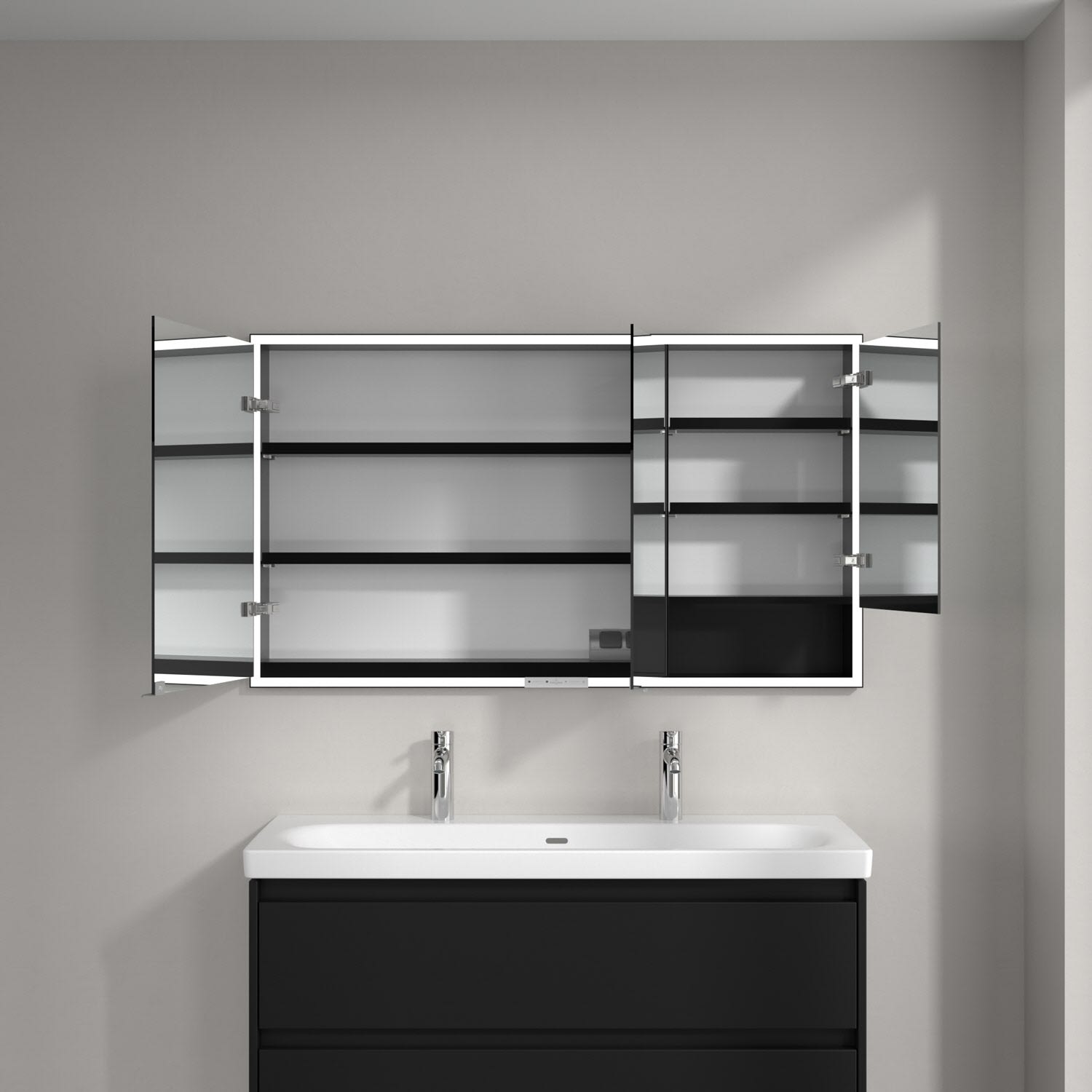 Das umlaufende LED-Lichtband bietet eine gleichmäßige Ausleuchtung, die integrierte Waschtischbeleuchtung und die beleuchteten offenen Fächer schaffen ein stimmungsvolles Ambiente. Helligkeit und Farbtemperatur lassen sich bequem per Sensor oder Smart-Home-Steuerung einstellen. Filigrane Griffe ermöglichen ein bequemes Öffnen der Türen ohne Fingerabdrücke, eine innenliegende Doppelsteckdose bietet zusätzliche Funktionalität.
