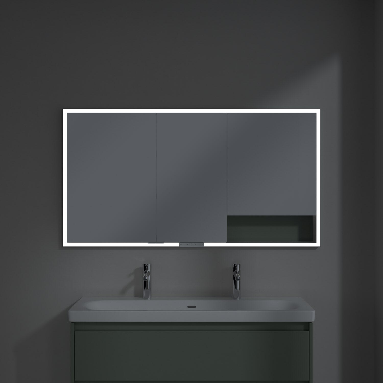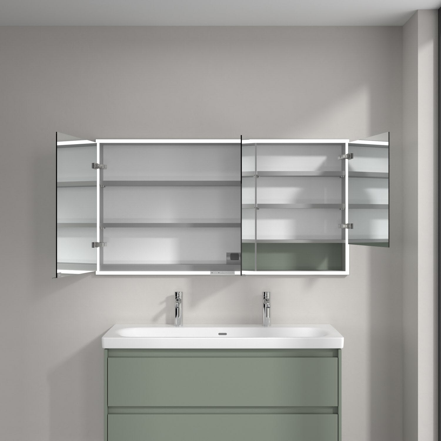 Das umlaufende LED-Lichtband bietet eine gleichmäßige Ausleuchtung, die integrierte Waschtischbeleuchtung und die beleuchteten offenen Fächer schaffen ein stimmungsvolles Ambiente. Helligkeit und Farbtemperatur lassen sich bequem per Sensor oder Smart-Home-Steuerung einstellen. Filigrane Griffe ermöglichen ein bequemes Öffnen der Türen ohne Fingerabdrücke, eine innenliegende Doppelsteckdose bietet zusätzliche Funktionalität.