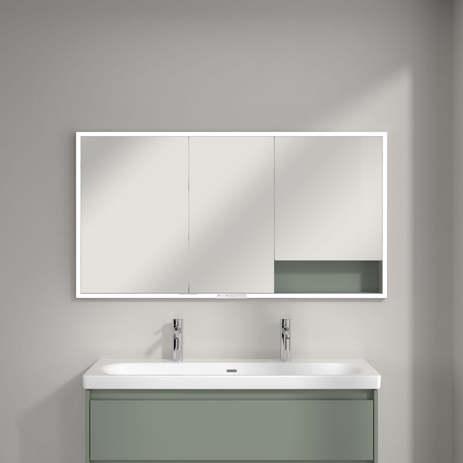 Durchdachtes Highlight für minimalistisches Baddesign - Der My View+ Einbau-Spiegelschrank von Villeroy & Boch bringt smarte Features und stilvolle Farbakzente ins Bad und setzt neue Maßstäbe: Mit geschlossenen und offenen Stauraumlösungen integriert er sich nahtlos in die Wand und sorgt für eine besonders elegante, minimalistische Optik. Die farbig gestaltete Rückwand sorgt für ein individuelles Farb- und Designstatement im Bad.