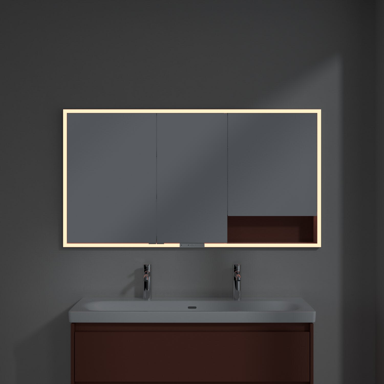 Das umlaufende LED-Lichtband bietet eine gleichmäßige Ausleuchtung, die integrierte Waschtischbeleuchtung und die beleuchteten offenen Fächer schaffen ein stimmungsvolles Ambiente. Helligkeit und Farbtemperatur lassen sich bequem per Sensor oder Smart-Home-Steuerung einstellen. Filigrane Griffe ermöglichen ein bequemes Öffnen der Türen ohne Fingerabdrücke, eine innenliegende Doppelsteckdose bietet zusätzliche Funktionalität.