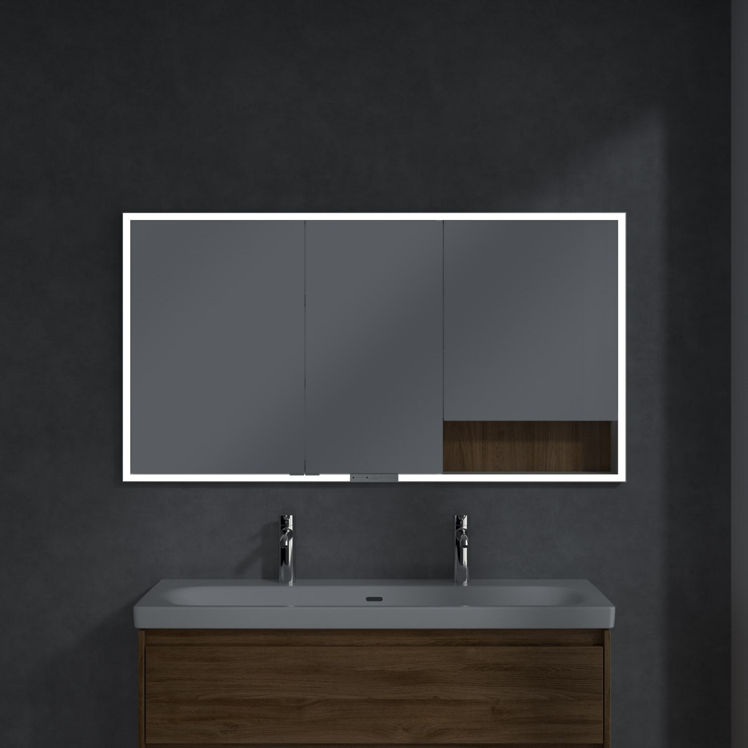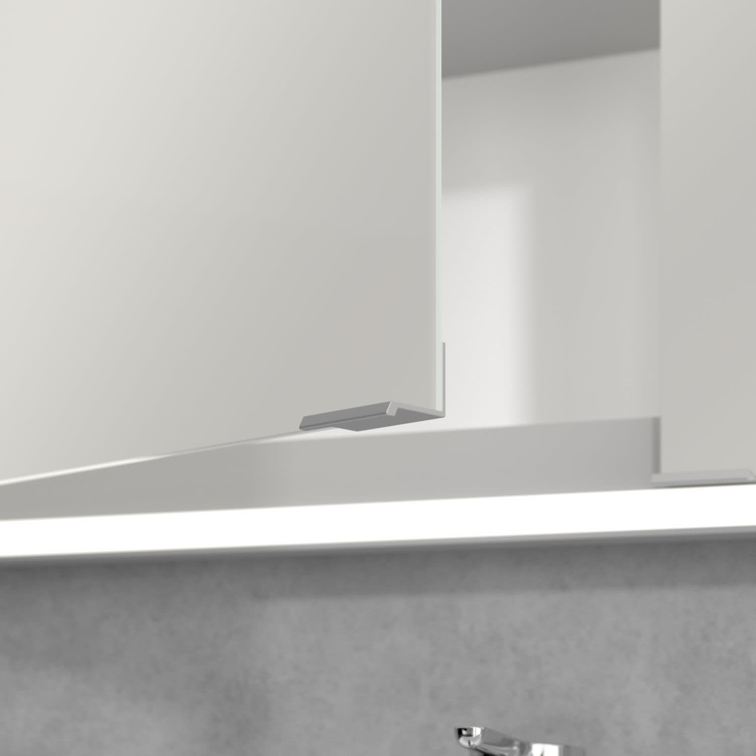 Das umlaufende LED-Lichtband bietet eine gleichmäßige Ausleuchtung, die integrierte Waschtischbeleuchtung und die beleuchteten offenen Fächer schaffen ein stimmungsvolles Ambiente. Helligkeit und Farbtemperatur lassen sich bequem per Sensor oder Smart-Home-Steuerung einstellen. Filigrane Griffe ermöglichen ein bequemes Öffnen der Türen ohne Fingerabdrücke, eine innenliegende Doppelsteckdose bietet zusätzliche Funktionalität.