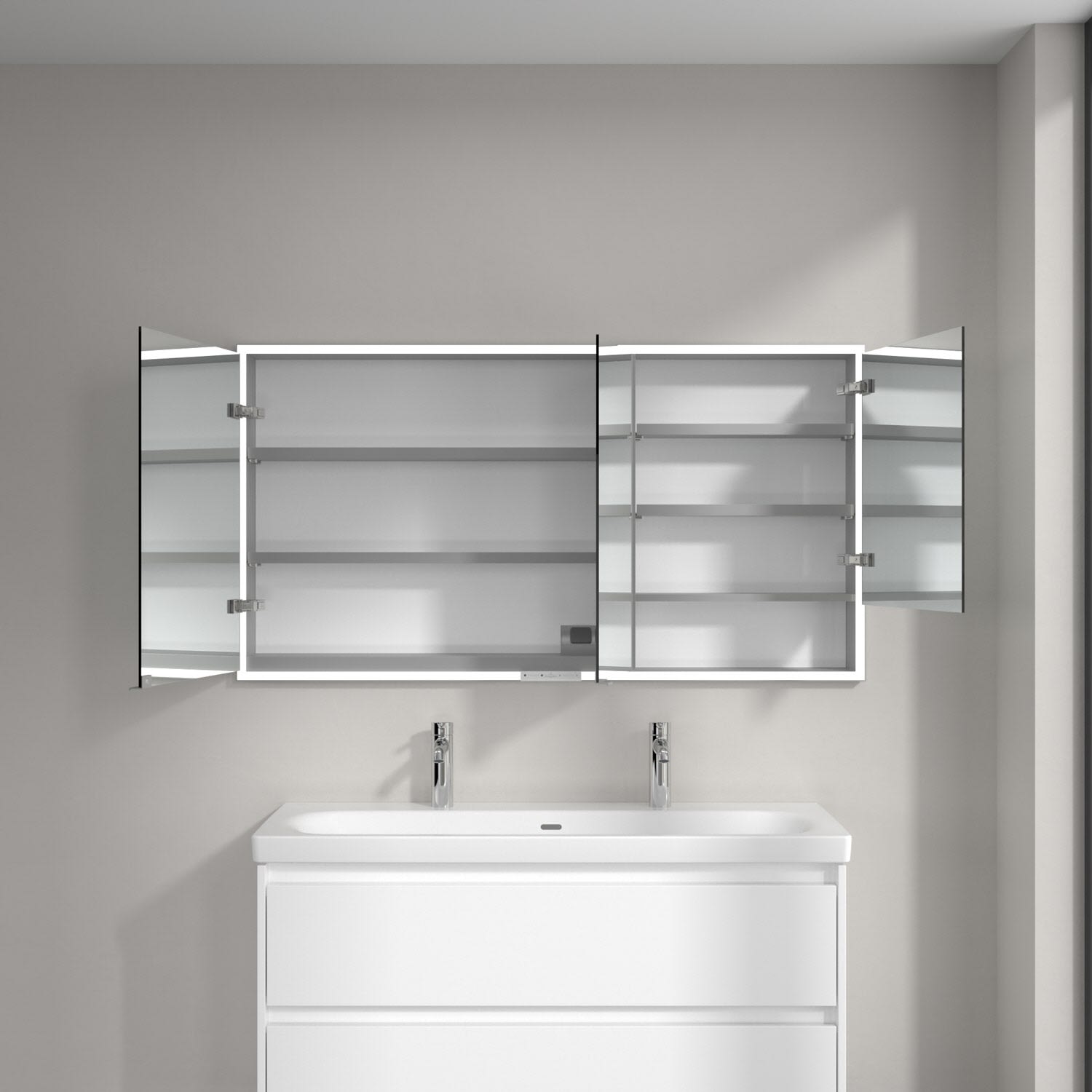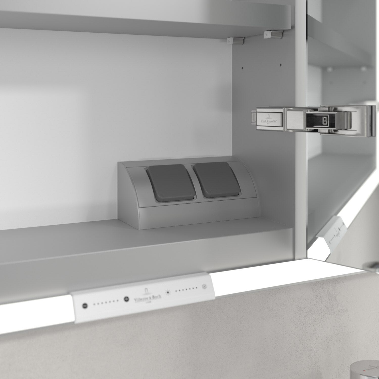 Das umlaufende LED-Lichtband bietet eine gleichmäßige Ausleuchtung, die integrierte Waschtischbeleuchtung und die beleuchteten offenen Fächer schaffen ein stimmungsvolles Ambiente. Helligkeit und Farbtemperatur lassen sich bequem per Sensor oder Smart-Home-Steuerung einstellen. Filigrane Griffe ermöglichen ein bequemes Öffnen der Türen ohne Fingerabdrücke, eine innenliegende Doppelsteckdose bietet zusätzliche Funktionalität.