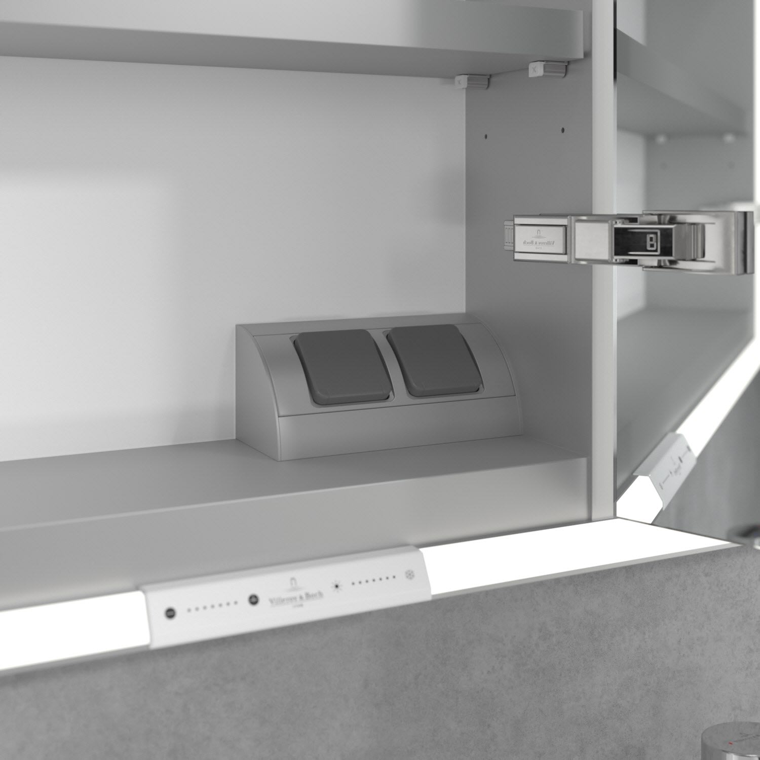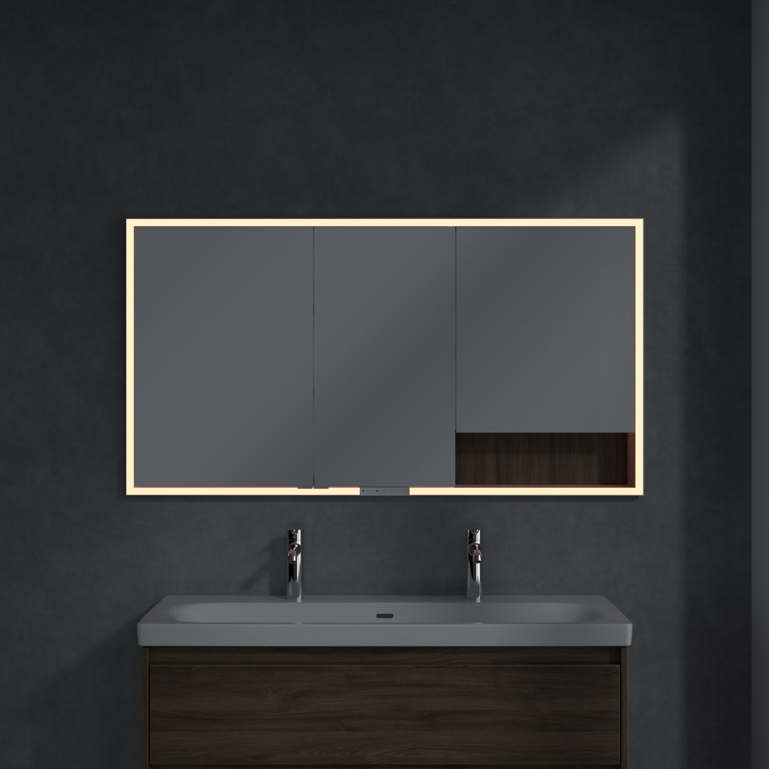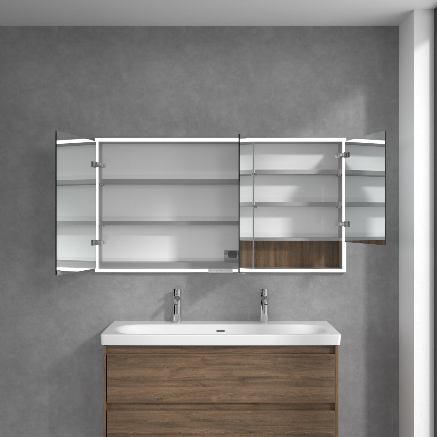 Das umlaufende LED-Lichtband bietet eine gleichmäßige Ausleuchtung, die integrierte Waschtischbeleuchtung und die beleuchteten offenen Fächer schaffen ein stimmungsvolles Ambiente. Helligkeit und Farbtemperatur lassen sich bequem per Sensor oder Smart-Home-Steuerung einstellen. Filigrane Griffe ermöglichen ein bequemes Öffnen der Türen ohne Fingerabdrücke, eine innenliegende Doppelsteckdose bietet zusätzliche Funktionalität.