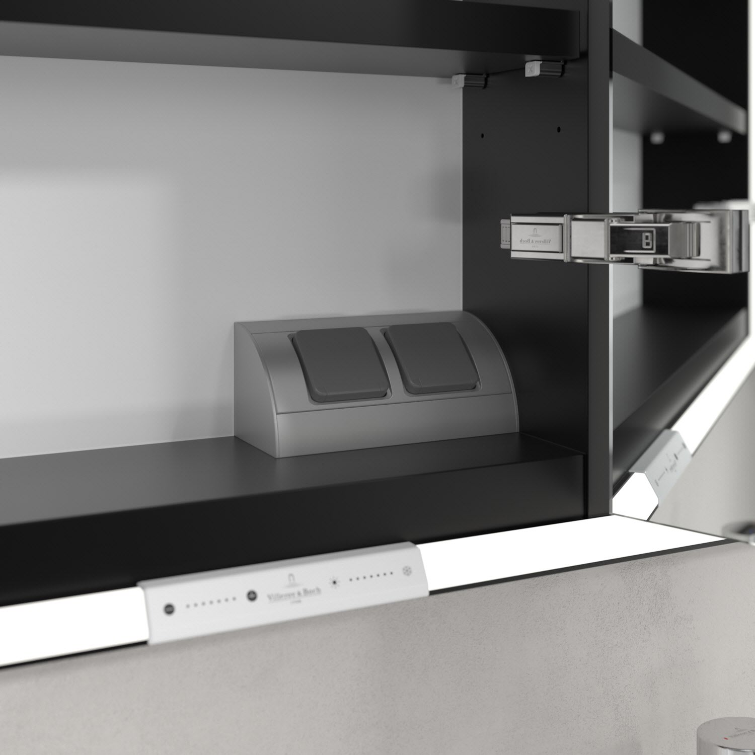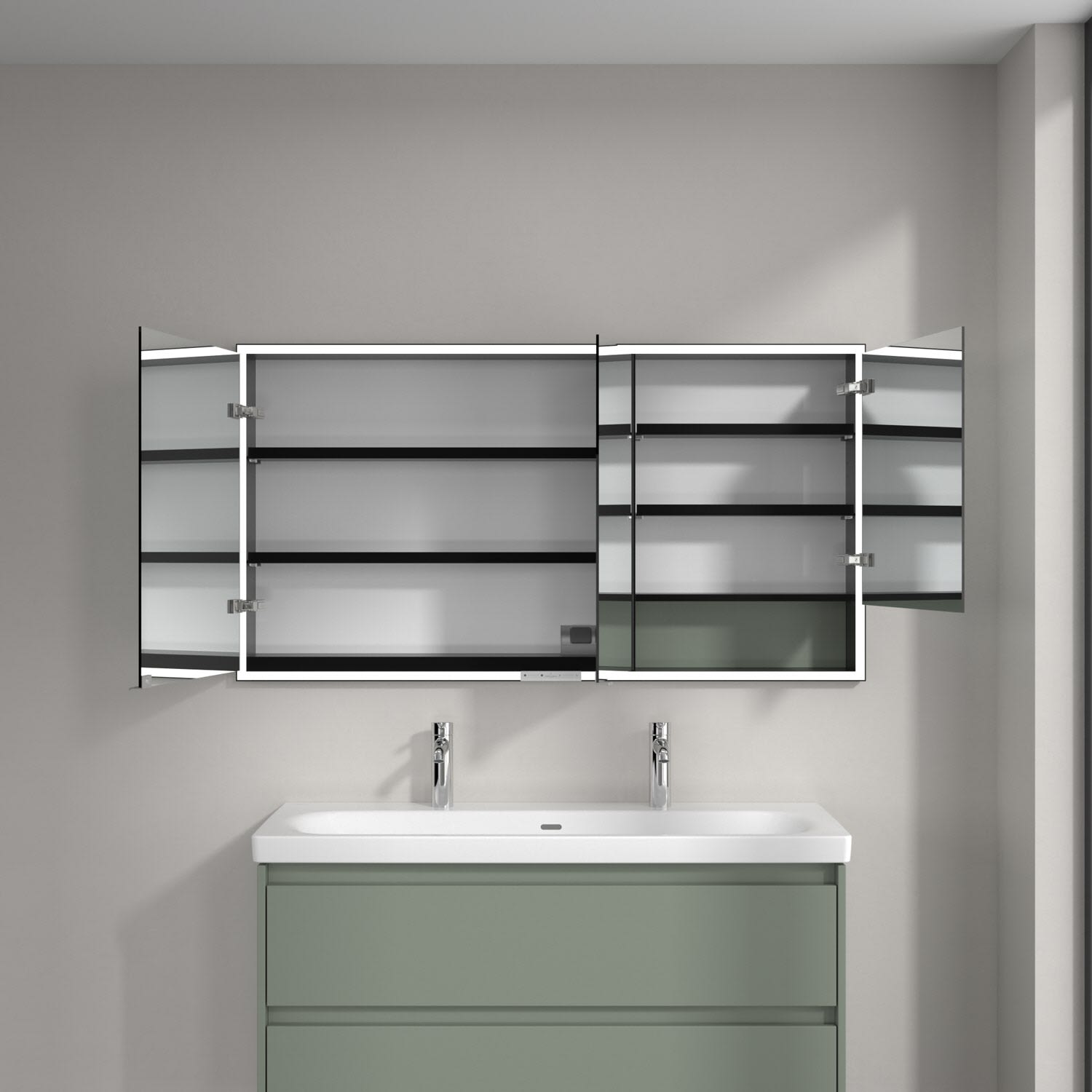 Das umlaufende LED-Lichtband bietet eine gleichmäßige Ausleuchtung, die integrierte Waschtischbeleuchtung und die beleuchteten offenen Fächer schaffen ein stimmungsvolles Ambiente. Helligkeit und Farbtemperatur lassen sich bequem per Sensor oder Smart-Home-Steuerung einstellen. Filigrane Griffe ermöglichen ein bequemes Öffnen der Türen ohne Fingerabdrücke, eine innenliegende Doppelsteckdose bietet zusätzliche Funktionalität.