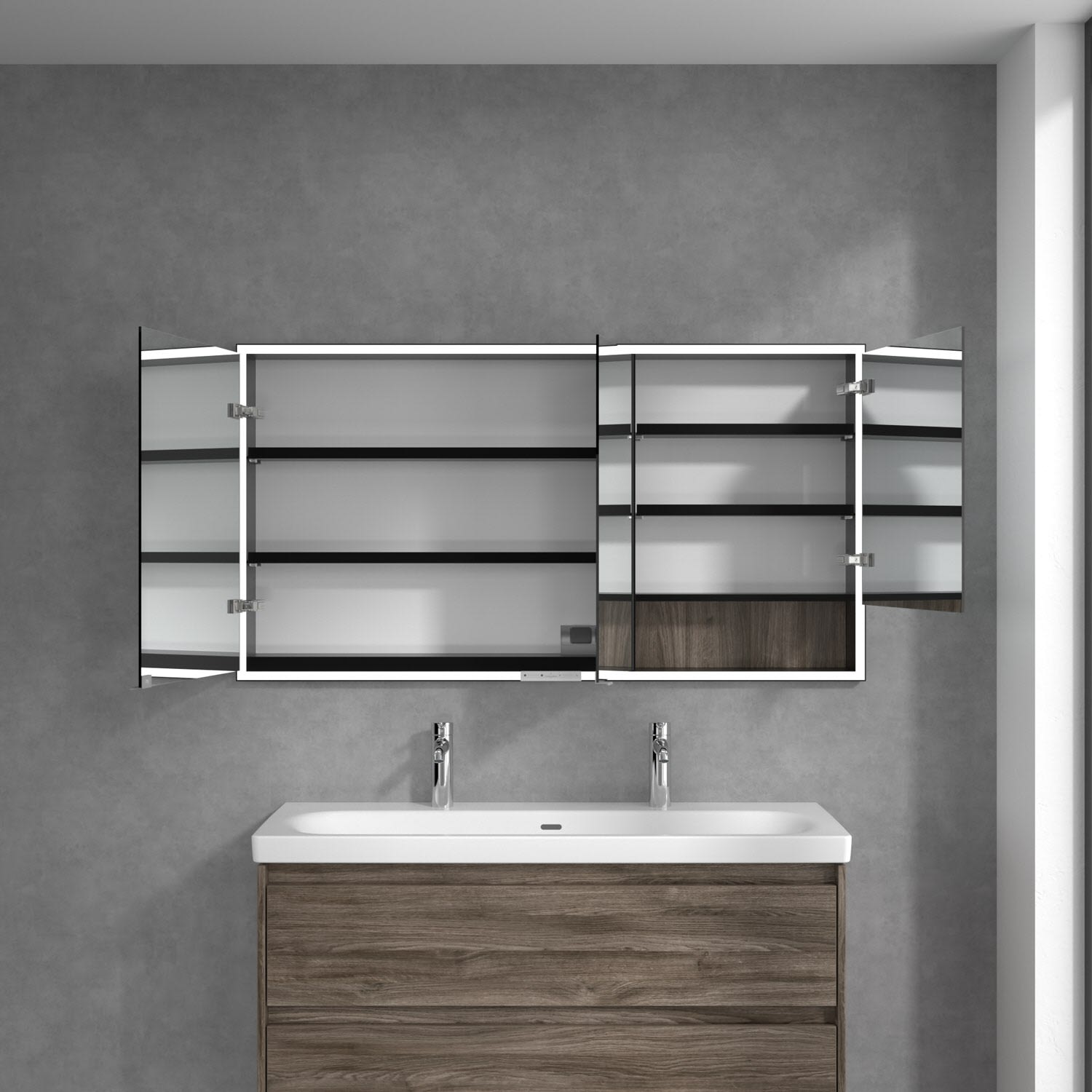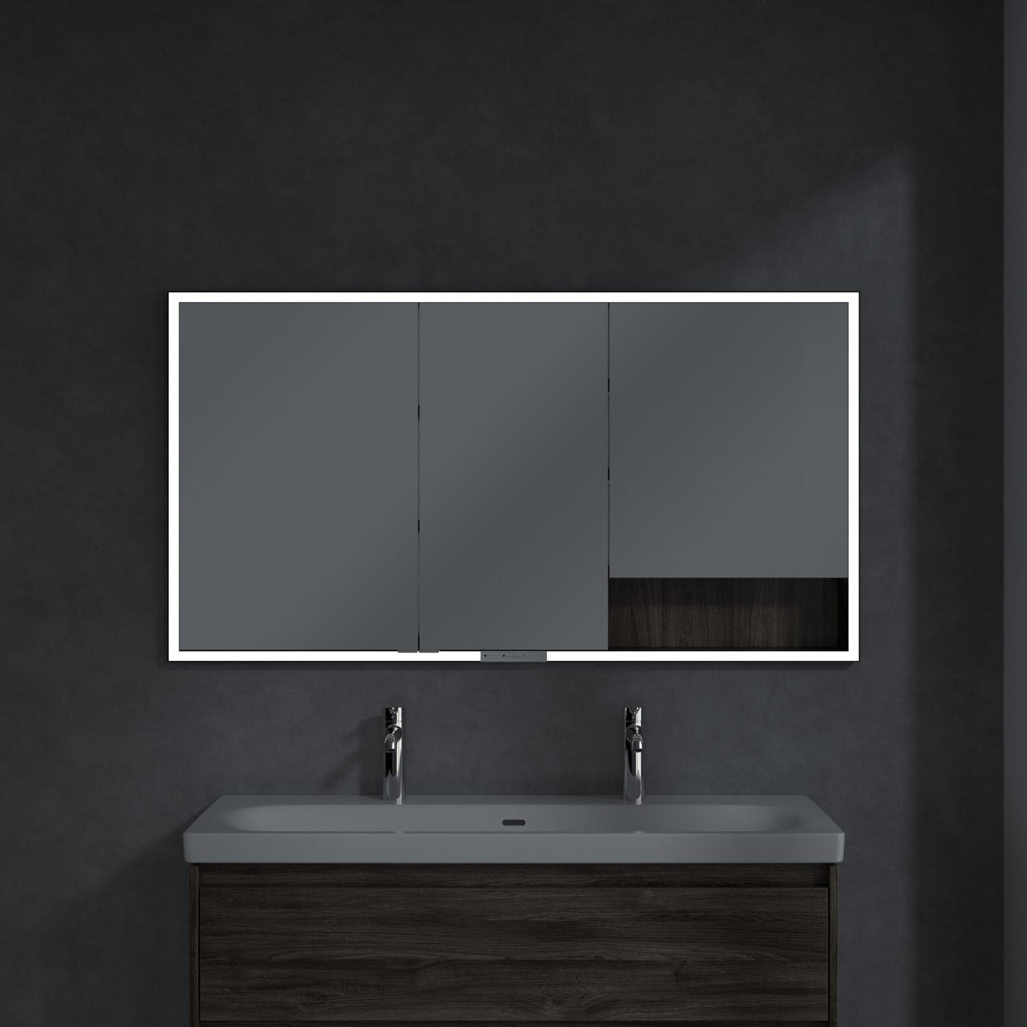 Das umlaufende LED-Lichtband bietet eine gleichmäßige Ausleuchtung, die integrierte Waschtischbeleuchtung und die beleuchteten offenen Fächer schaffen ein stimmungsvolles Ambiente. Helligkeit und Farbtemperatur lassen sich bequem per Sensor oder Smart-Home-Steuerung einstellen. Filigrane Griffe ermöglichen ein bequemes Öffnen der Türen ohne Fingerabdrücke, eine innenliegende Doppelsteckdose bietet zusätzliche Funktionalität.