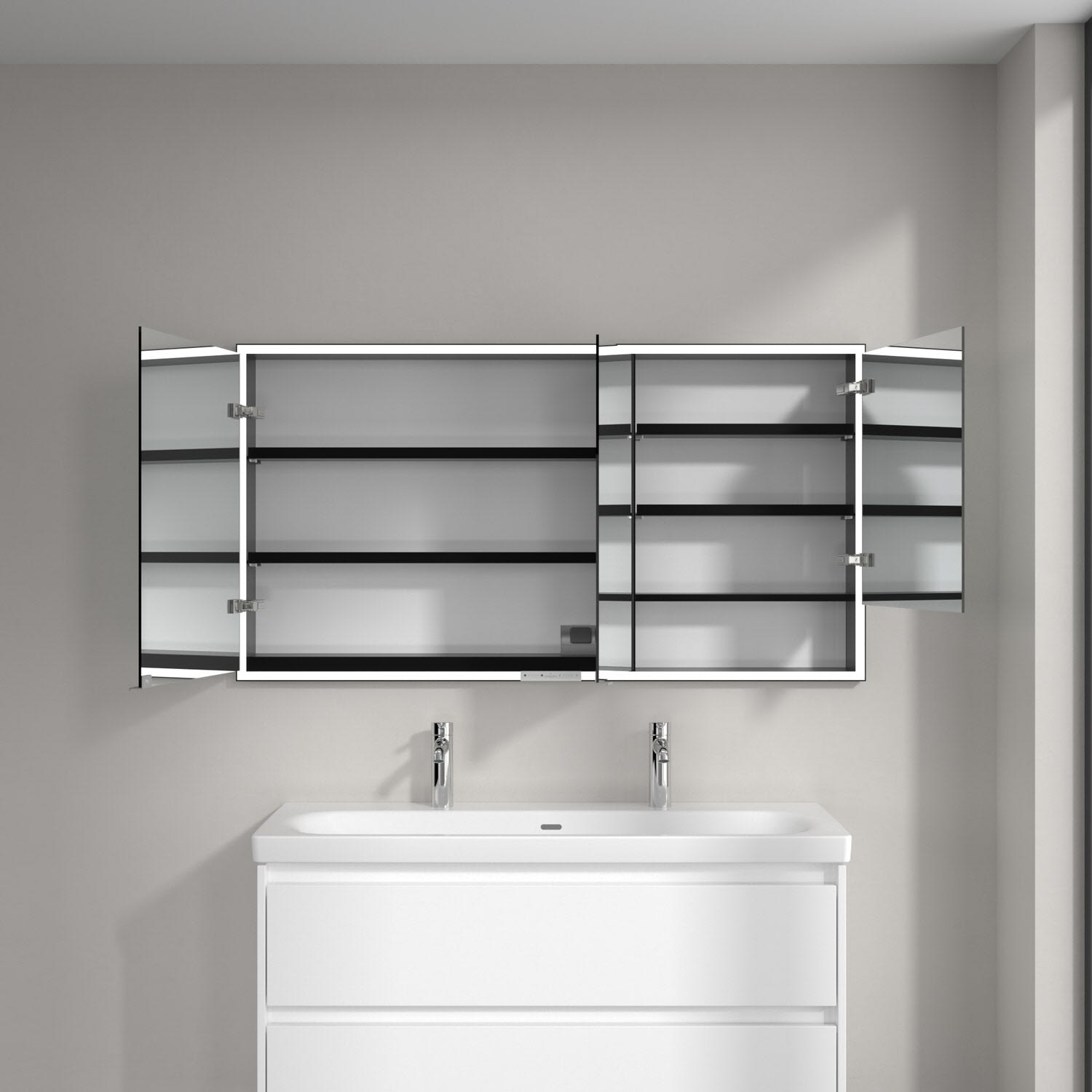 Das umlaufende LED-Lichtband bietet eine gleichmäßige Ausleuchtung, die integrierte Waschtischbeleuchtung und die beleuchteten offenen Fächer schaffen ein stimmungsvolles Ambiente. Helligkeit und Farbtemperatur lassen sich bequem per Sensor oder Smart-Home-Steuerung einstellen. Filigrane Griffe ermöglichen ein bequemes Öffnen der Türen ohne Fingerabdrücke, eine innenliegende Doppelsteckdose bietet zusätzliche Funktionalität.