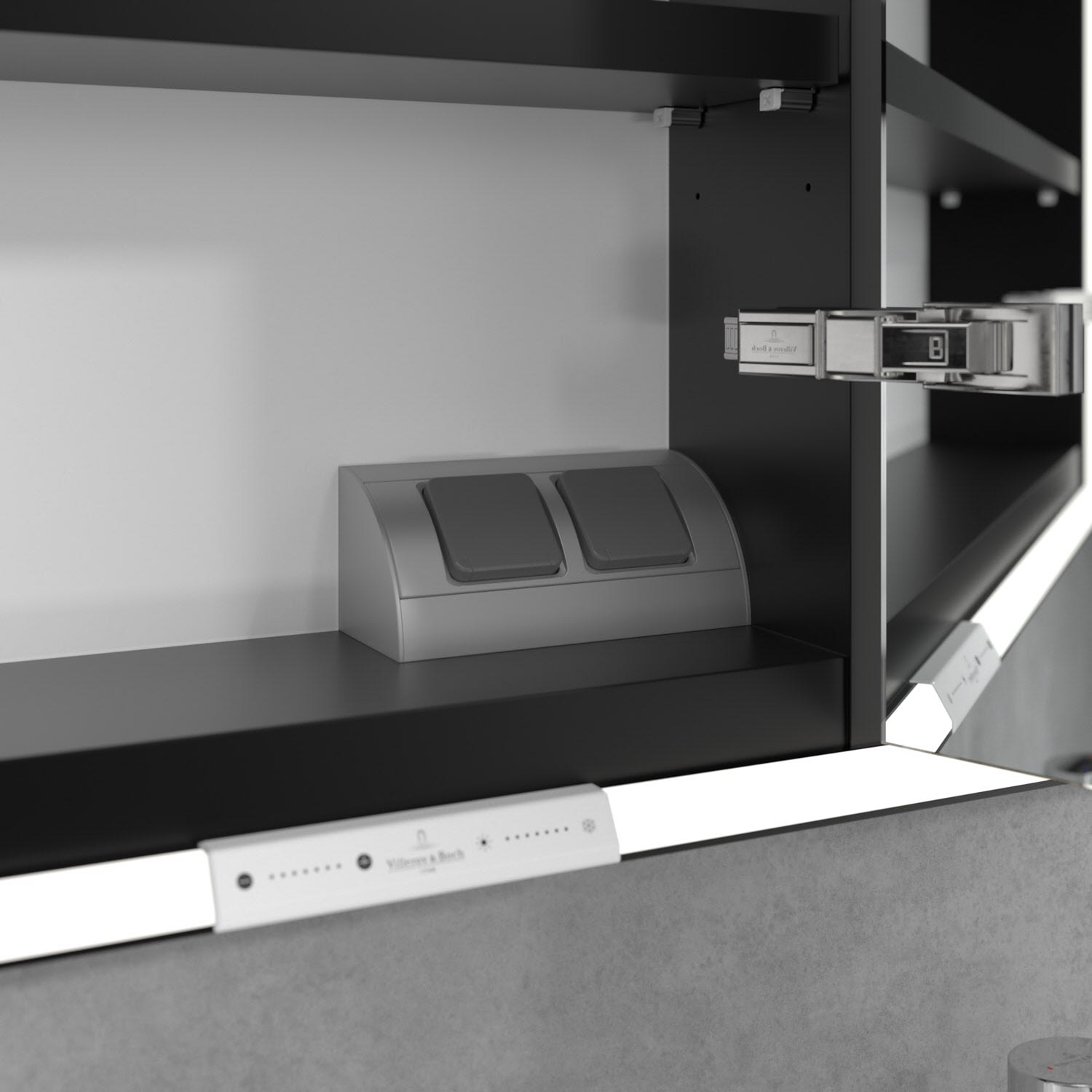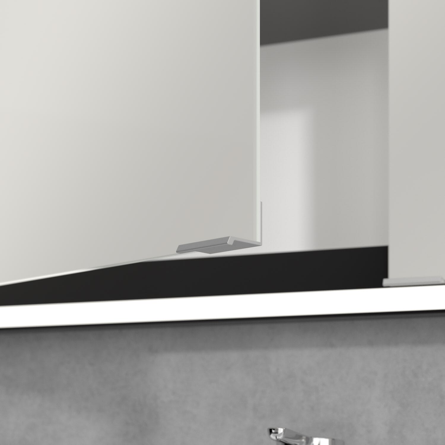 Das umlaufende LED-Lichtband bietet eine gleichmäßige Ausleuchtung, die integrierte Waschtischbeleuchtung und die beleuchteten offenen Fächer schaffen ein stimmungsvolles Ambiente. Helligkeit und Farbtemperatur lassen sich bequem per Sensor oder Smart-Home-Steuerung einstellen. Filigrane Griffe ermöglichen ein bequemes Öffnen der Türen ohne Fingerabdrücke, eine innenliegende Doppelsteckdose bietet zusätzliche Funktionalität.
