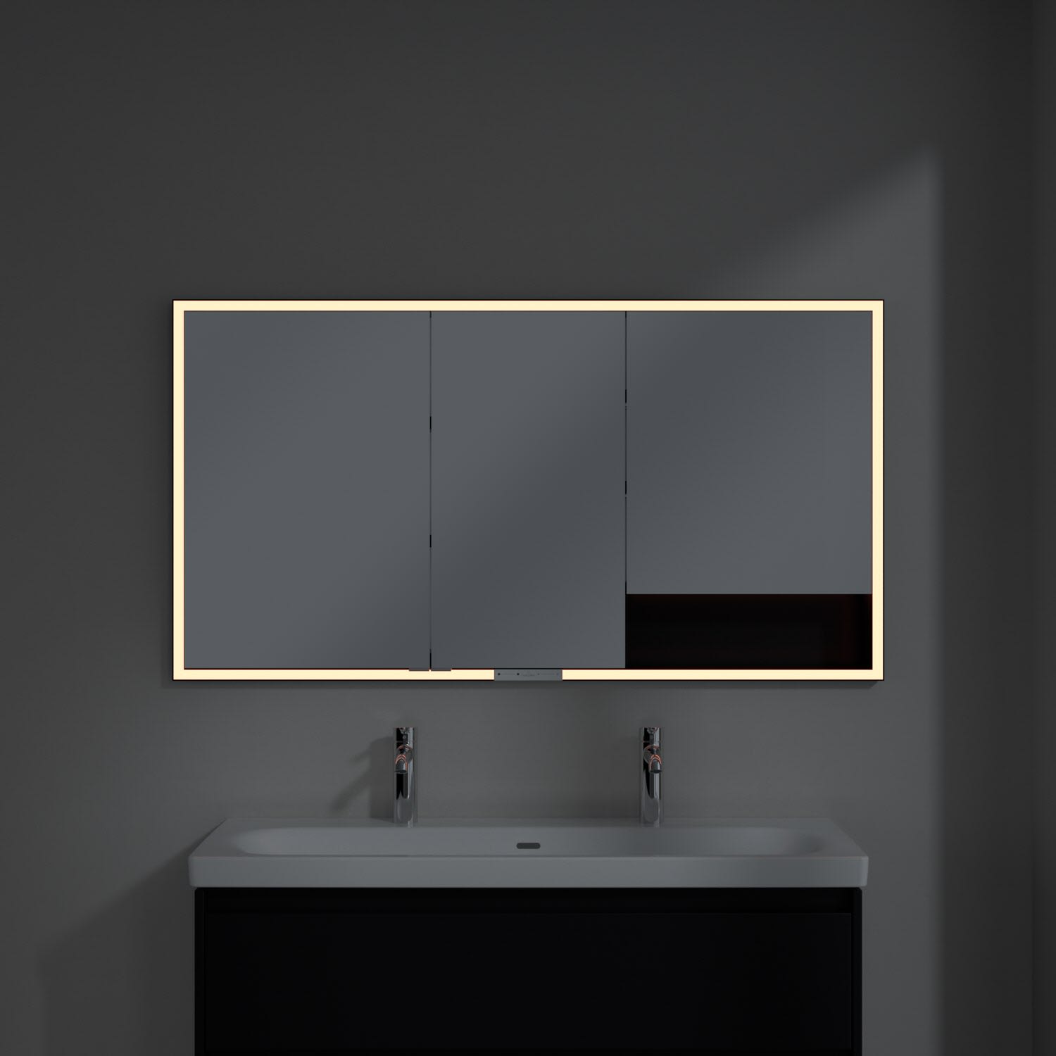 Das umlaufende LED-Lichtband bietet eine gleichmäßige Ausleuchtung, die integrierte Waschtischbeleuchtung und die beleuchteten offenen Fächer schaffen ein stimmungsvolles Ambiente. Helligkeit und Farbtemperatur lassen sich bequem per Sensor oder Smart-Home-Steuerung einstellen. Filigrane Griffe ermöglichen ein bequemes Öffnen der Türen ohne Fingerabdrücke, eine innenliegende Doppelsteckdose bietet zusätzliche Funktionalität.