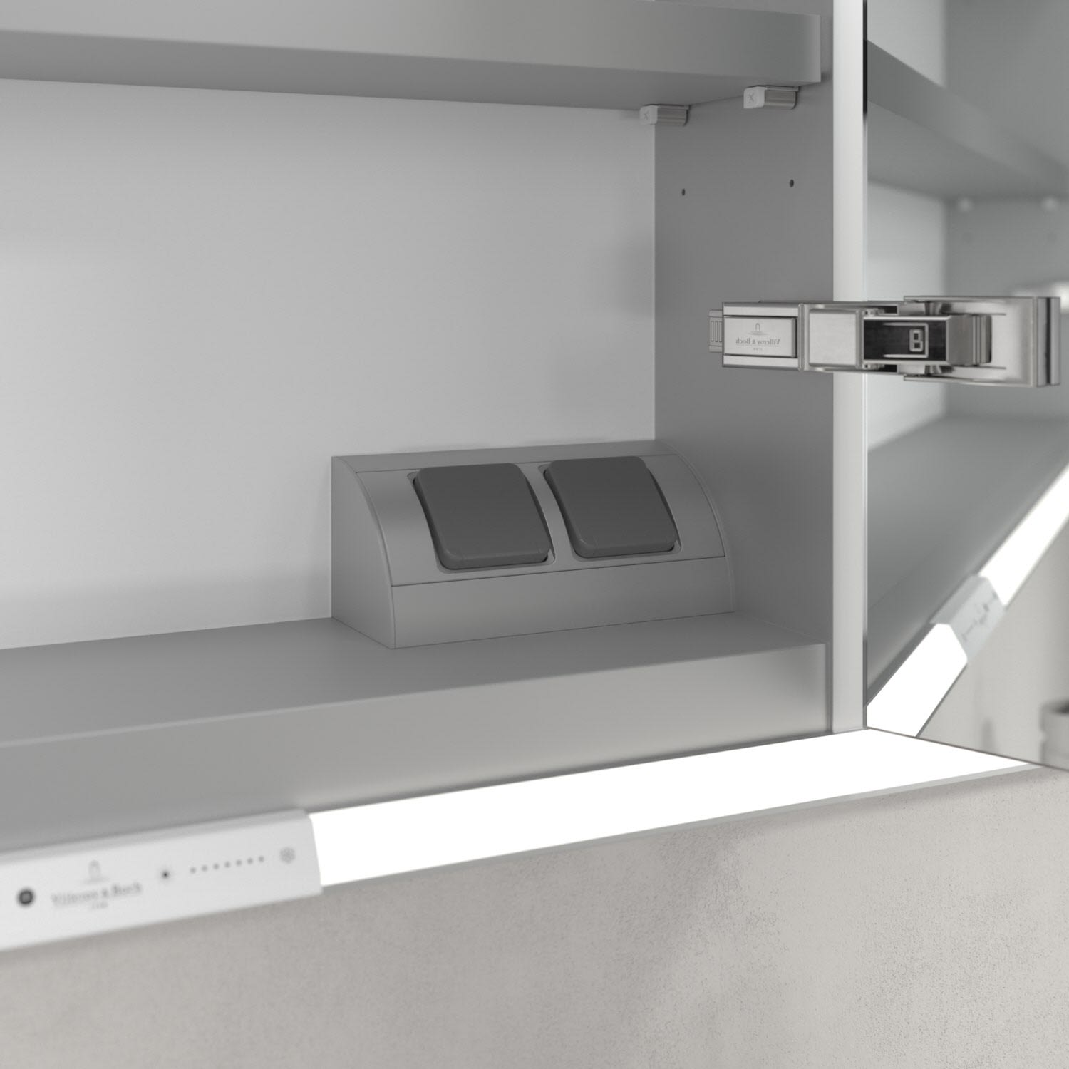 Das umlaufende LED-Lichtband bietet eine gleichmäßige Ausleuchtung, die integrierte Waschtischbeleuchtung und die beleuchteten offenen Fächer schaffen ein stimmungsvolles Ambiente. Helligkeit und Farbtemperatur lassen sich bequem per Sensor oder Smart-Home-Steuerung einstellen. Filigrane Griffe ermöglichen ein bequemes Öffnen der Türen ohne Fingerabdrücke, eine innenliegende Doppelsteckdose bietet zusätzliche Funktionalität.