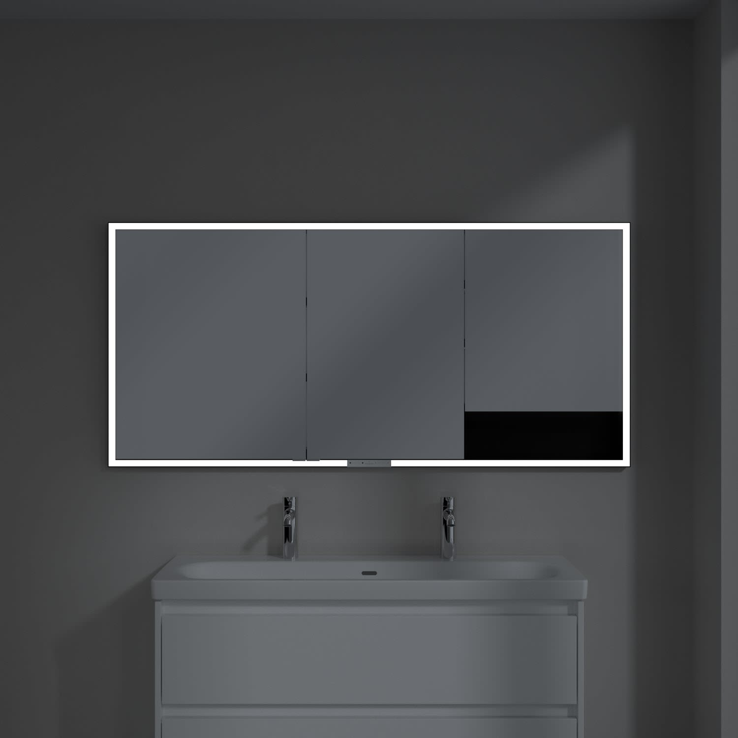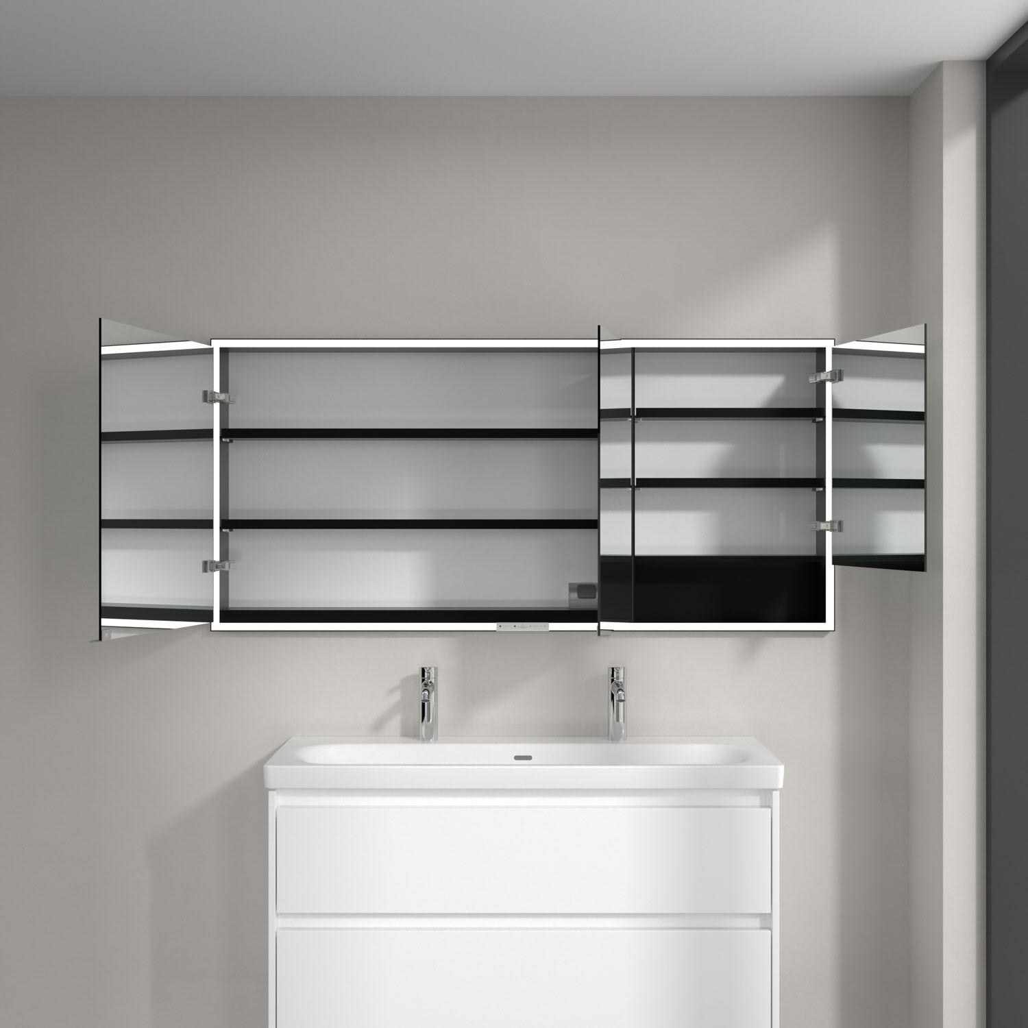 Das umlaufende LED-Lichtband bietet eine gleichmäßige Ausleuchtung, die integrierte Waschtischbeleuchtung und die beleuchteten offenen Fächer schaffen ein stimmungsvolles Ambiente. Helligkeit und Farbtemperatur lassen sich bequem per Sensor oder Smart-Home-Steuerung einstellen. Filigrane Griffe ermöglichen ein bequemes Öffnen der Türen ohne Fingerabdrücke, eine innenliegende Doppelsteckdose bietet zusätzliche Funktionalität.