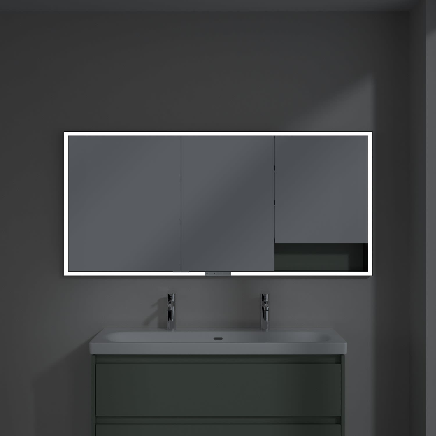 Das umlaufende LED-Lichtband bietet eine gleichmäßige Ausleuchtung, die integrierte Waschtischbeleuchtung und die beleuchteten offenen Fächer schaffen ein stimmungsvolles Ambiente. Helligkeit und Farbtemperatur lassen sich bequem per Sensor oder Smart-Home-Steuerung einstellen. Filigrane Griffe ermöglichen ein bequemes Öffnen der Türen ohne Fingerabdrücke, eine innenliegende Doppelsteckdose bietet zusätzliche Funktionalität.