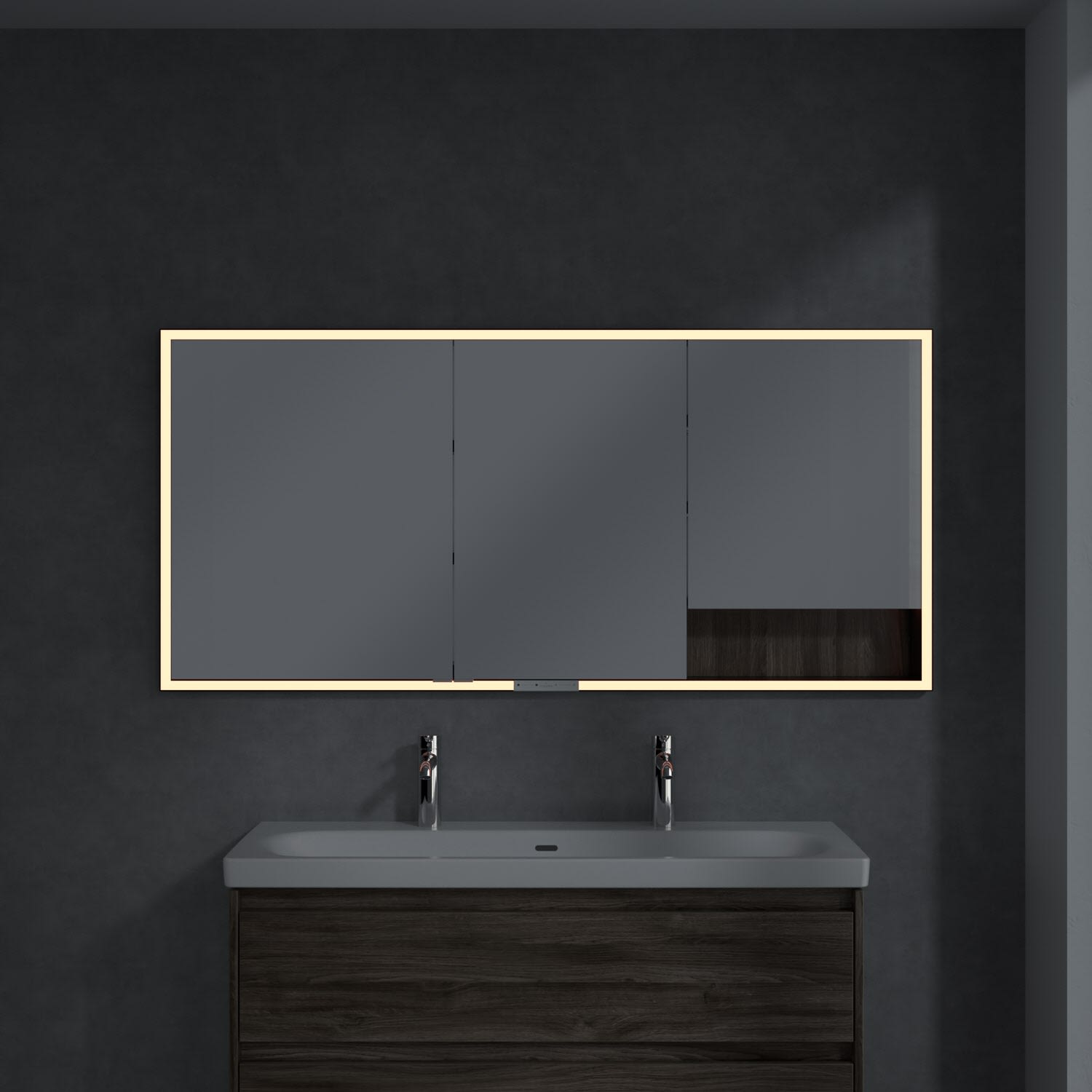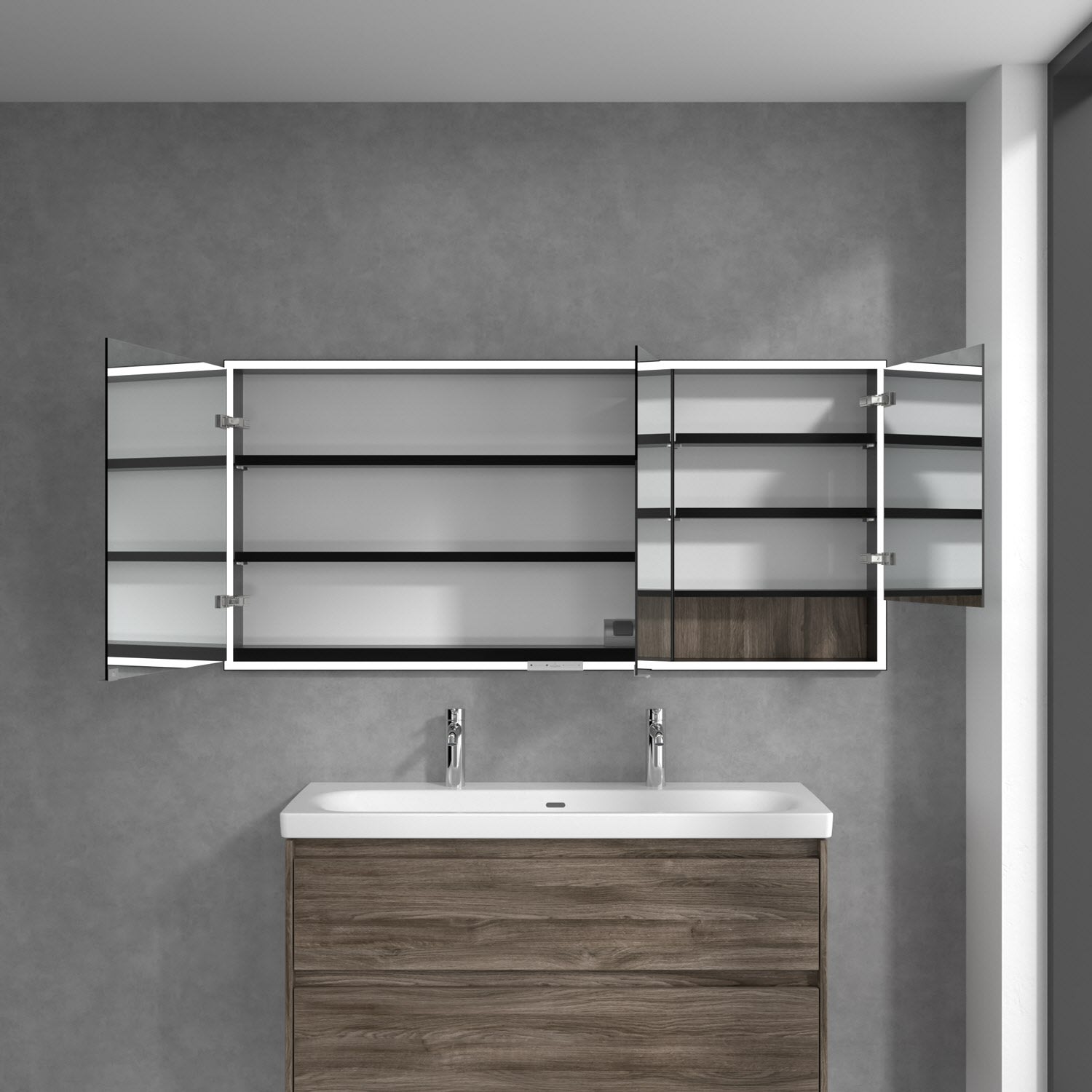 Das umlaufende LED-Lichtband bietet eine gleichmäßige Ausleuchtung, die integrierte Waschtischbeleuchtung und die beleuchteten offenen Fächer schaffen ein stimmungsvolles Ambiente. Helligkeit und Farbtemperatur lassen sich bequem per Sensor oder Smart-Home-Steuerung einstellen. Filigrane Griffe ermöglichen ein bequemes Öffnen der Türen ohne Fingerabdrücke, eine innenliegende Doppelsteckdose bietet zusätzliche Funktionalität.